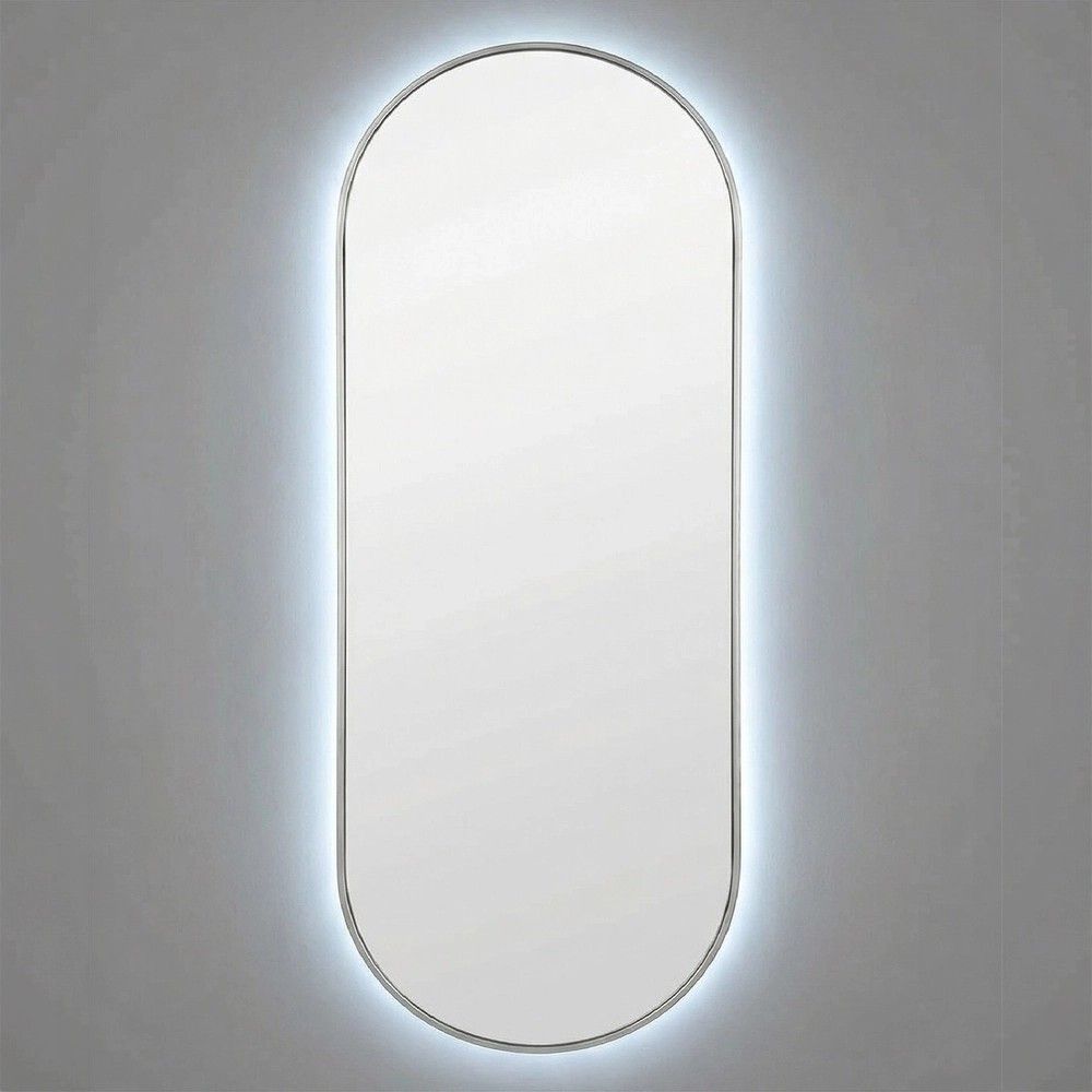 Овальная форма «капсула» смягчает строгую геометрию. Нет острых углов — нет визуального давления. Такое зеркало не конфликтует с интерьером, а дополняет его.