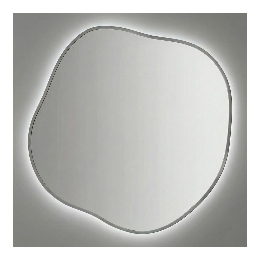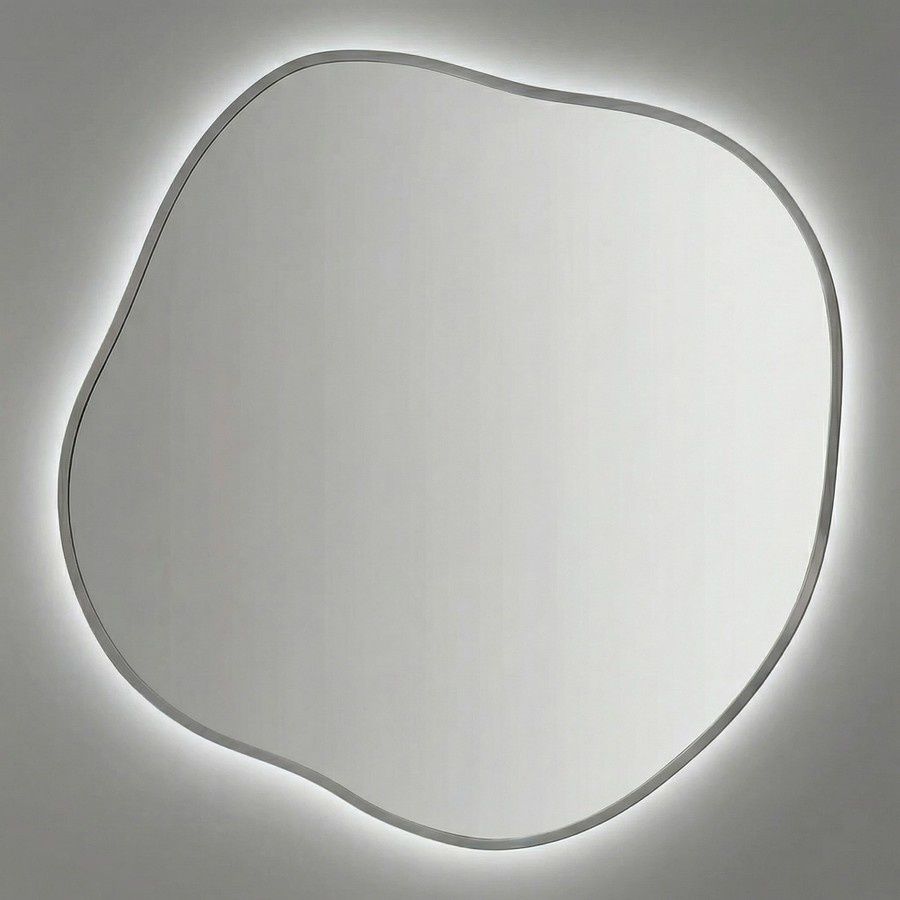 Размер: диаметр 91 см. Форма: фигурная (органическая, неправильный круг). Рама: дерево, серебро матовое. Фацет: нет. Зеркало: влагостойкое, серебряное. Навеска: универсальная. Подсветка: LED COB, 12V, 3000K/4000K/6000K на выбор. Защита: IP67.