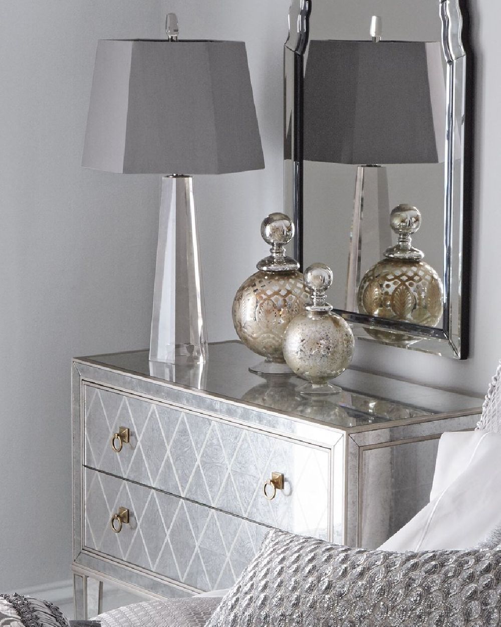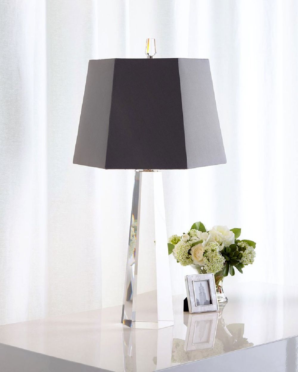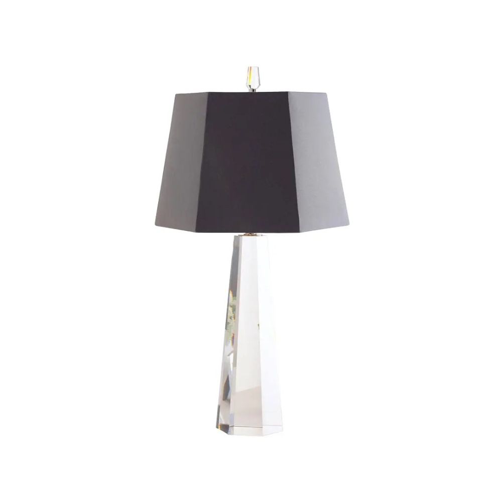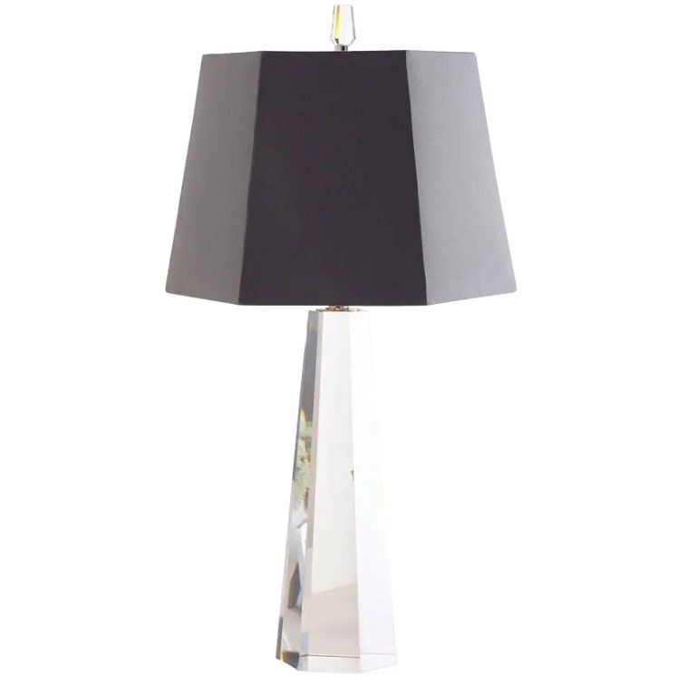 Настольная лампа с хрустальным геометрическим основанием в виде сужающегося к верху кристалла и чёрным абажуром в виде многогранника, прекрасно подойдёт для любых зон отдыха.