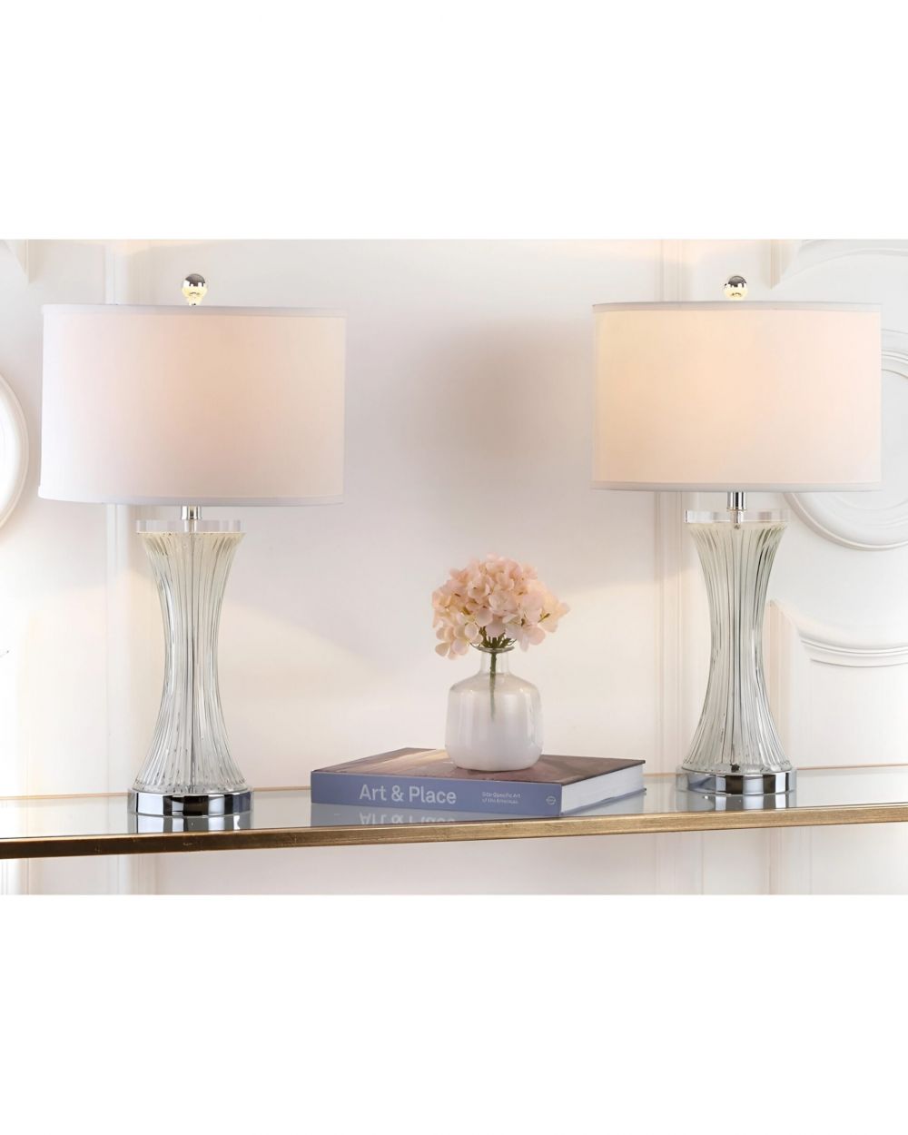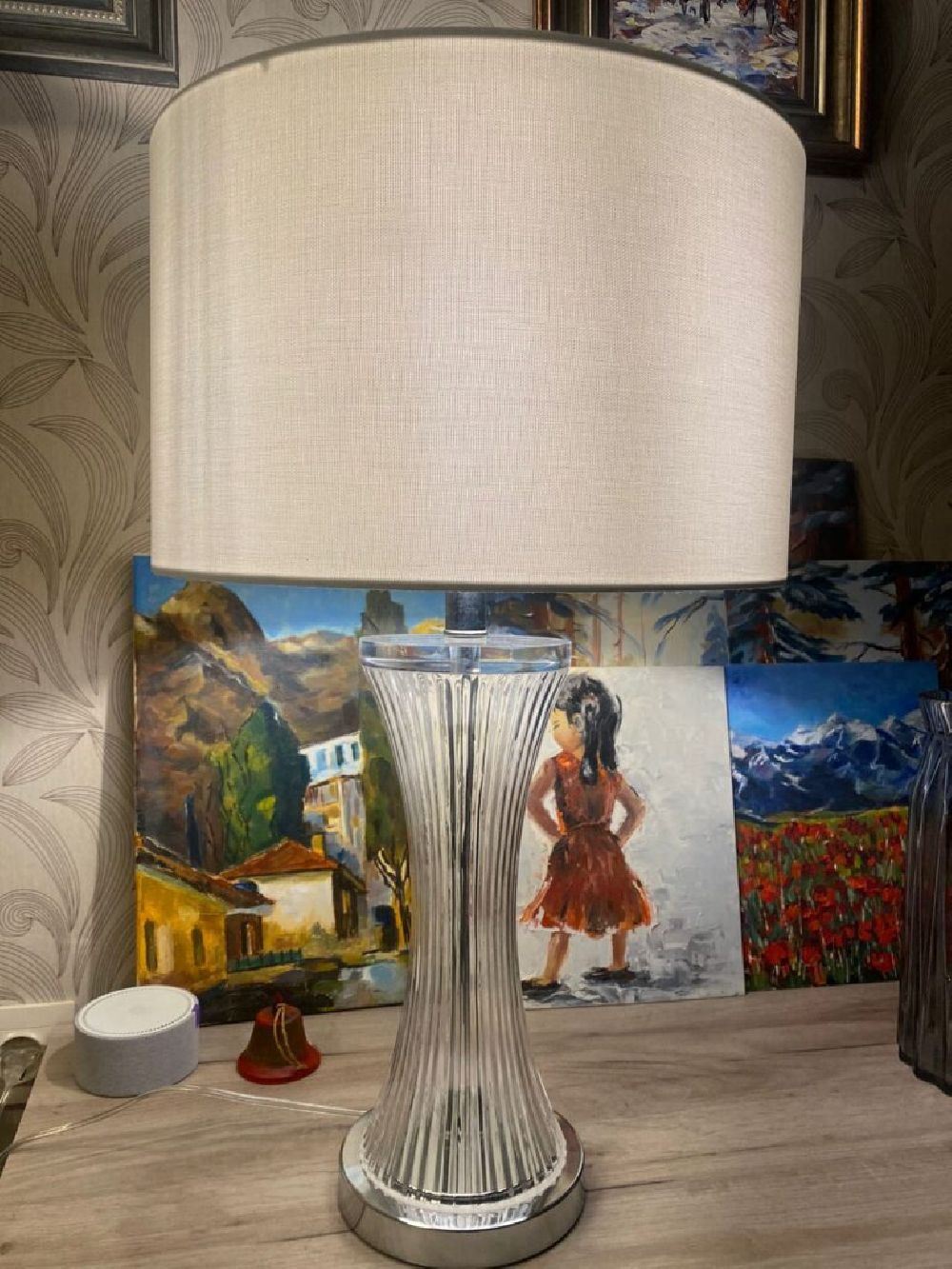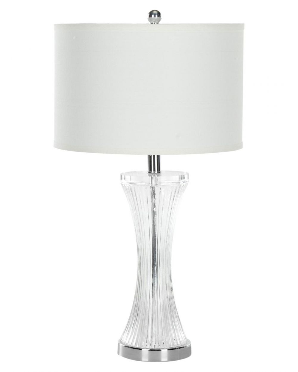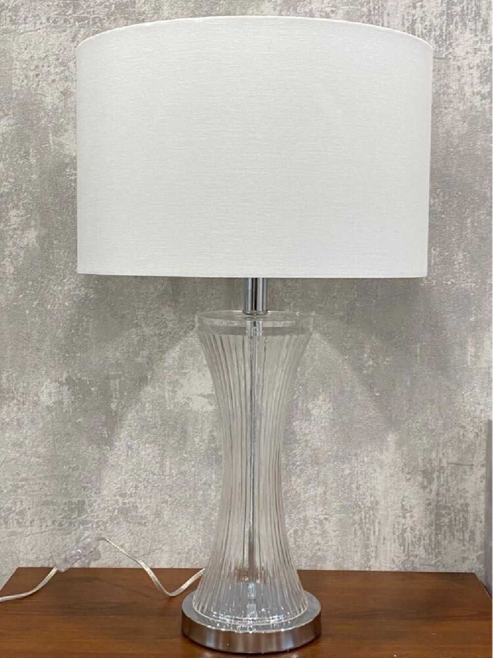 Элегантный дизайн: Основание из прозрачного рифленого стекла в форме песочных часов и белый хлопковый абажур-цилиндр создают сбалансированный и визуально легкий силуэт, который украсит любой современный интерьер .