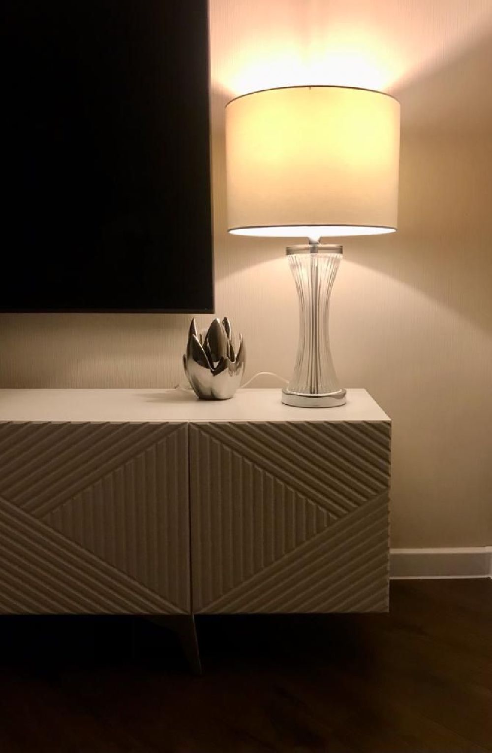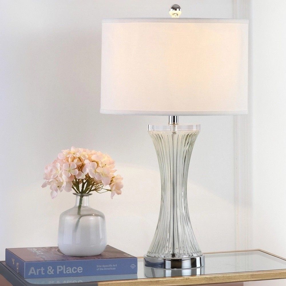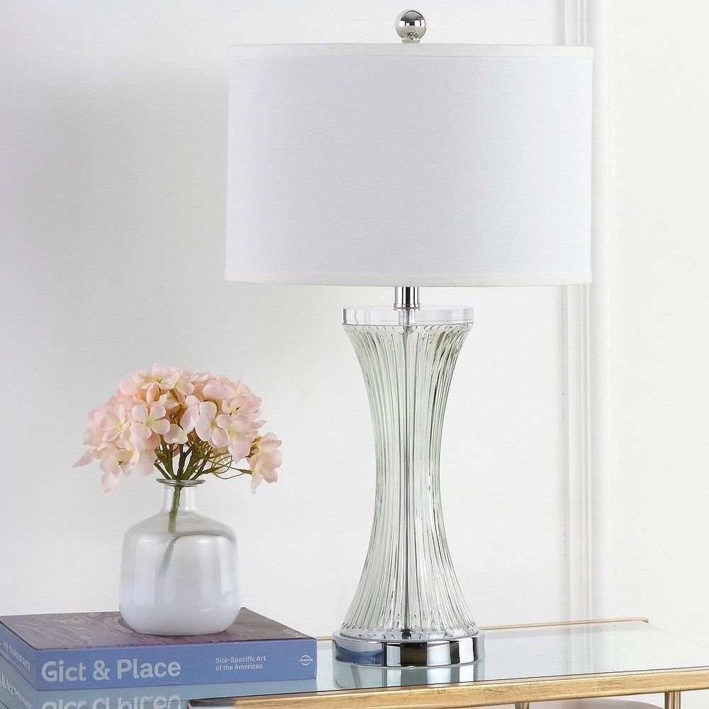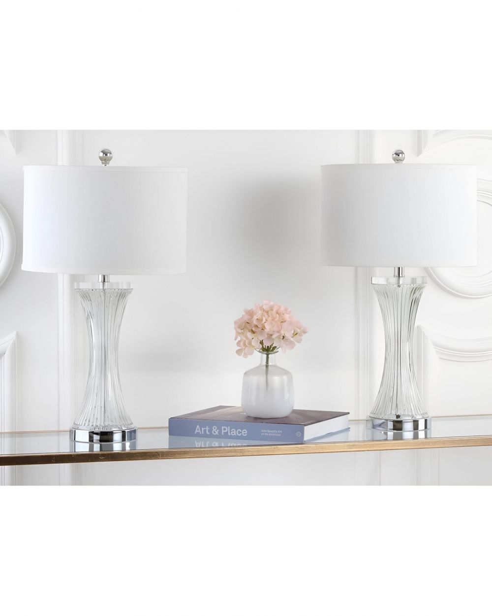Элегантный дизайн: Основание из прозрачного рифленого стекла в форме песочных часов и белый хлопковый абажур-цилиндр создают сбалансированный и визуально легкий силуэт, который украсит любой современный интерьер .
