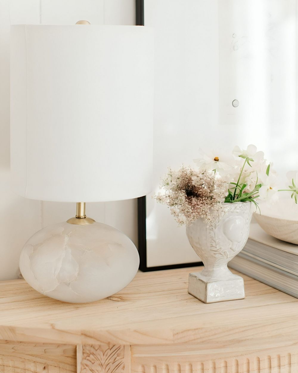 Настольная лампа “Помпеи” – это естественная текстура и форма в виде шара, которые придают ей неповторимый вид, привлекая к себе внимание и создавая приятную атмосферу. Основание лампы выполнено в карамельных и мягких серых тонах, которые прекрасно сочетаются друг с другом. Оно изготовлено из натурального камня – алебастр. Каждая лампа имеет свою индивидуальность и неповторимость, что делает ее особенной и эксклюзивной. Мягкое и безмятежное сияние света, рассеиваемое белым хлопковым абажуром, создает приятную атмосферу и расслабляющую обстановку. Лампа “Помпеи” подходит для комнаты любого стиля – от классического до современного. Она идеально дополнит шикарную тумбочку в спальне или станет изысканным украшением роскошного уголка для чтения в гостиной.