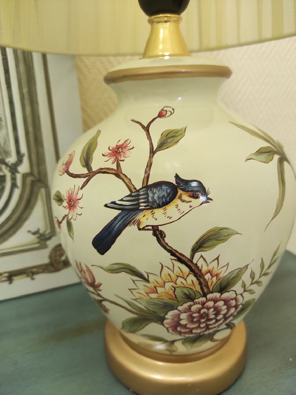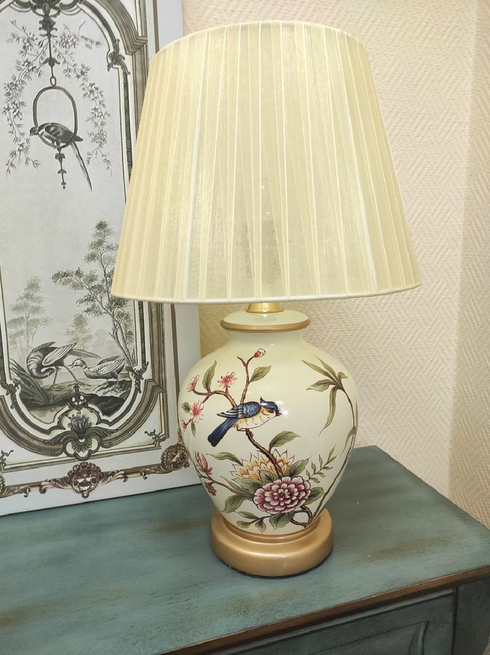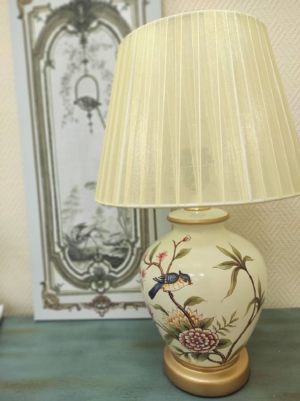 Настольная лампа «Птичка на ветке» — это воплощение изысканности и уютной атмосферы в вашем доме. Эта лампа станет не просто источником света, а настоящим арт-объектом, который привнесет в ваш интерьер очарование французского Прованса, элегантность классики и экзотические ноты шинуазри. Нежная роспись с птицами на керамическом основании оживит любую комнату, создавая спокойную и романтичную обстановку.