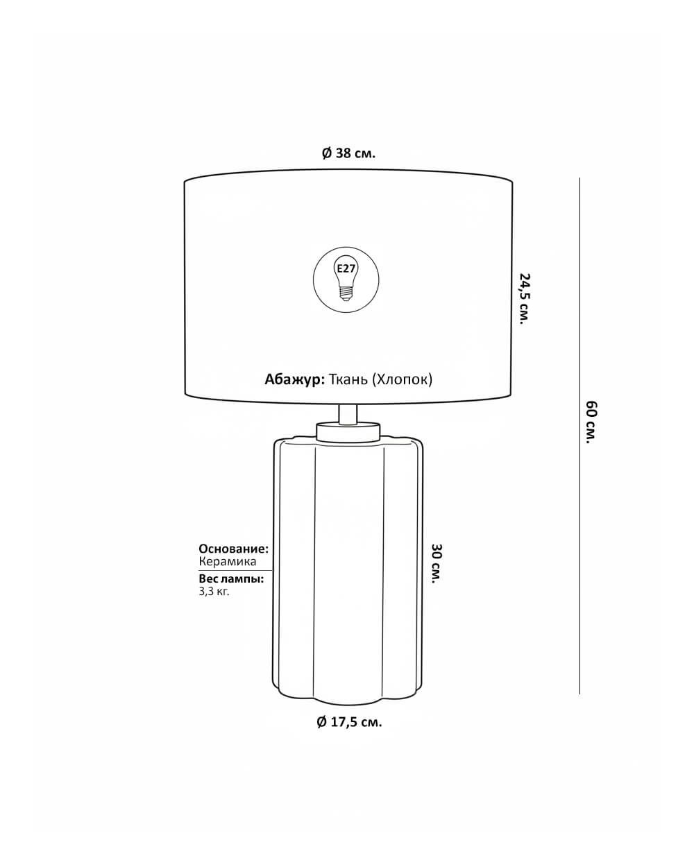 Керамическое основание тяжёлое – лампа устойчива, её не опрокинуть случайно. Рельефная поверхность легко очищается от пыли влажной тканью. Абажур из натурального хлопка равномерно пропускает свет, не создавая резких теней. Металлическая фурнитура с золотистым покрытием не тускнеет со временем. Прозрачный провод практически незаметен в интерьере.