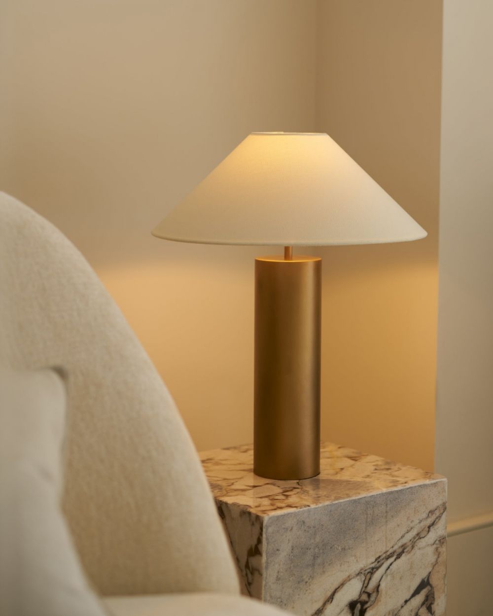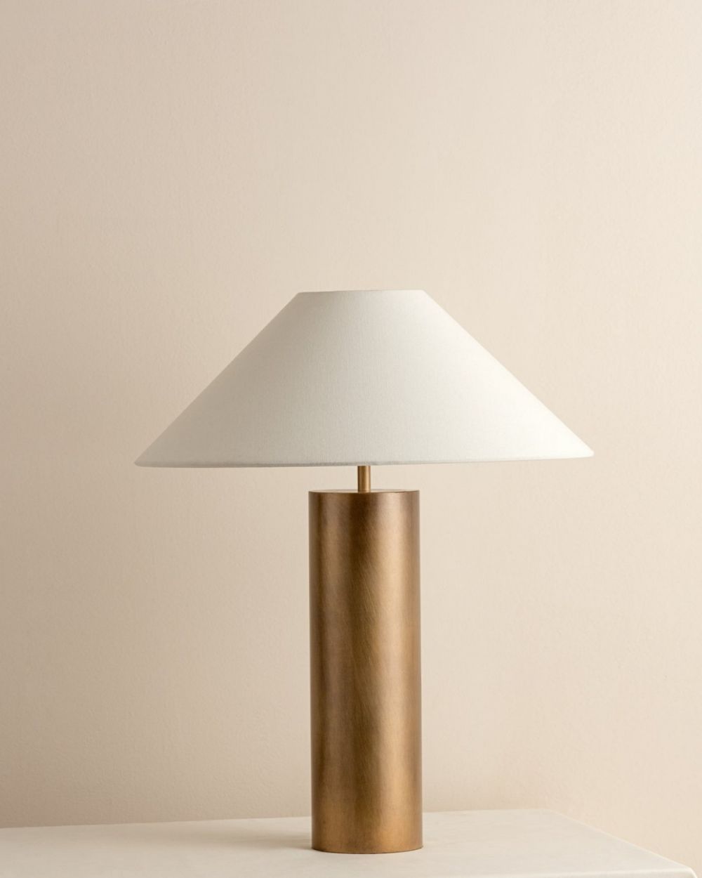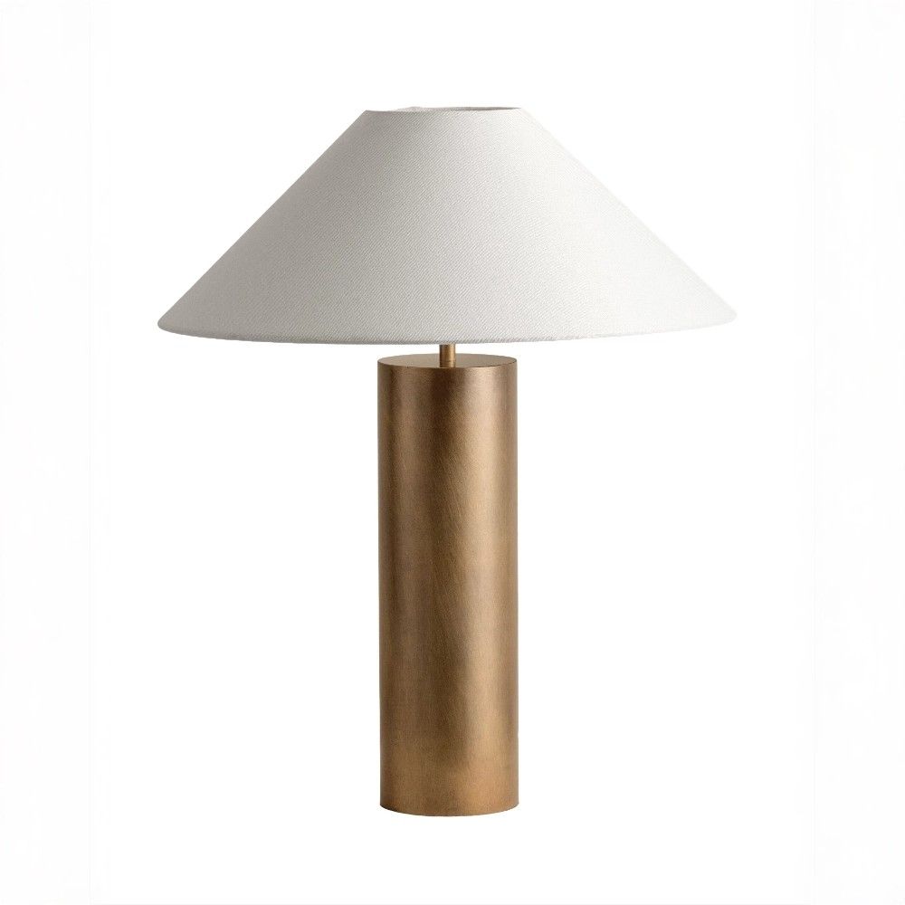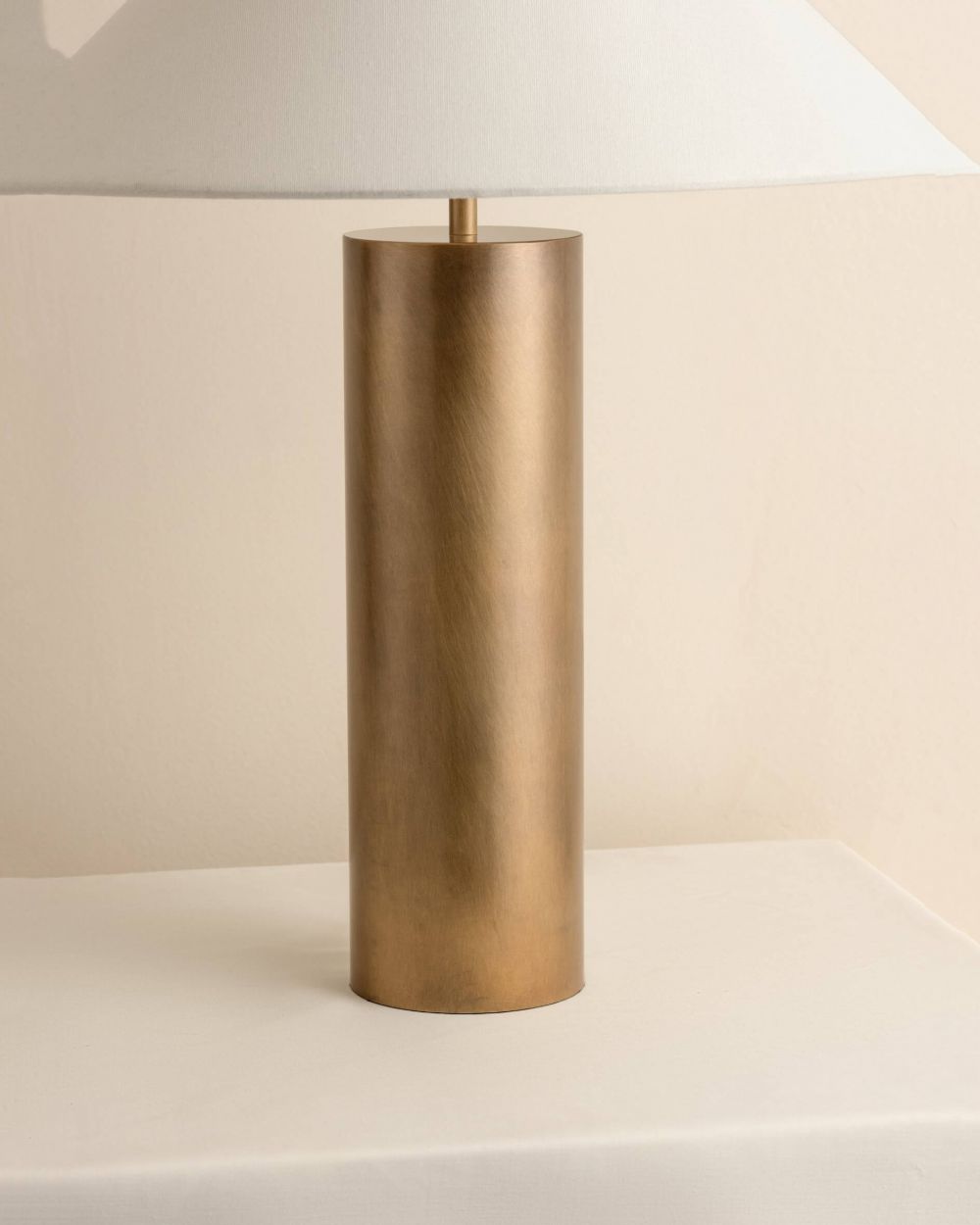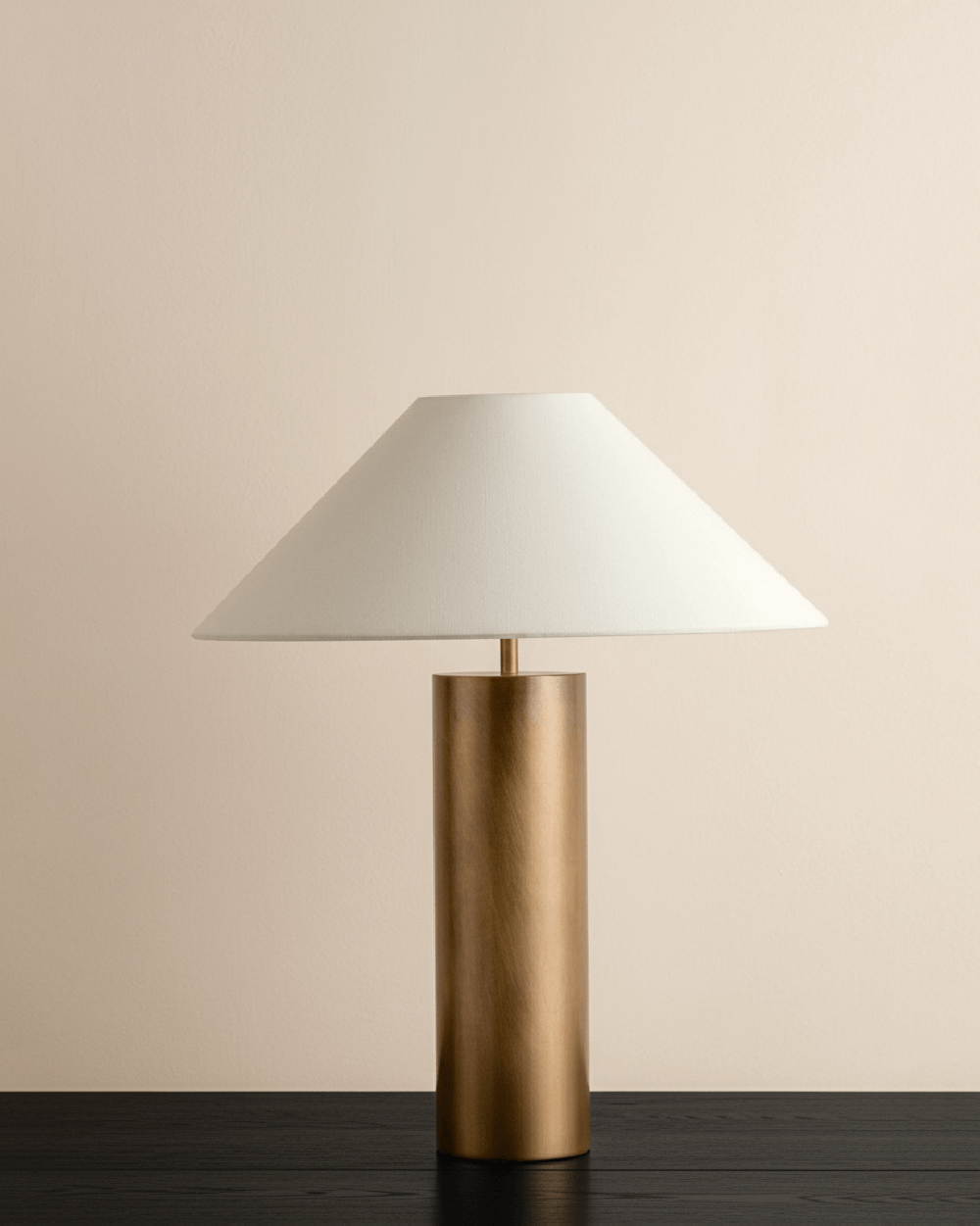 Основание: Металл с покрытием цвета латуни. Теплый золотистый оттенок, который не тускнеет со временем. Цилиндрическая форма придает лампе устойчивость и монументальность.