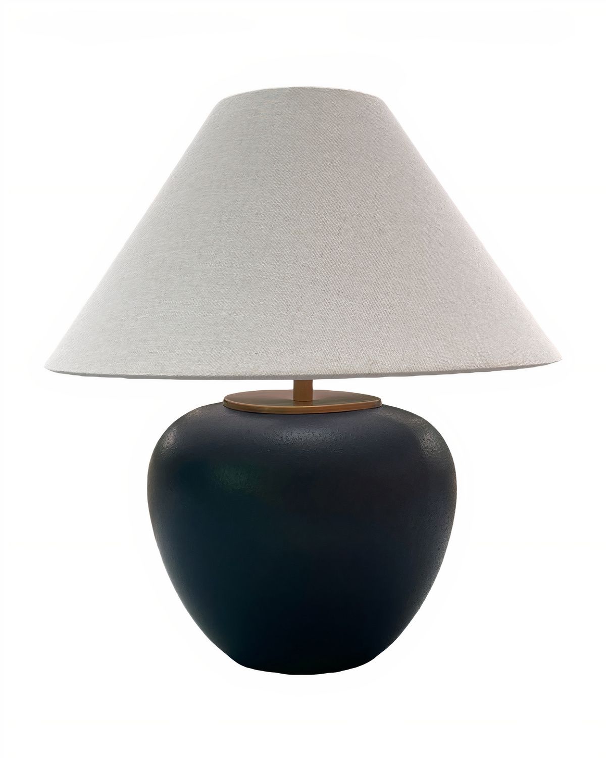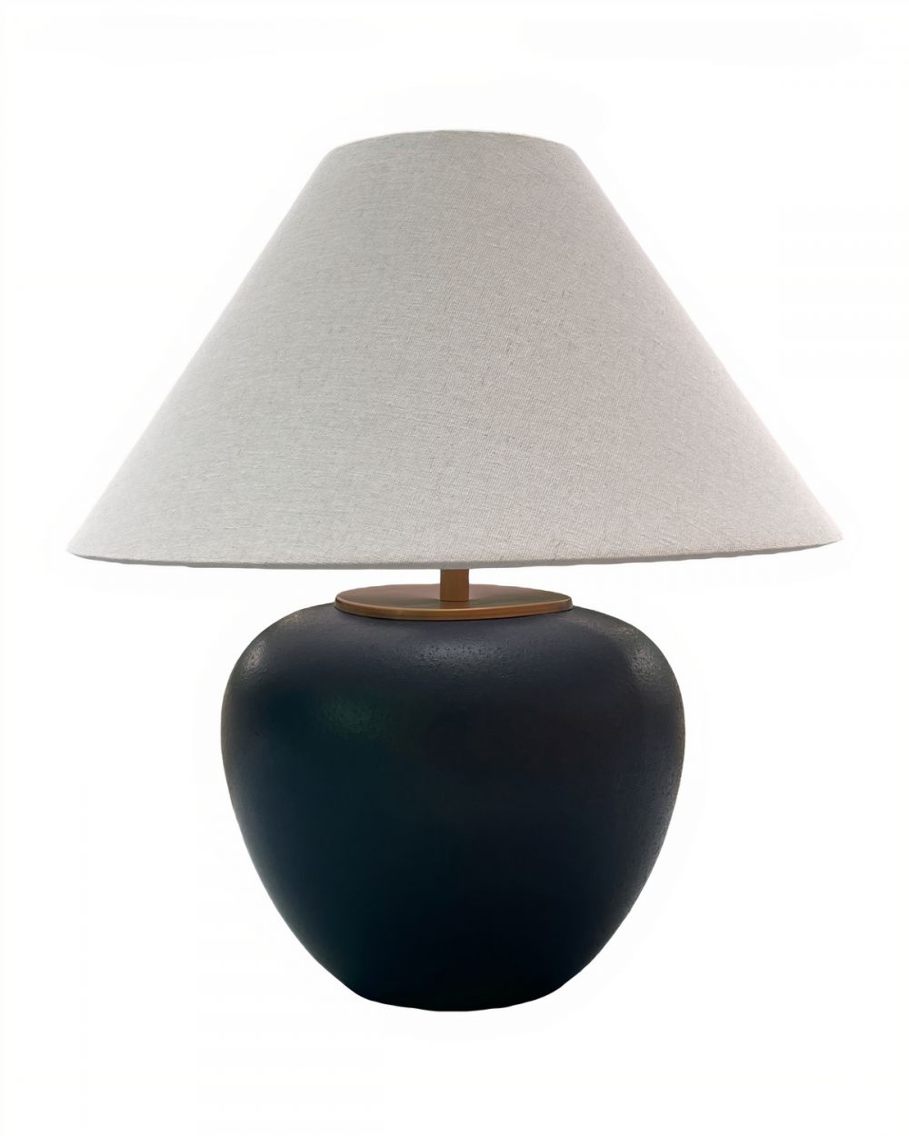 Венчает композицию классический конусный абажур из светлой ткани (бежевый). Мягкий текстиль контрастирует с матовой черной керамикой, создавая идеальный баланс.