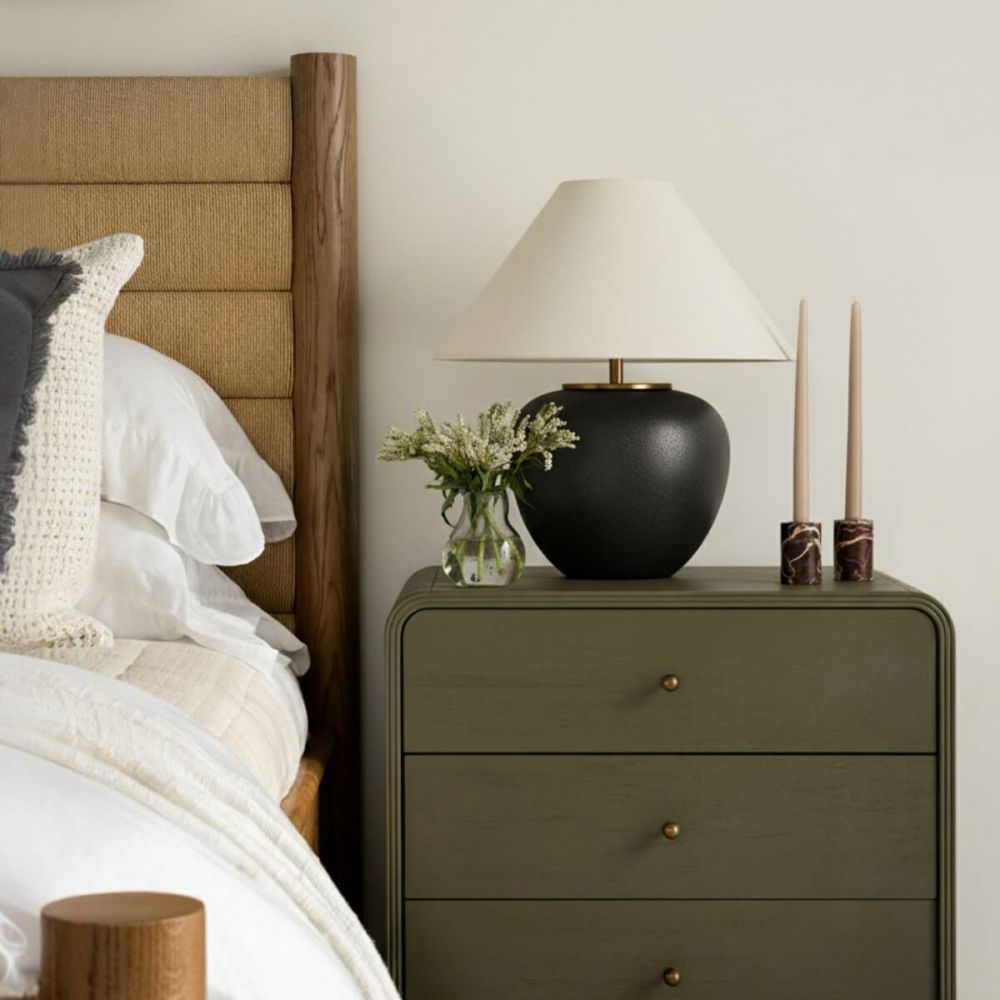 Спальня: На прикроватной тумбе. Мягкий свет не мешает отдыху, а теплый бежевый абажур создает уют.