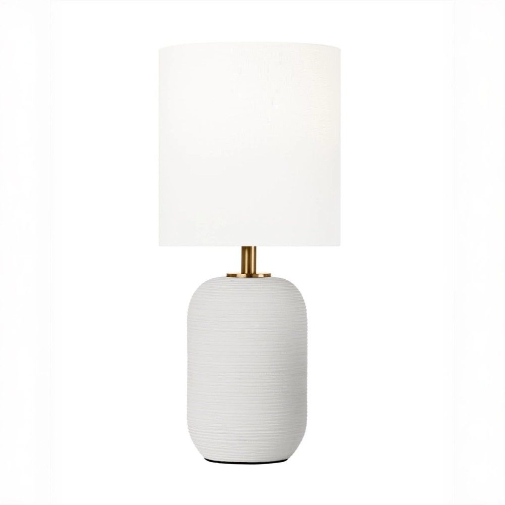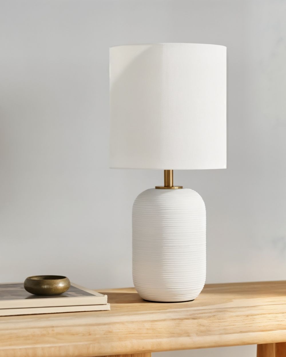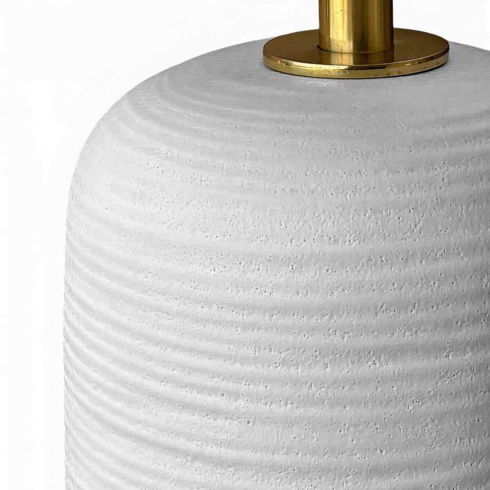 Венчает композицию лаконичный цилиндрический абажур из плотной белой ткани. Его форма подчеркивает вертикаль, а материал мягко рассеивает свет, создавая уютное, комфортное освещение.