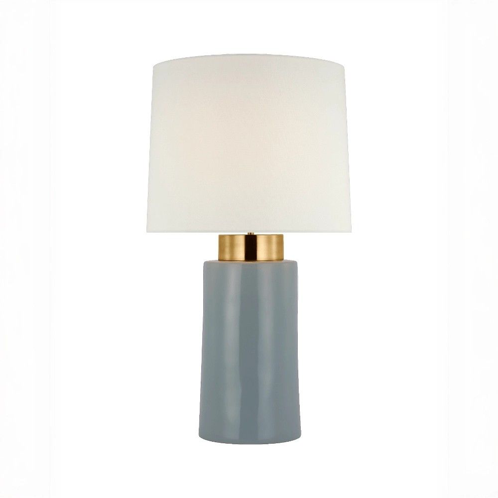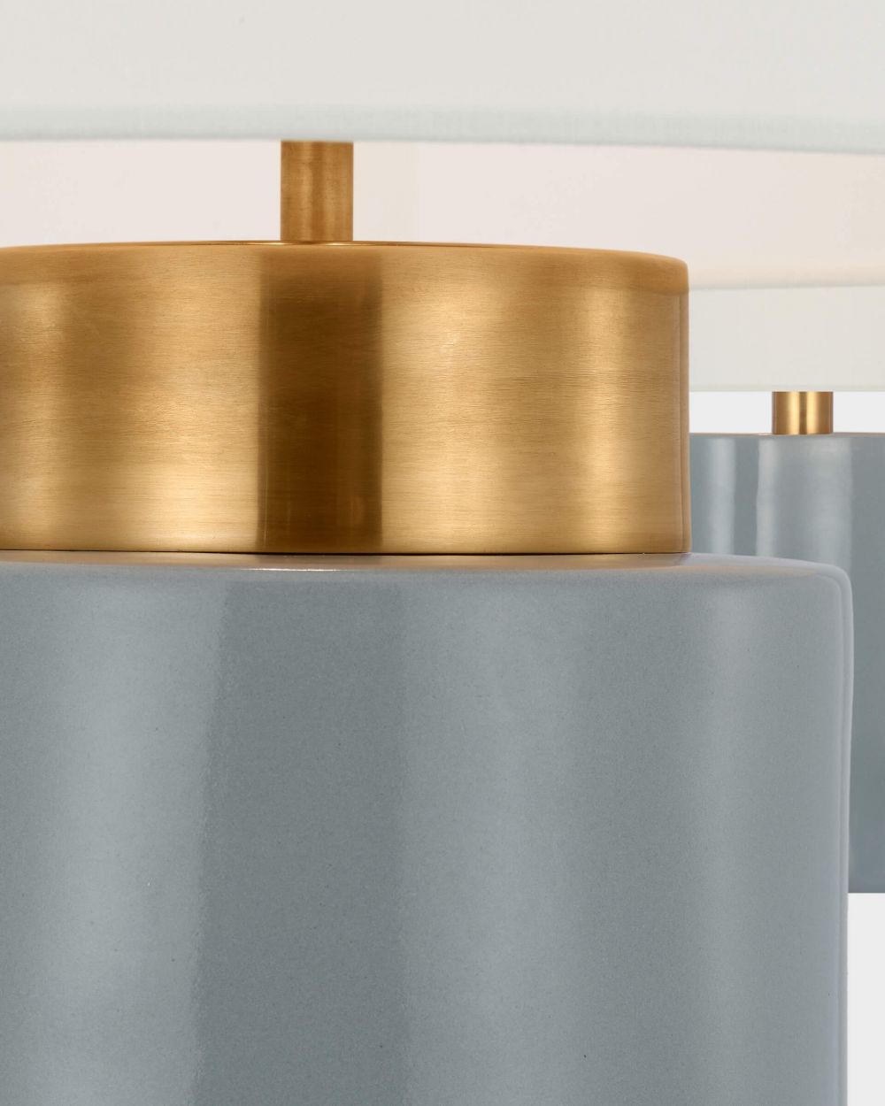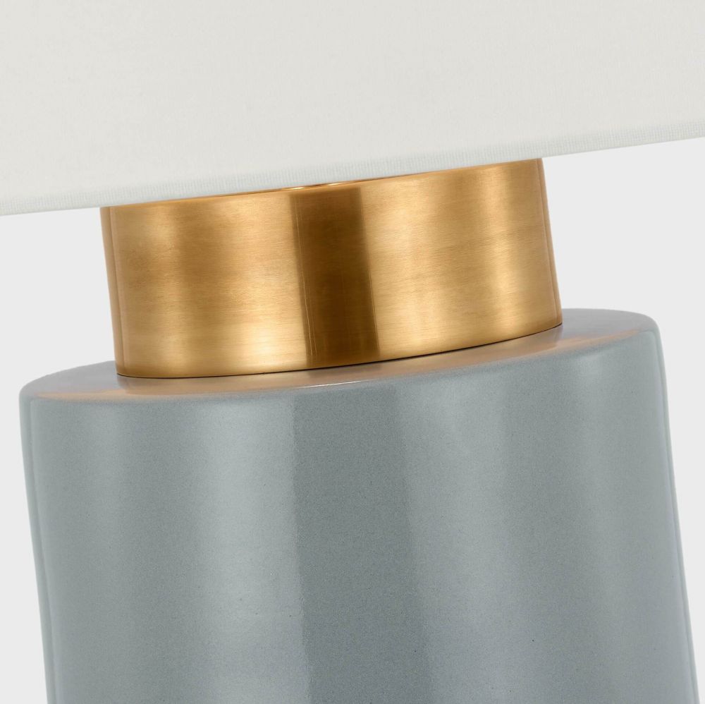 Благодаря нежному серо-голубому оттенку и латунным акцентам, лампа становится идеальным акцентом в самых разных интерьерах.