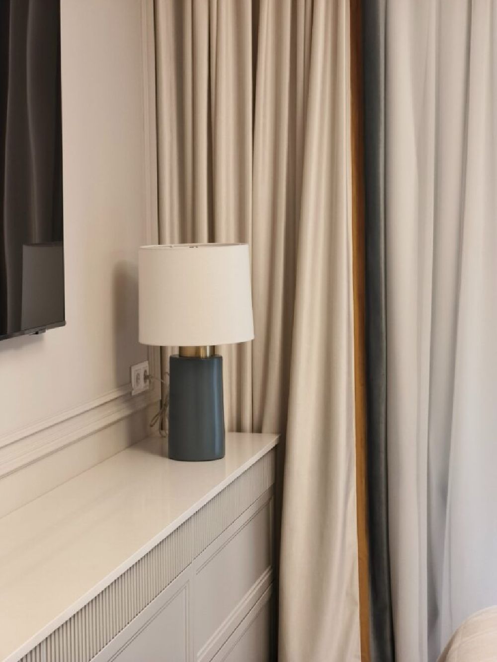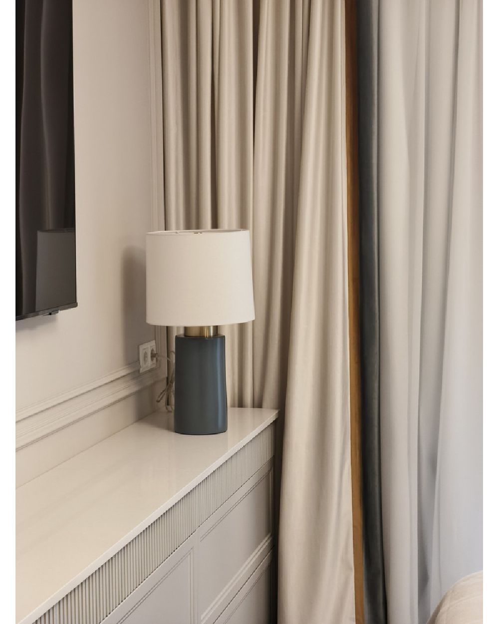 Благодаря цилиндрической форме абажура и плотному хлопку, лампа создает мягкое, рассеянное свечение. Белый абажур смягчает свет, делая его комфортным для глаз, а нежный серо-голубой оттенок основания добавляет интерьеру свежести и настроения.