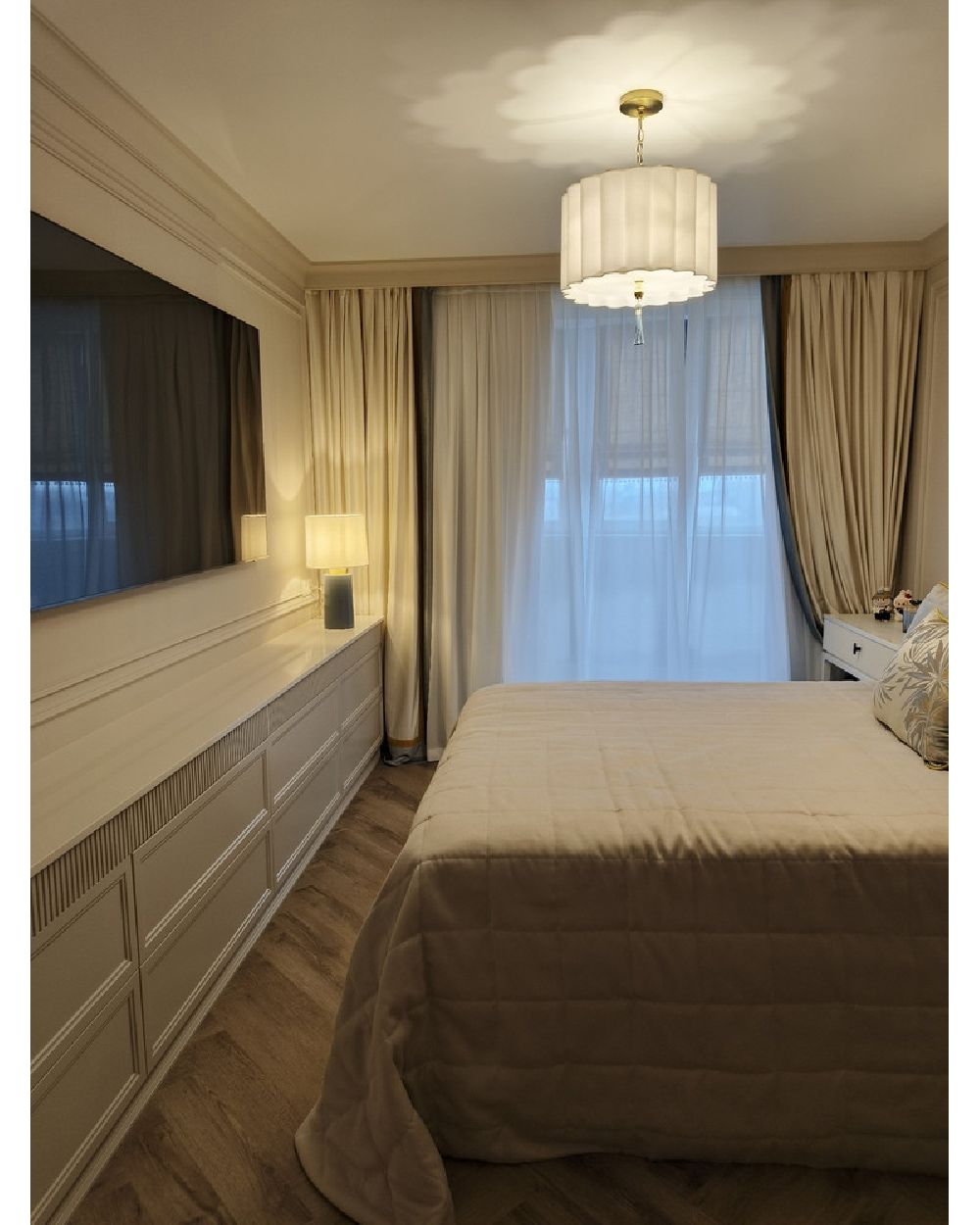 Белый цилиндрический абажур из плотной ткани завершает композицию, мягко рассеивая свет и делая атмосферу в комнате уютной и расслабляющей.
