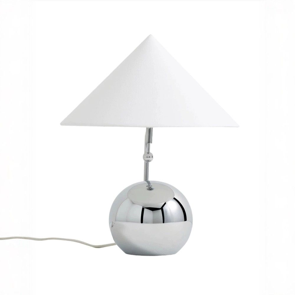 Основание: Хромированный металл. Зеркальная поверхность отражает свет и окружающие предметы, делая лампу визуально невесомой.