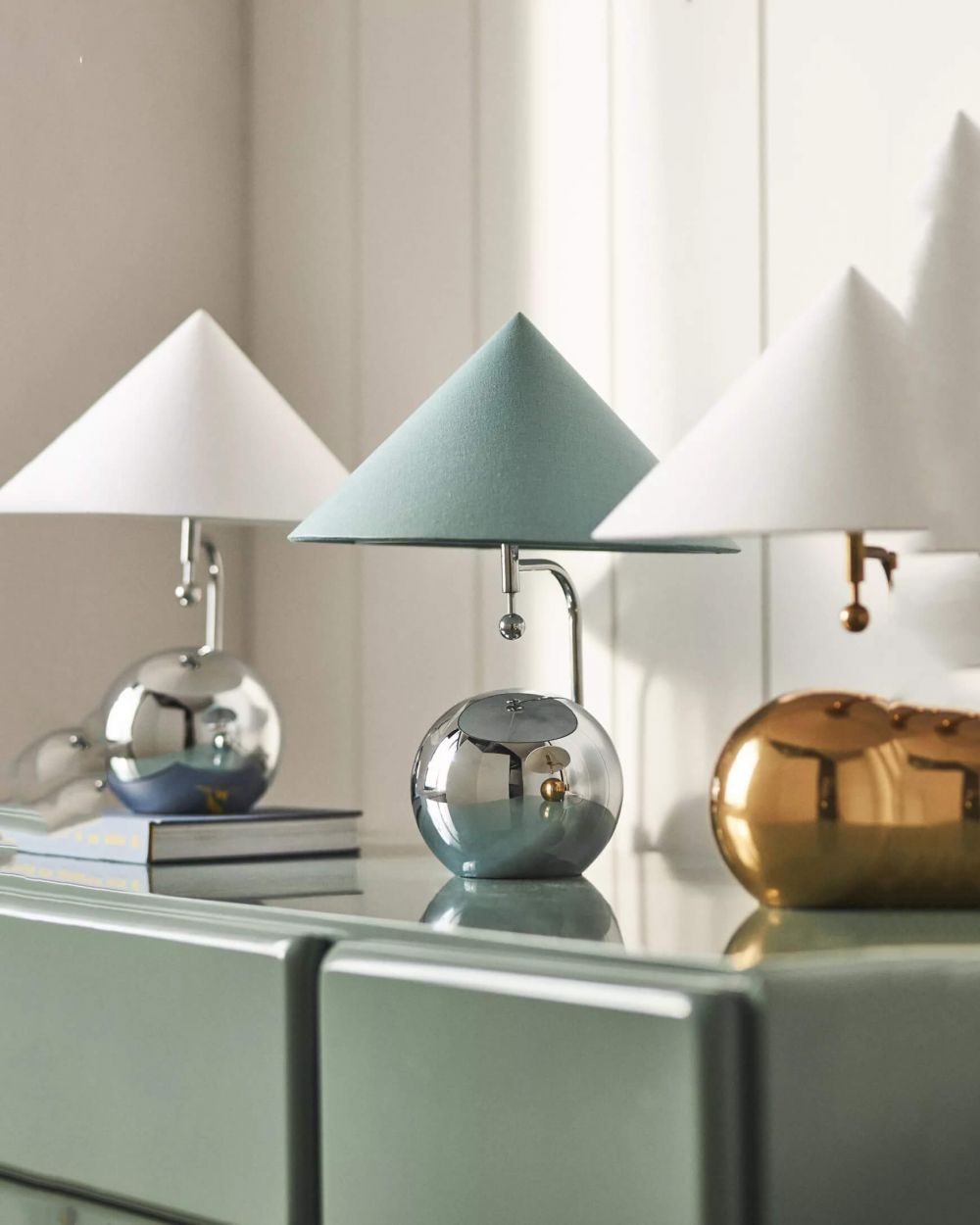 Благодаря универсальному мятному оттенку и зеркальному блеску, лампа вписывается в самые разные стили.