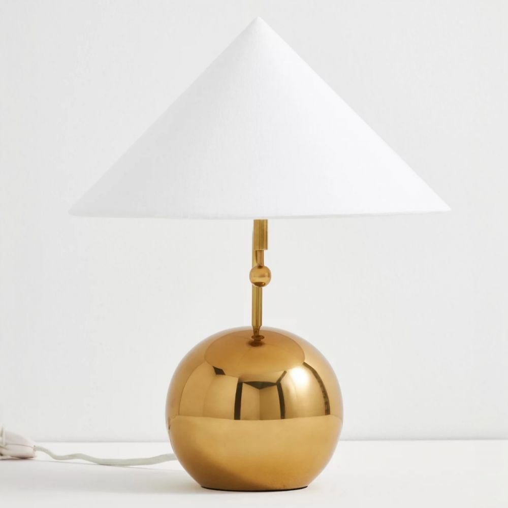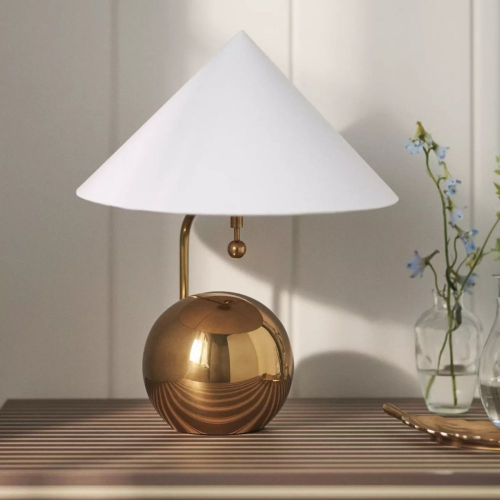 Благодаря благородному золотистому оттенку и универсальному белому абажуру, лампа вписывается в самые разные стили.