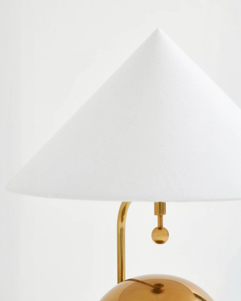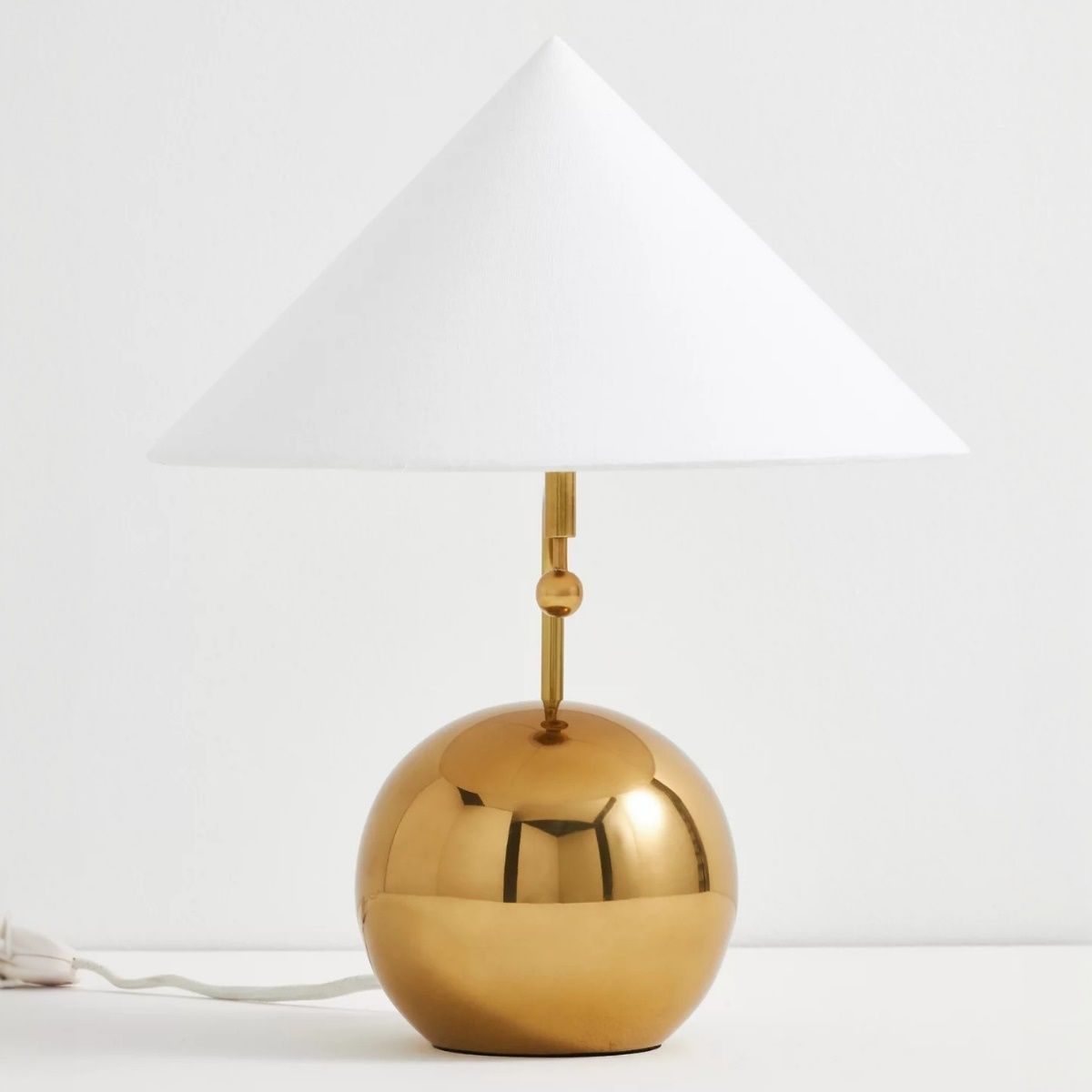 Венчает композицию белый конусный абажур из хлопка. Классическая форма и белоснежный цвет создают идеальный контраст с теплым металлом, делая лампу одновременно и нарядной, и сдержанной.