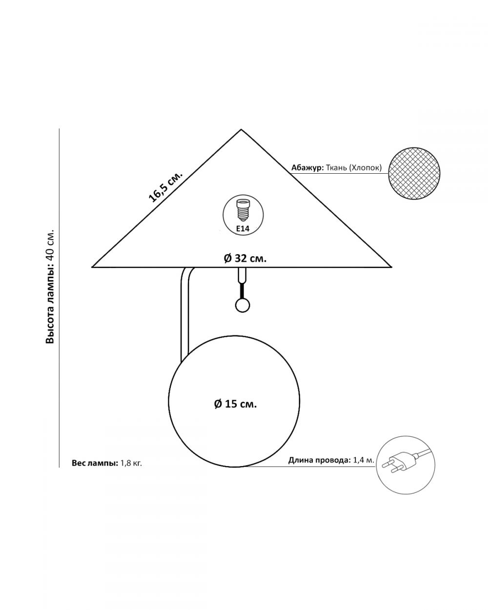 Высота лампы 40 см и диаметр 32 см — компактные, но заметные размеры.