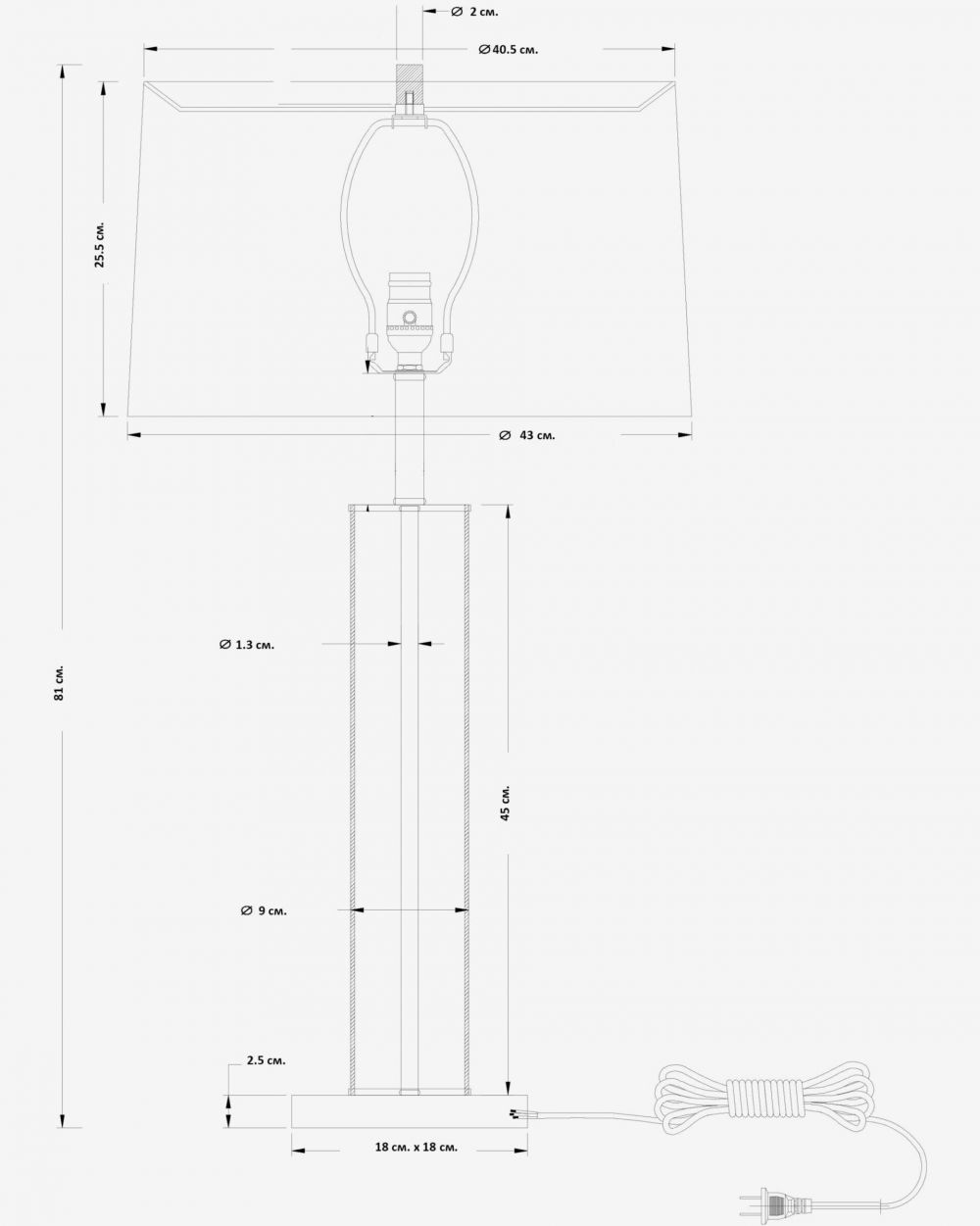 Абажур: Белый хлопок. Плотная ткань цилиндрической формы идеально рассеивает свет.