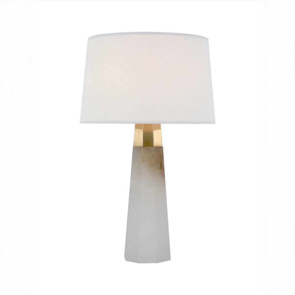 Материалы: Основание — натуральный алебастр. Фурнитура — металл с латунным покрытием. Абажур — белый хлопок.
