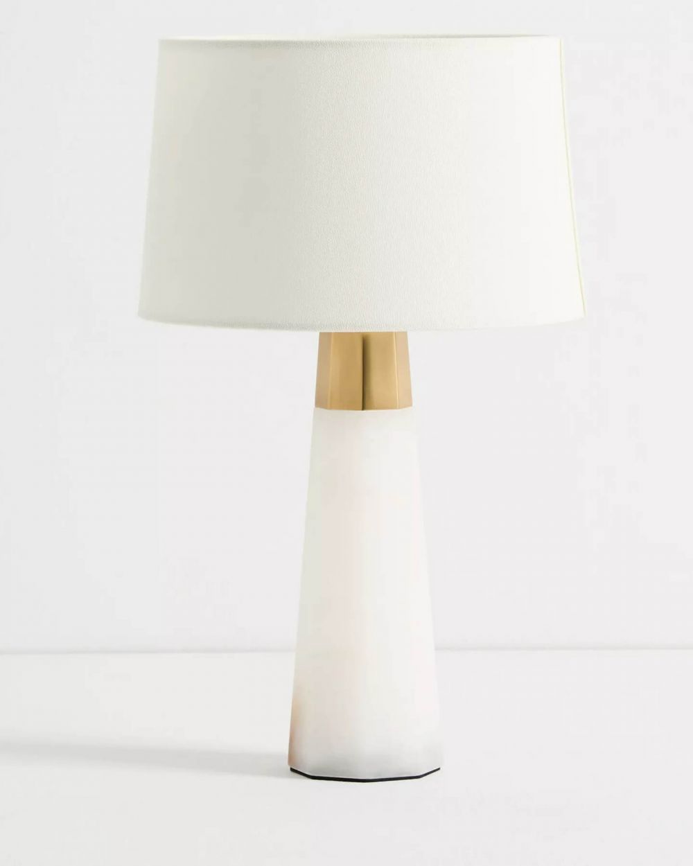 Теплая латунная фурнитура идеально дополняет текстуру камня, создавая благородный контраст. Белый конусный абажур из хлопка мягко рассеивает свет, завершая композицию.