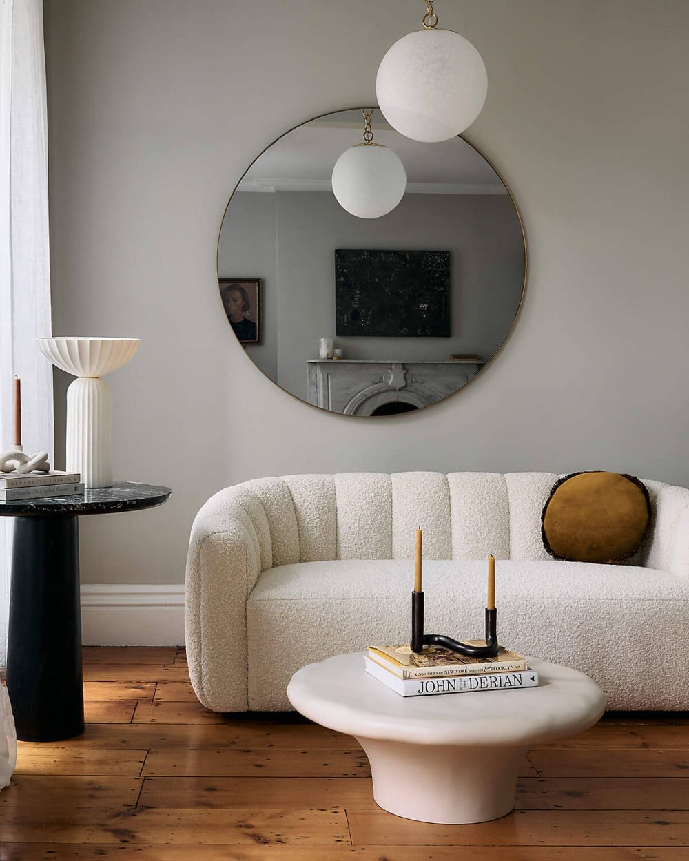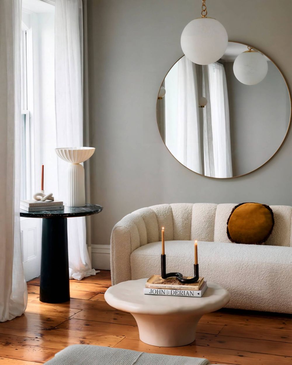 В просторной гостиной. Зона отдыха с угловым диваном и журнальным столиком. Один крупный подвес работает как собирающий элемент всей композиции.