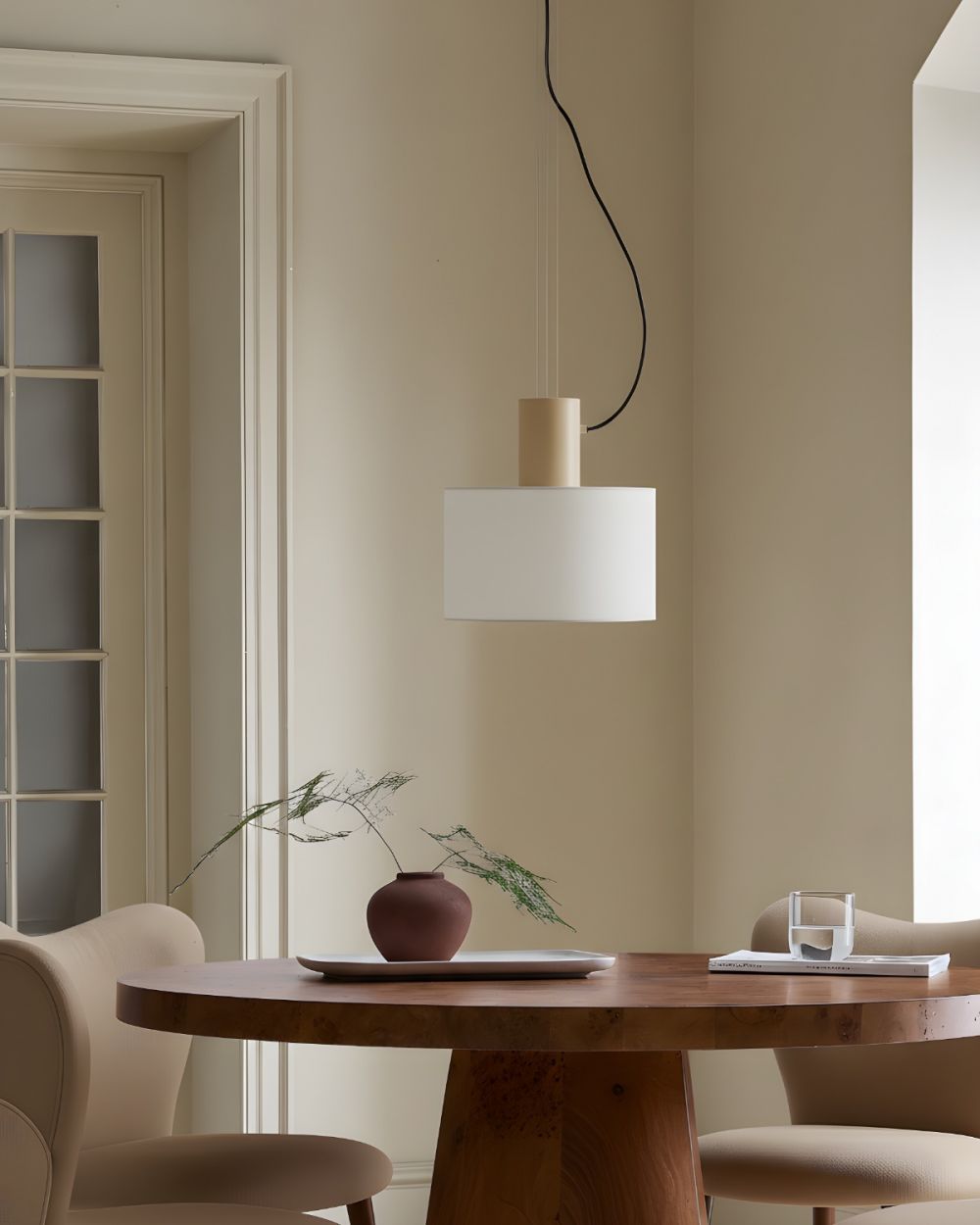 Цвета: Корпус — матовый бежевый (тапиоки). Абажур — белый хлопковый текстиль.