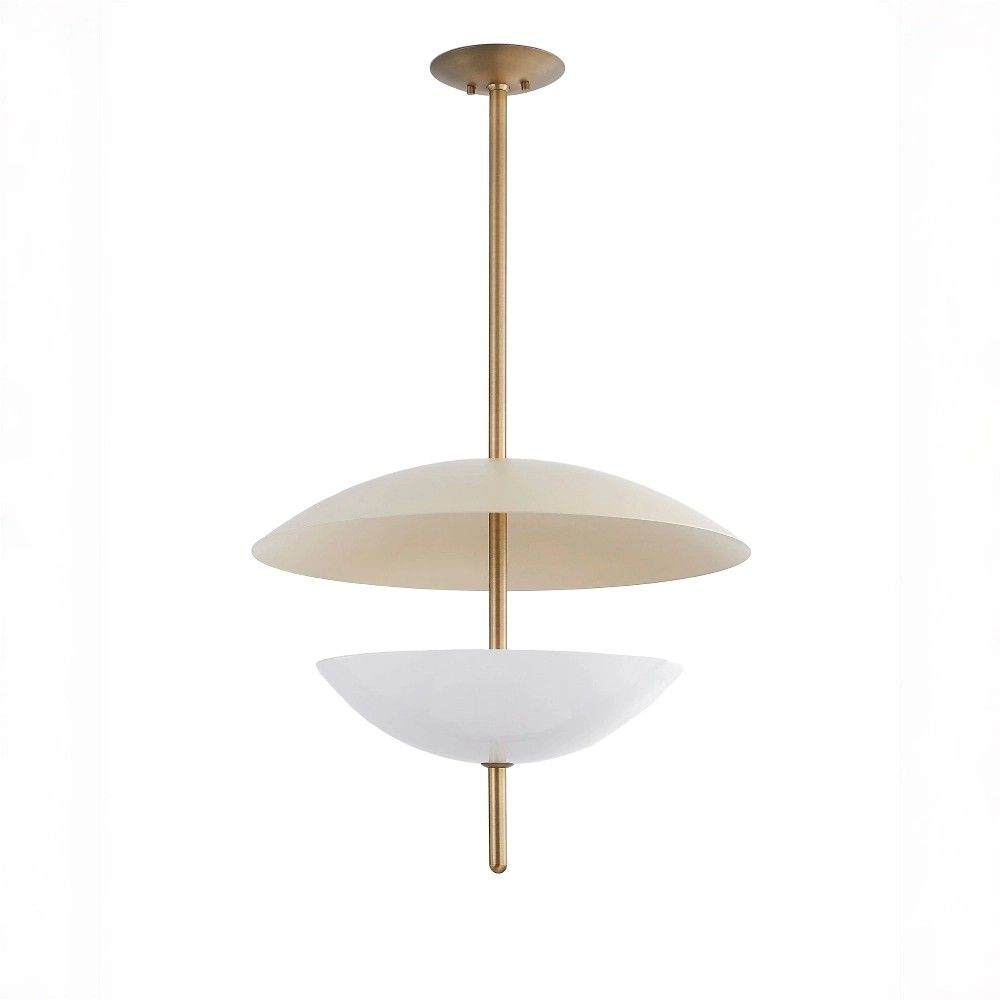 Секрет его атмосферности — в двойном рассеивании. Верхний широкий диск из металла, играя роль отражателя, мягко направляет свет к потолку, создавая общее теплое свечение. Нижняя полусфера из матового стекла цвета слоновой кости рассеивает основной поток вниз, устраняя любые резкие блики и тени. В результате вы получаете комфортное, равномерное и невероятно уютное освещение, идеальное для долгих вечеров за столом или отдыха в гостиной.