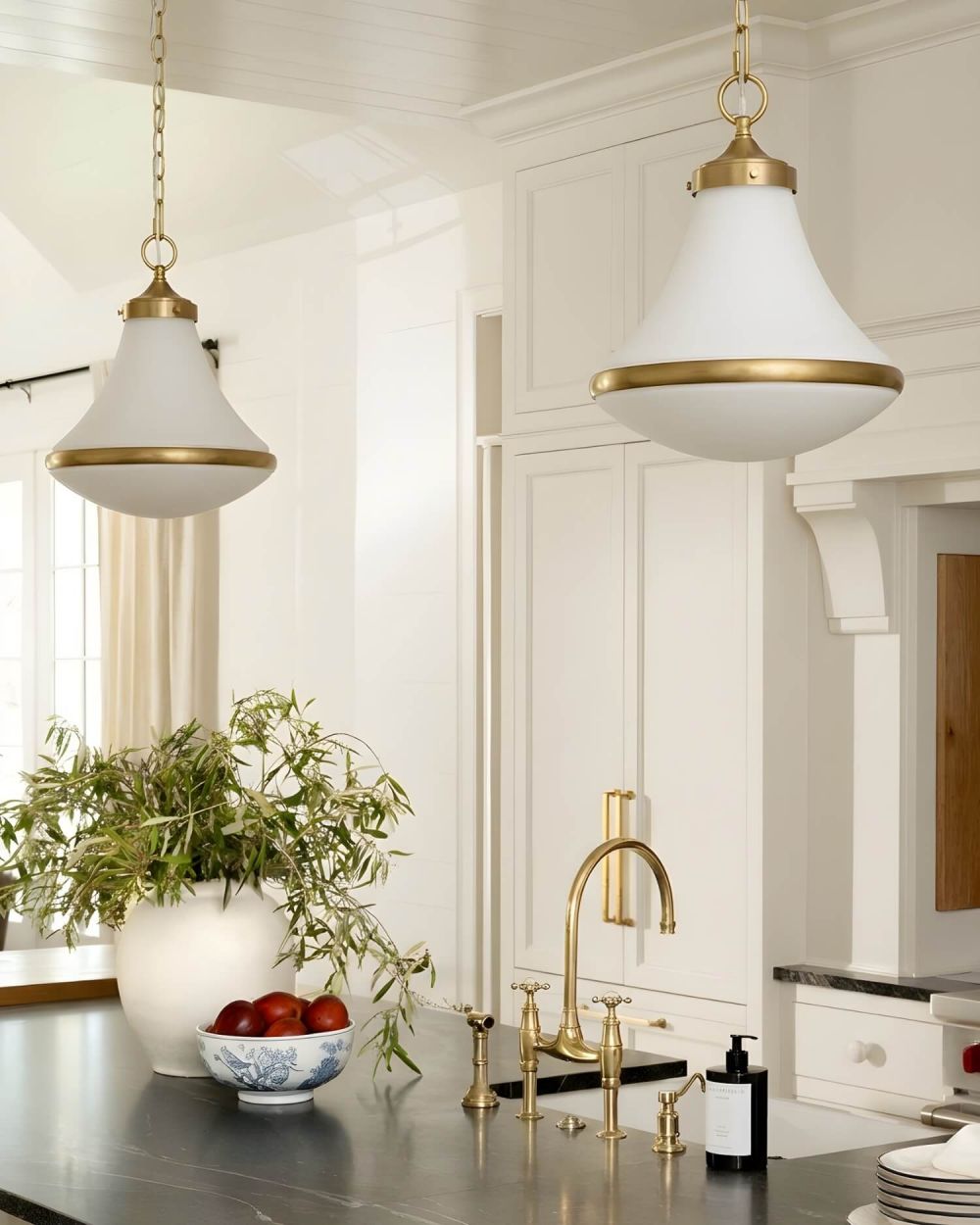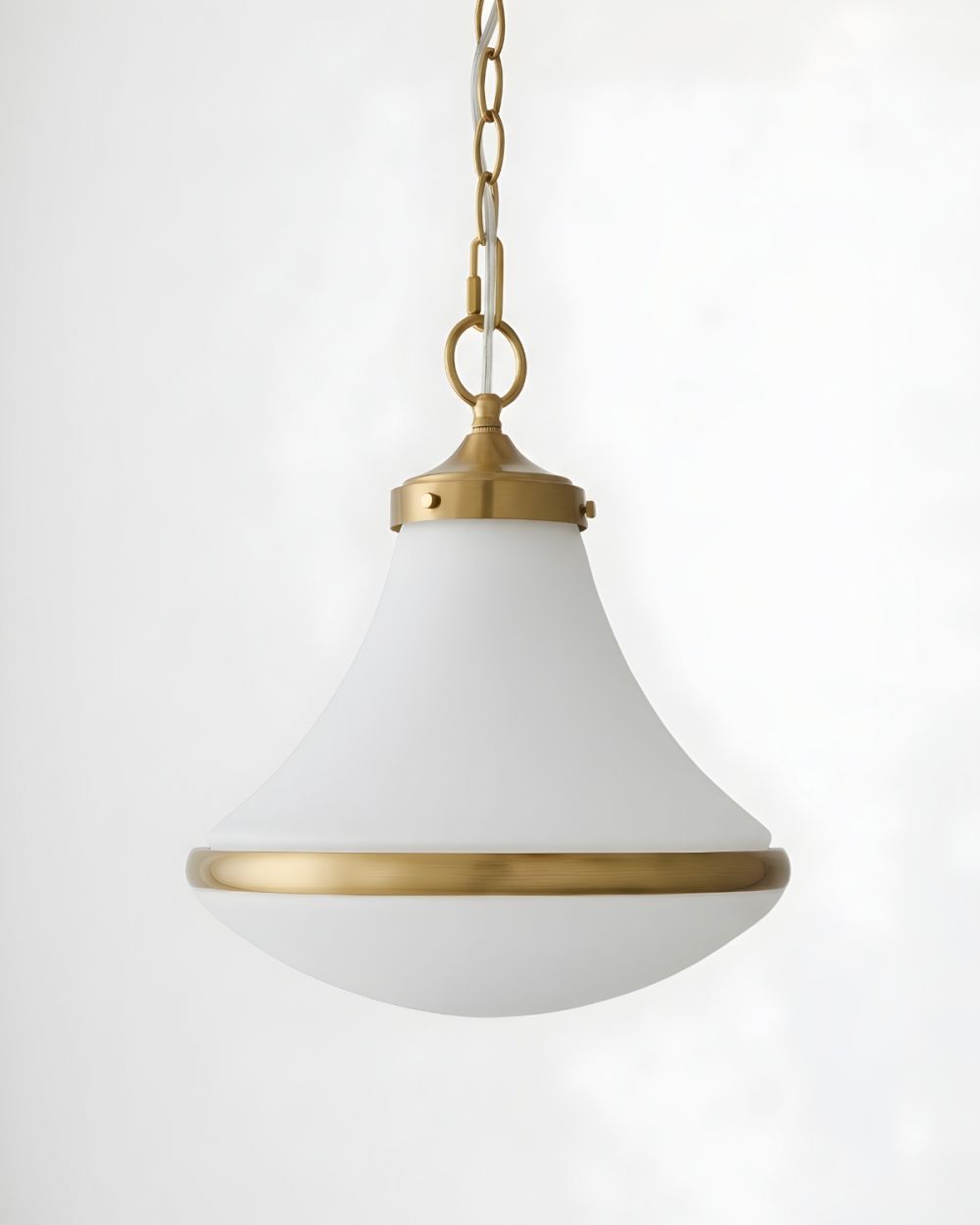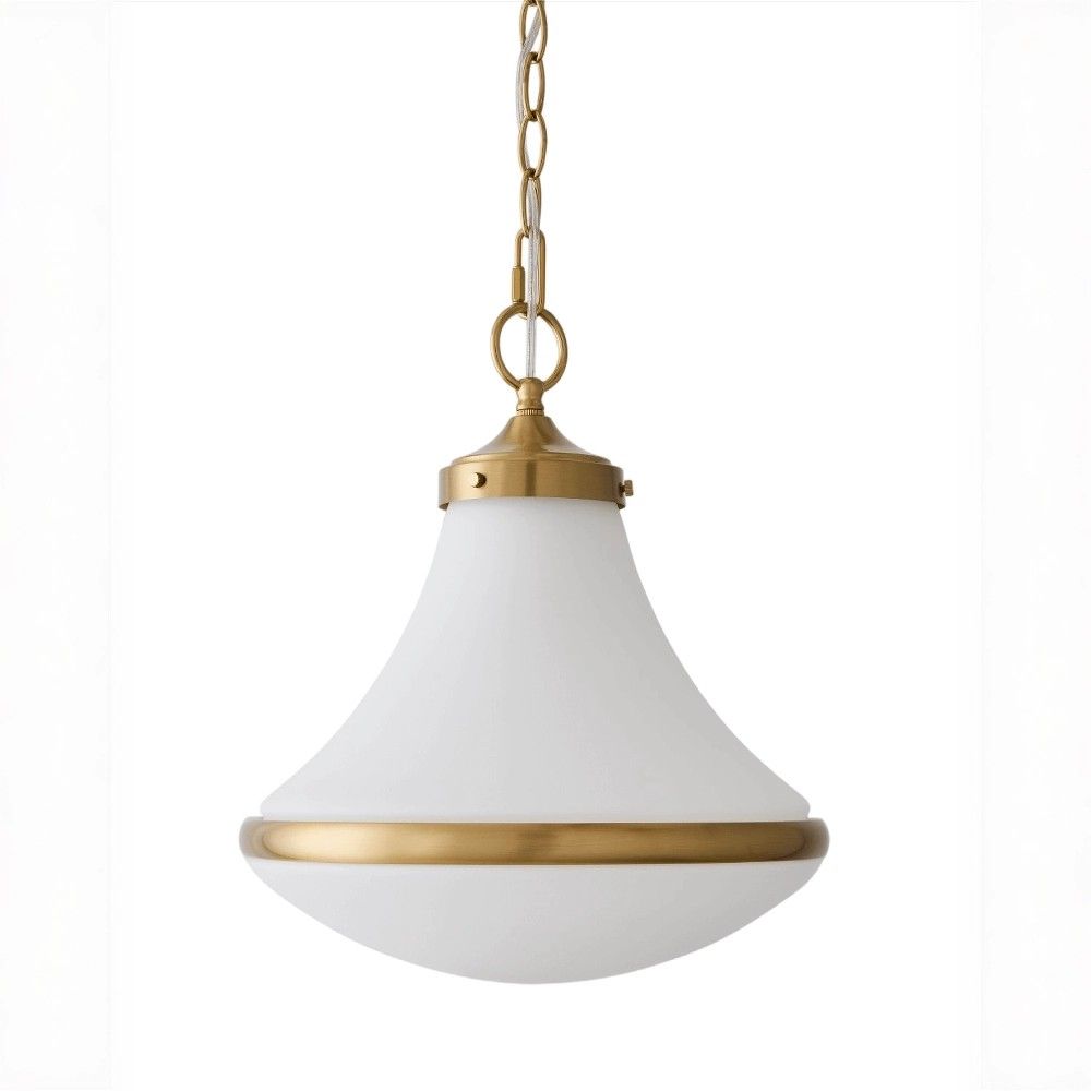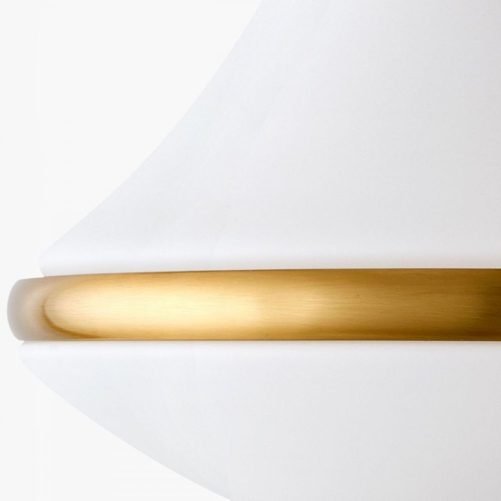 Цвета: Плафон — молочно-белый матовый. Арматура, цепь и потолочная чаша — брашированная латунь.