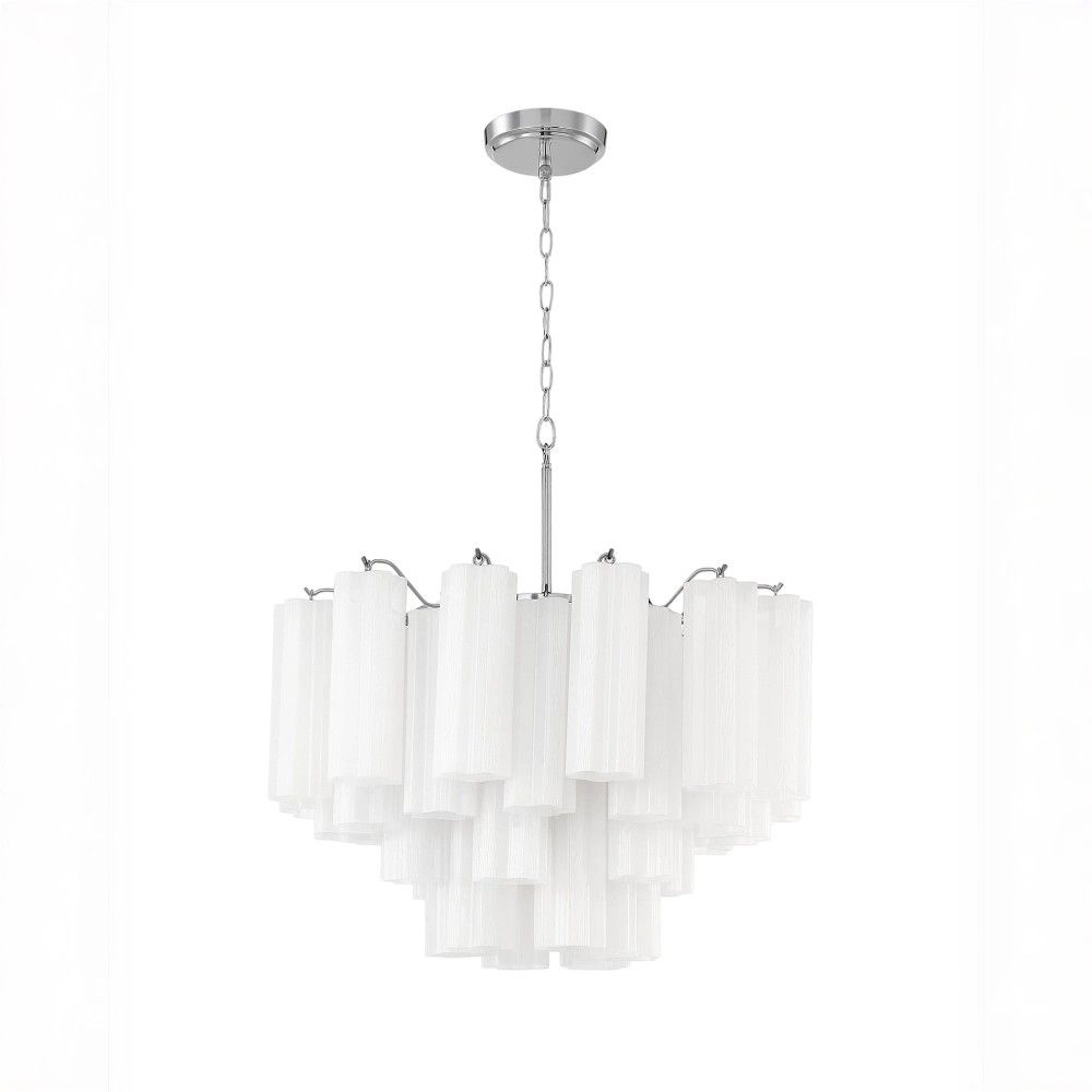 Секрет выразительности люстры — в её многослойной структуре. Шесть плафонов из белого матового стекла расположены на разной высоте, формируя каскад. Это даёт не только эффектный визуальный объём, но и уникальную световую картину: свет распределяется по всем направлениям, не оставляя тёмных углов и создавая мягкое, равномерное освещение без резких перепадов.