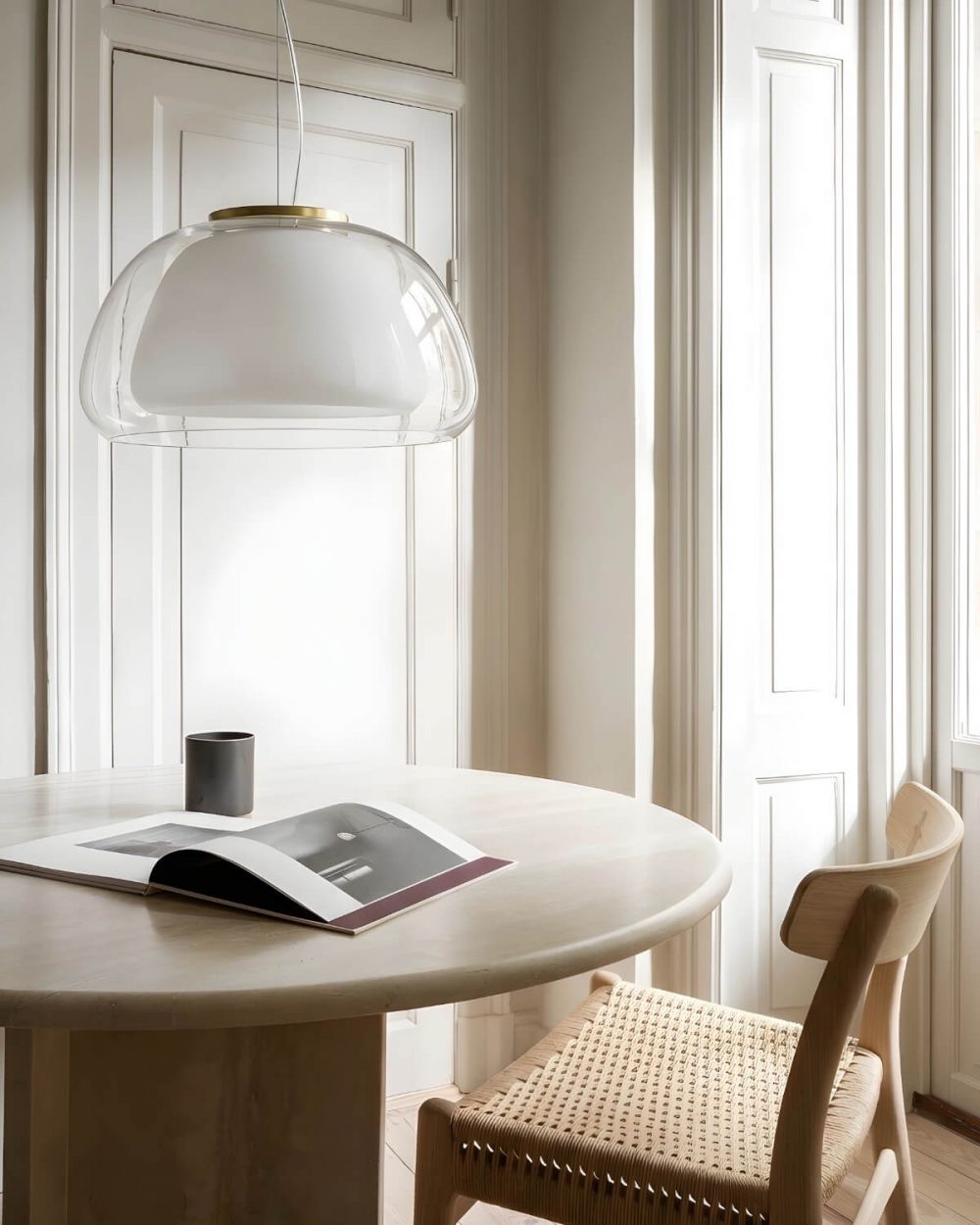 Над кухонным островом или барной стойкой — в паре с декоративной лампочкой с открытой нитью накала. Над обеденным столом в студии — в одиночку или в композиции из двух-трёх подвесов. В прихожей — создавая первую, самую тёплую точку света. В спальне у изголовья — вместо бра, на длинном подвесе.