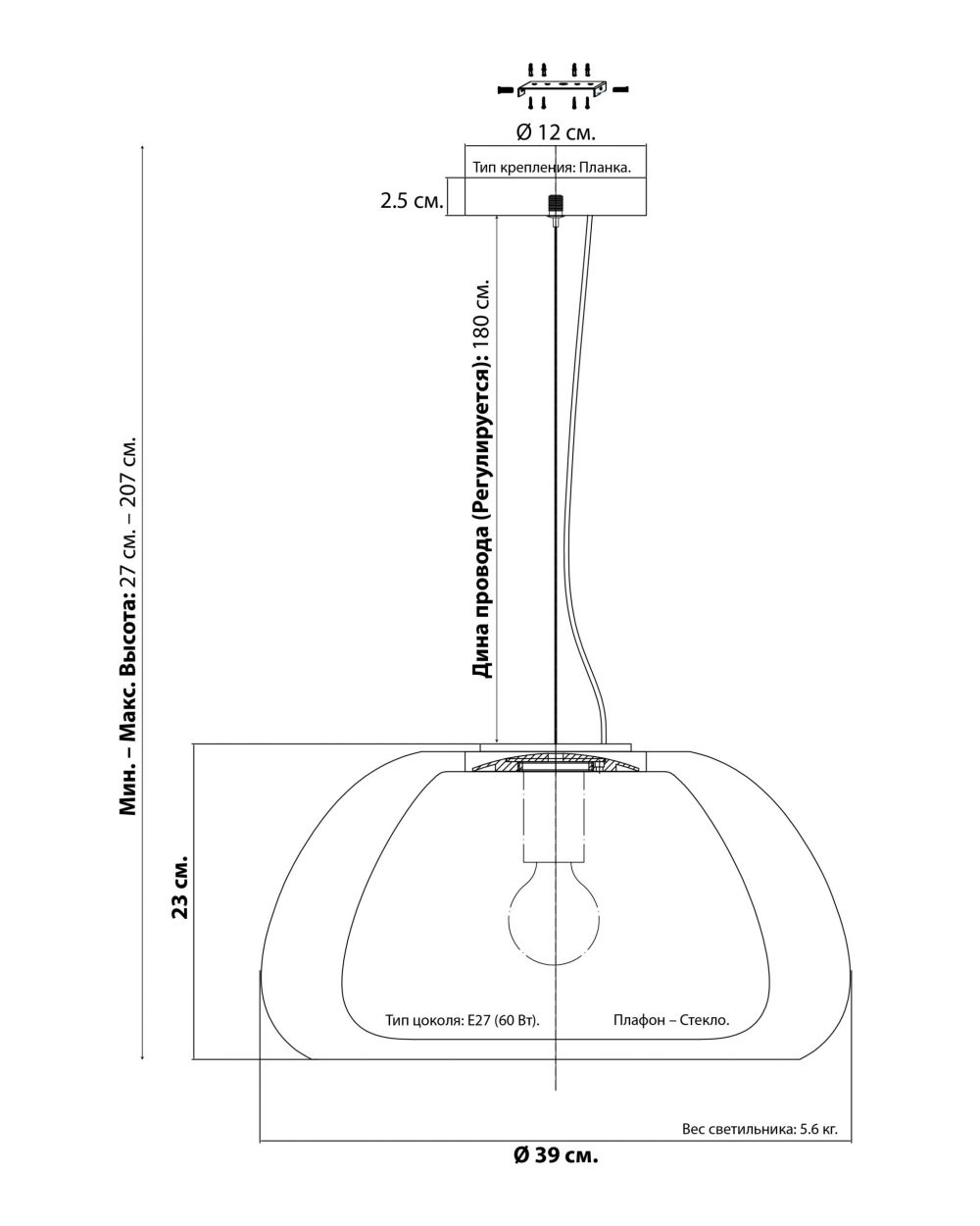 Регулировка: Длина провода регулируется до 180 см, высота подвеса — от 27 до 107 см. Легко адаптируется под любую высоту потолка.