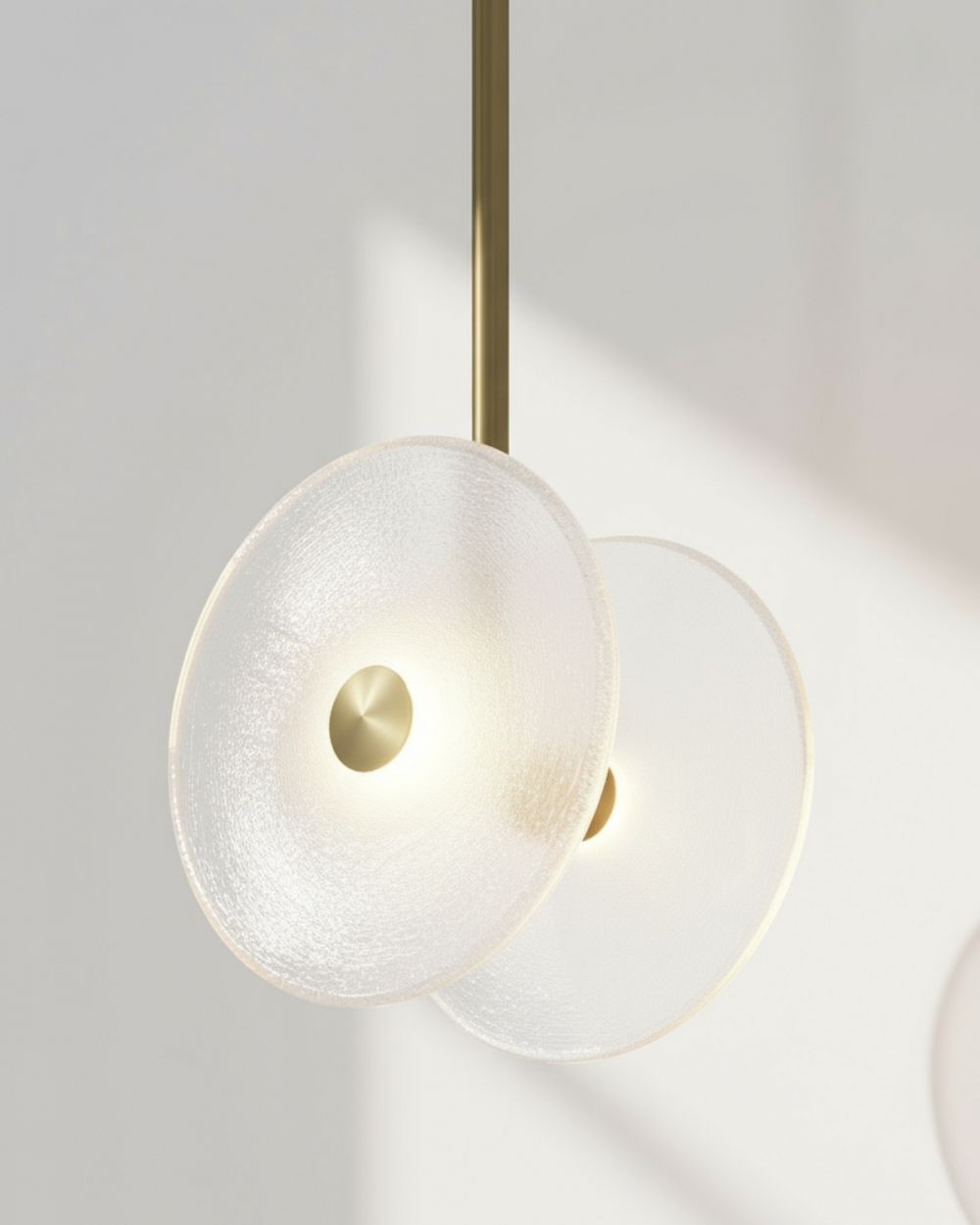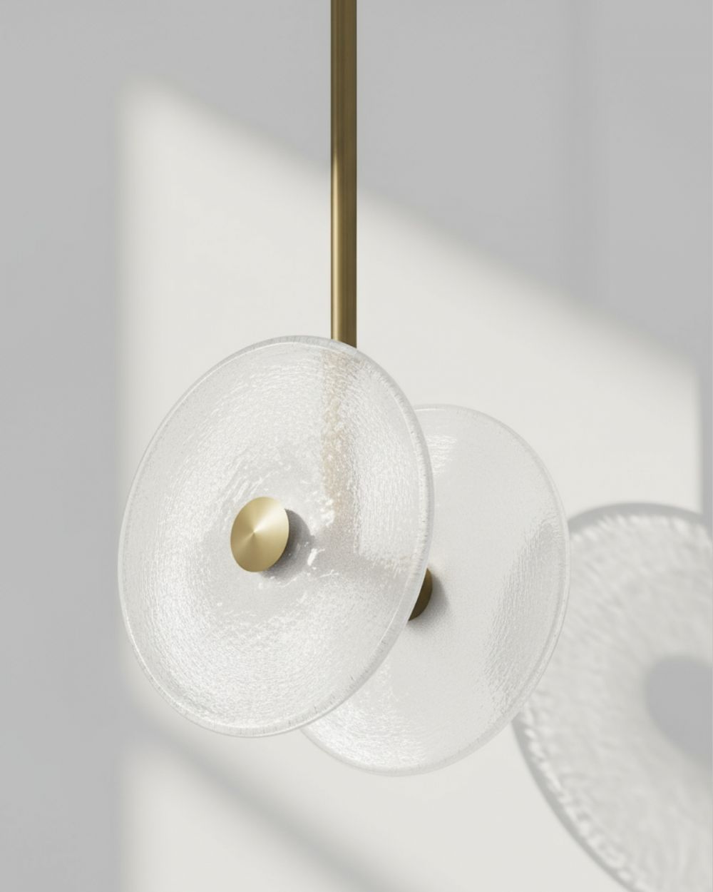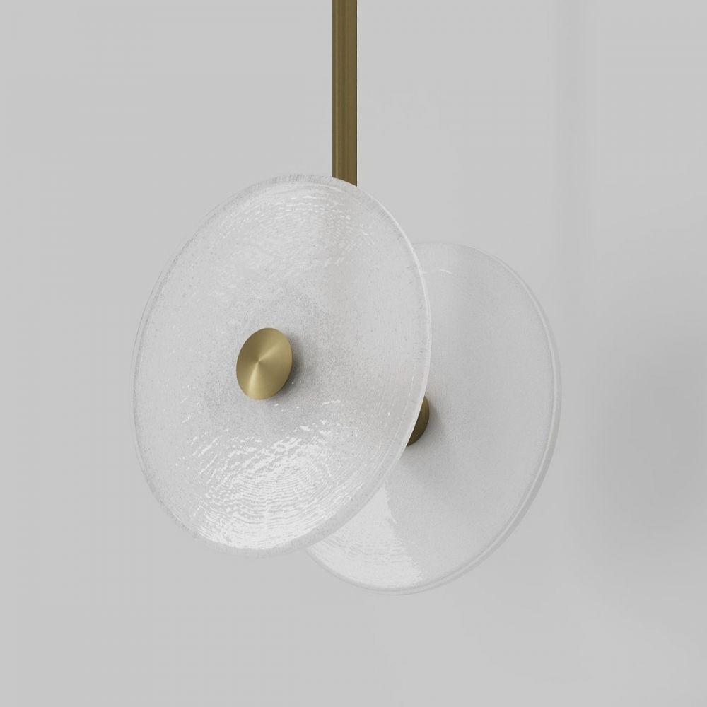 «Милфорд» — это слоеный пирог из света и стекла. Два прозрачных диска, нанизанных на латунный стержень, создают эффект парения. Они не перегружают пространство, не собирают пыль, не требуют ухода. Просто свет, стекло и металл в идеальном равновесии.