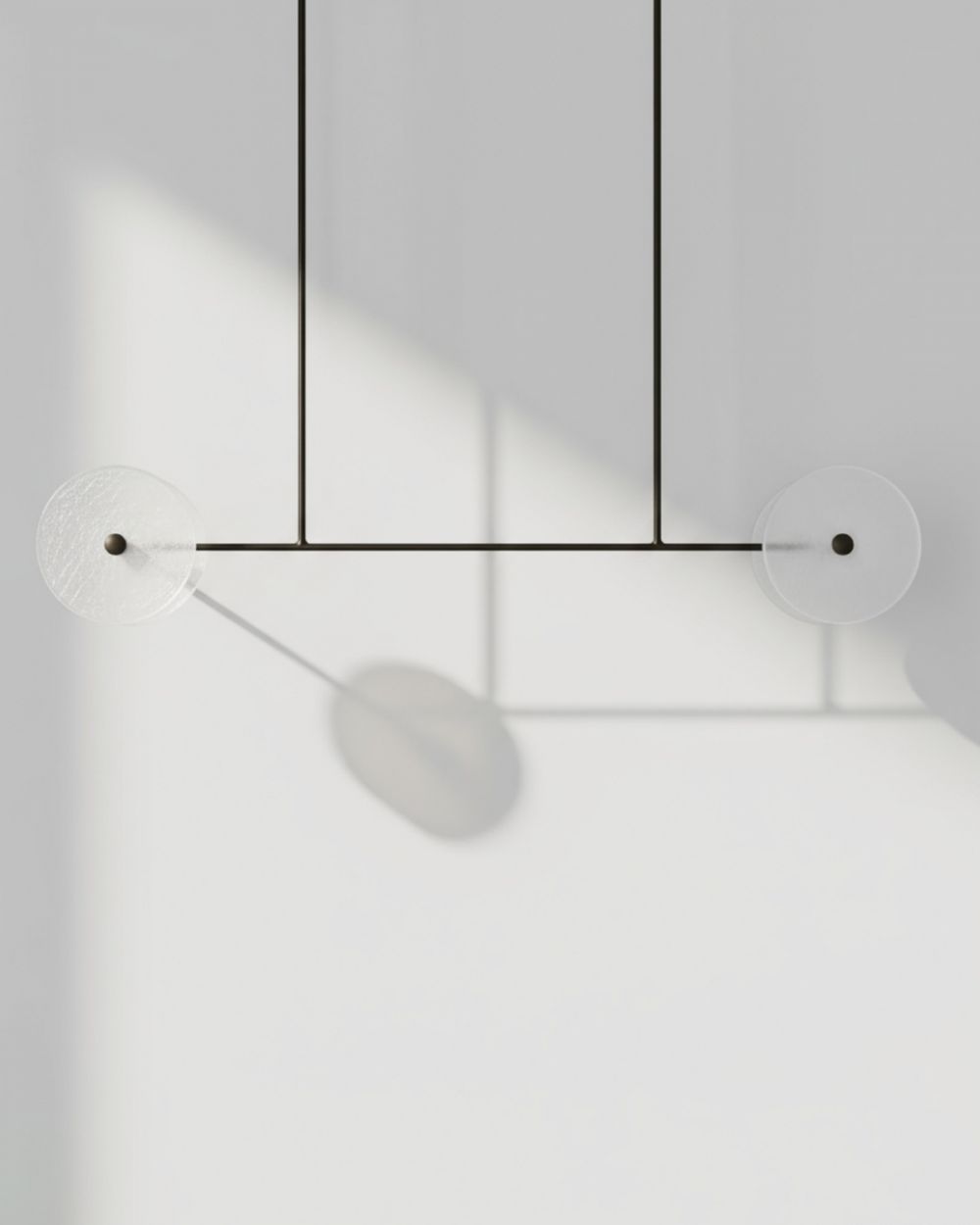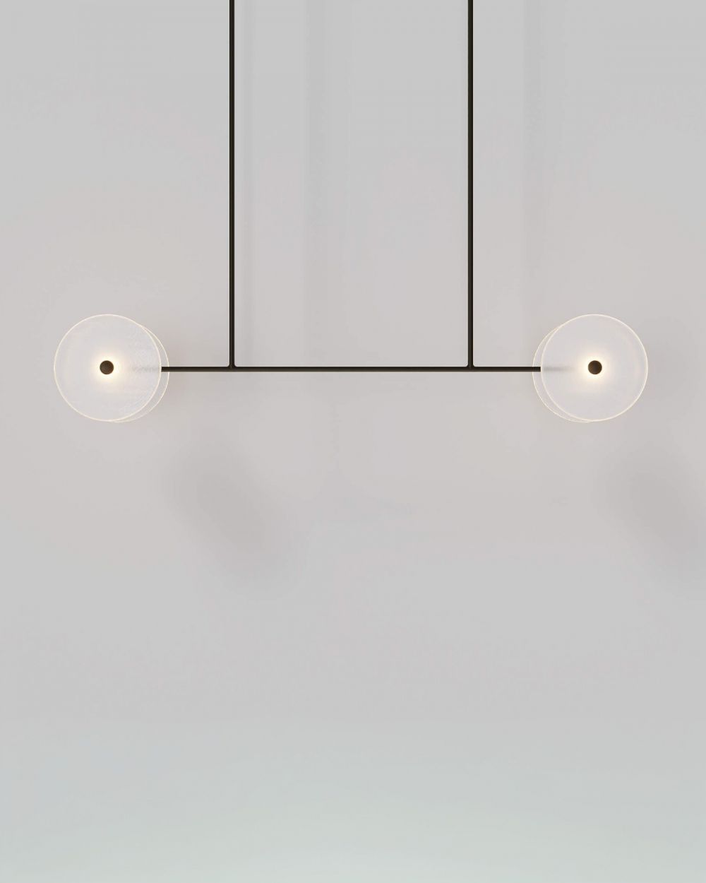Прозрачность как оптика. Стеклянные диски не перекрывают обзор и не создают визуального шума. Они лишь обозначают точки света, парящие в воздухе. Конструкция читается как легкая, почти невесомая, несмотря на внушительную длину.