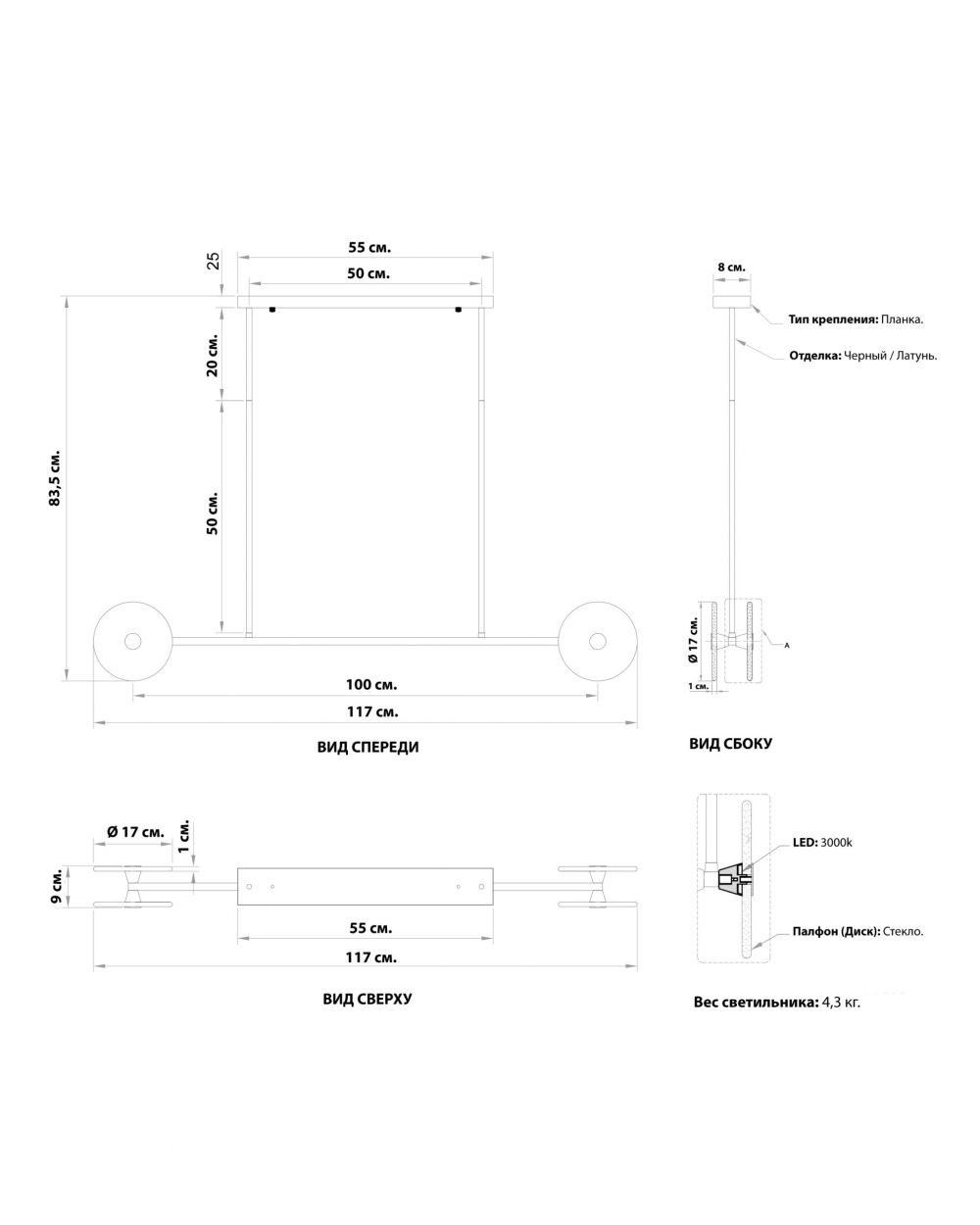 Секрет в масштабе и ритме. Длина 117 см — это ровно то расстояние, которое нужно для полноценного освещения стандартного обеденного стола на 6–8 персон или кухонного острова. Четыре диска распределены равномерно, создавая комфортный шаг и исключая провалы света.