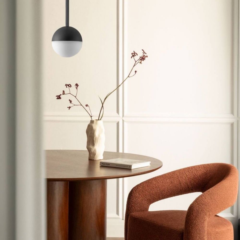 «Уорд» — это идеальный баланс. Белая опаловая сфера рассечена черным металлическим кольцом. Не до конца, а ровно настолько, чтобы создать интригу, объем, глубину. Светильник одновременно и цельный, и разделенный, и классический, и абсолютно современный.
