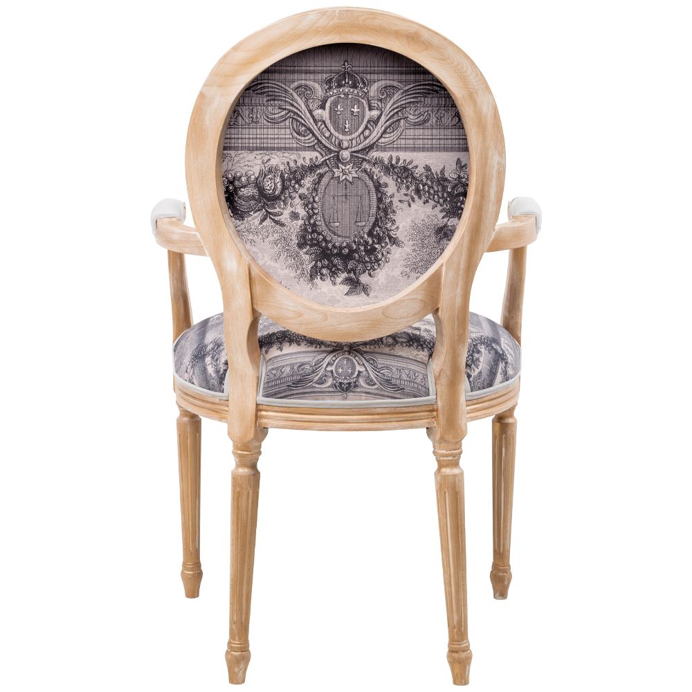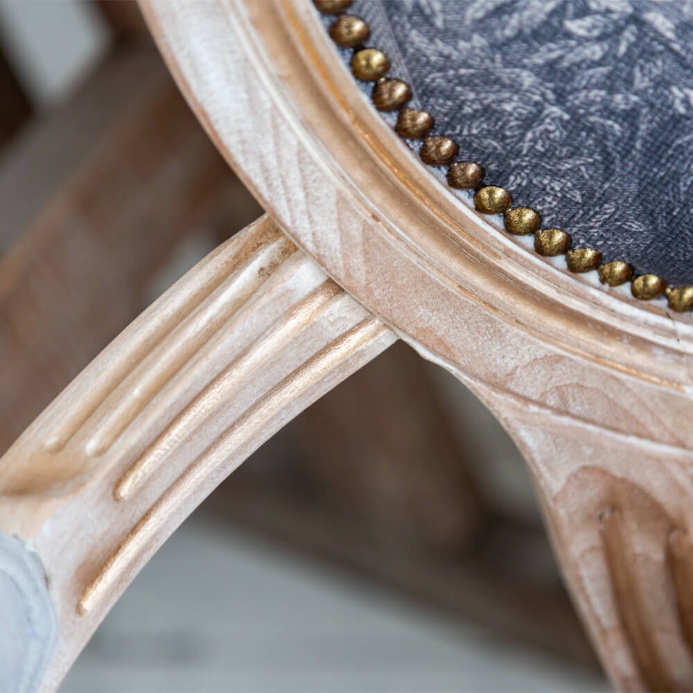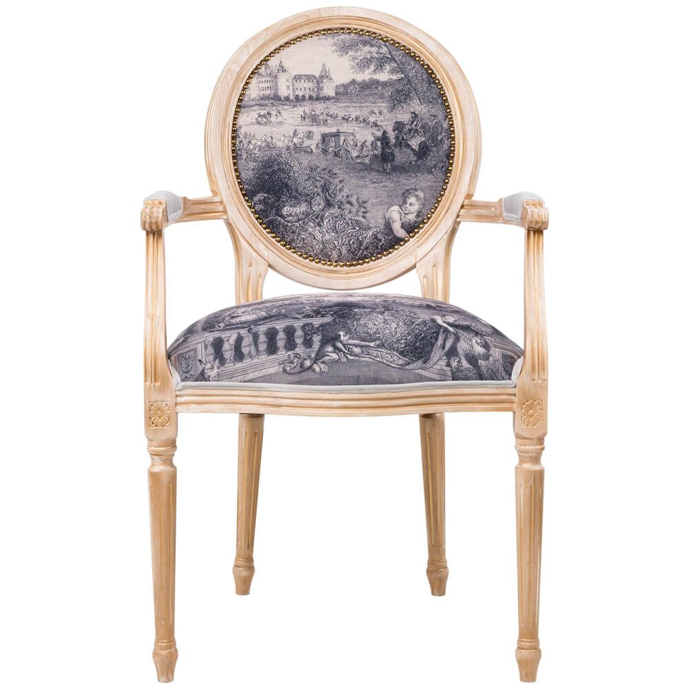 Отличительная черта этой модели — авторский дизайн, поднимающий её над обыденностью. Изголовье украшено уникальным изображением замка Шамбор из коллекции «Дворцовый гороскоп», выполненным в стиле старинной гравюры «гризайль». На оборотной стороне спинки нанесён знак зодиака Весы. Такое оформление превращает кресло в эксклюзивный предмет декора, повествующий об истории и искусстве. Каркас из натурального бука покрыт отделкой «орех с золотой патиной» — благородный оттенок с лёгким сиянием, который гармонично дополняет любую обивку и добавляет интерьеру лёгкости и светоносности.