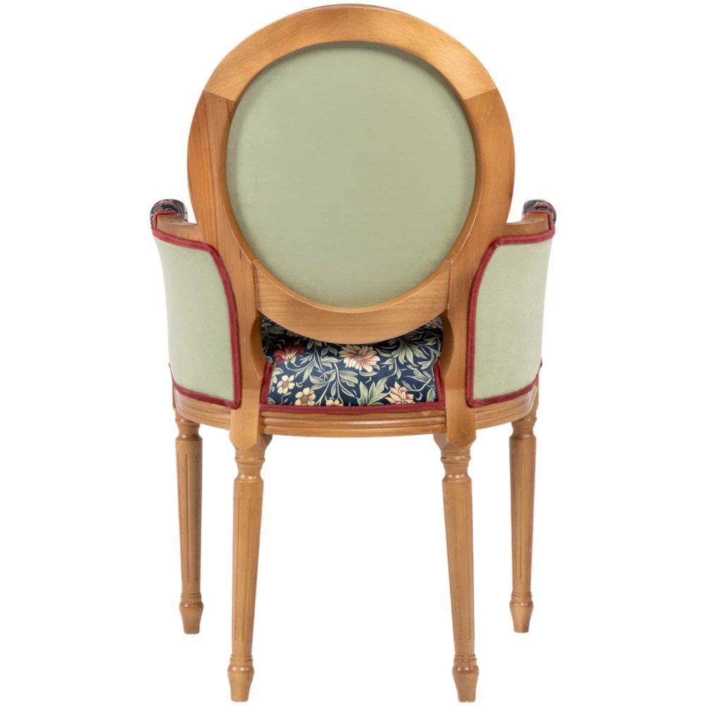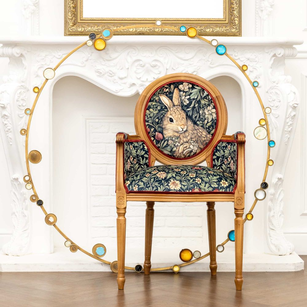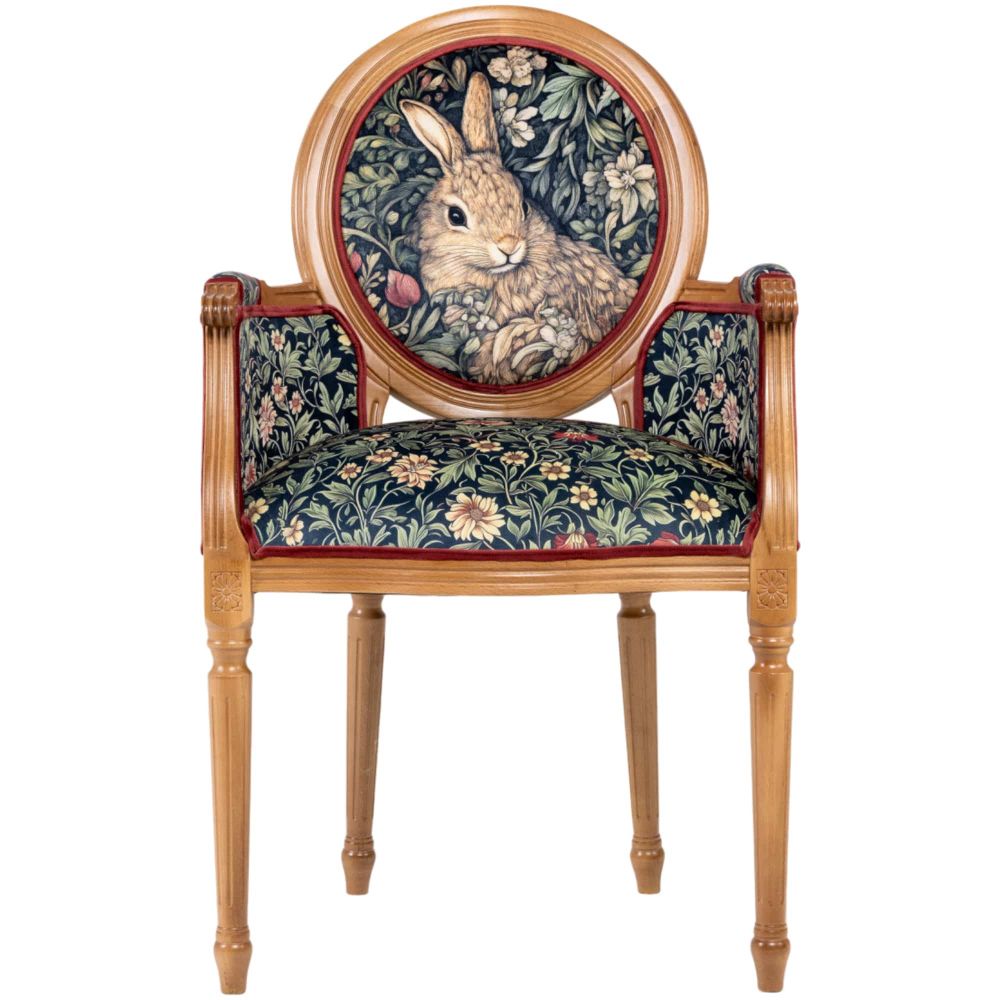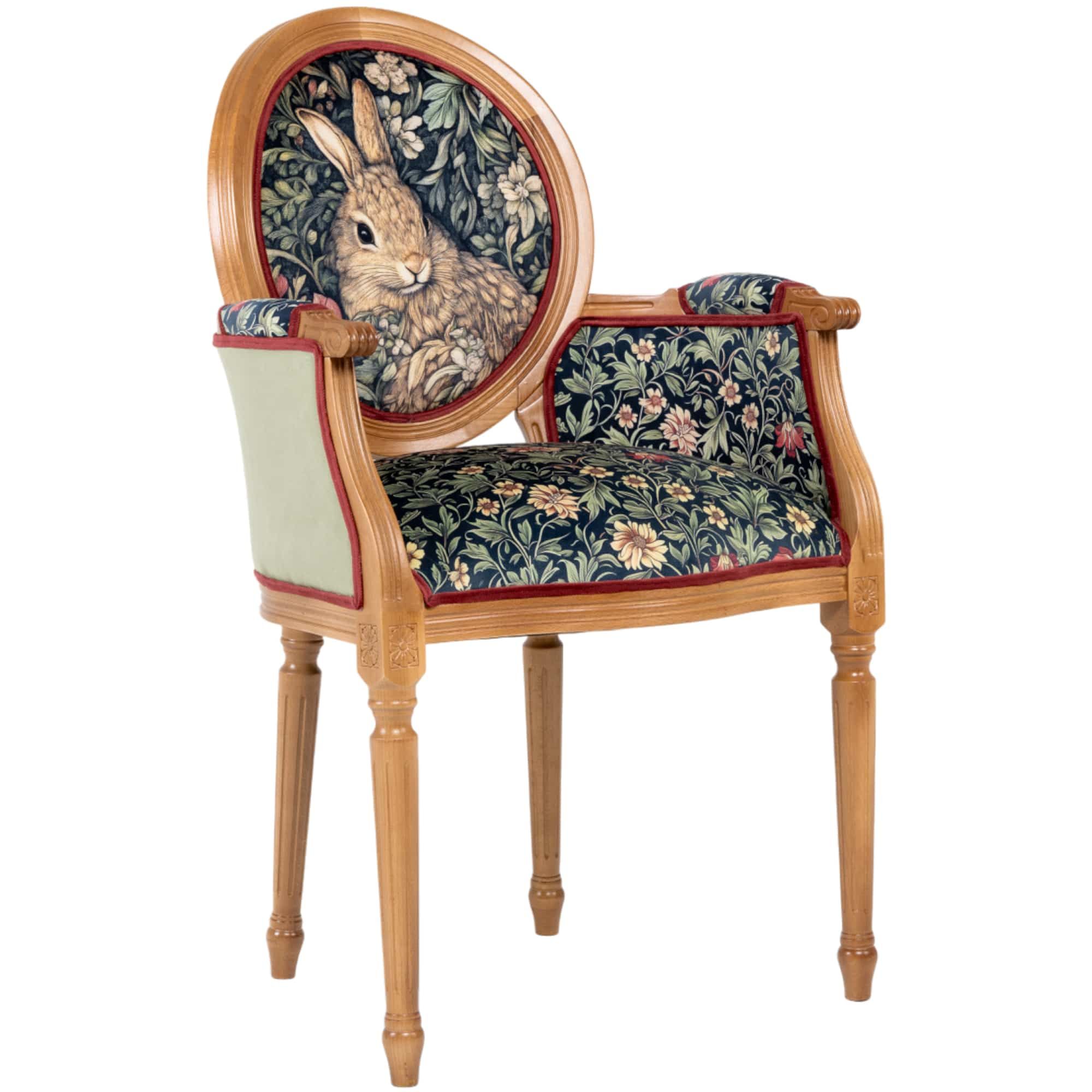Кресло (стул со сплошными подлокотниками) «Бал сказок. Заяц» выделяется своей обивкой, выполненной в узнаваемом стиле, вдохновленном работами Уильяма Морриса. На спинке кресла изображен кролик, спрятавшийся среди красных и белых цветов из сказочного сада. Эта деталь придает креслу игривость и станет украшением любого интерьера. Сиденье украшено природным орнаментом, характерным для стиля Морриса: яркие красные и белые бутоны распускаются на тёмном фоне, переплетаясь с зелёными листьями, создавая впечатление цветущего луга.