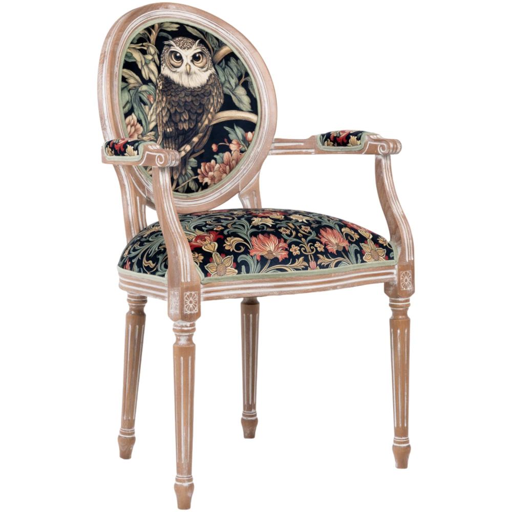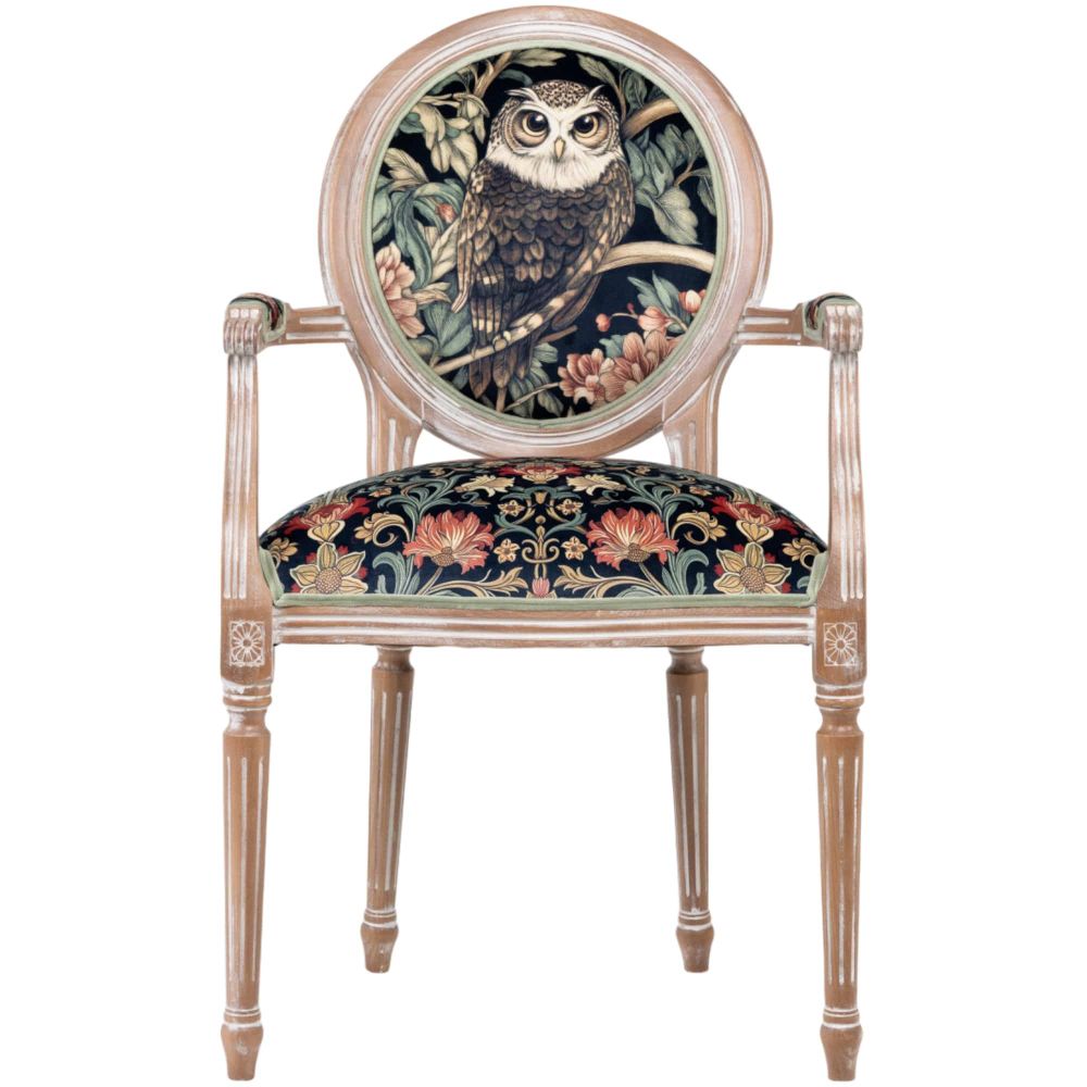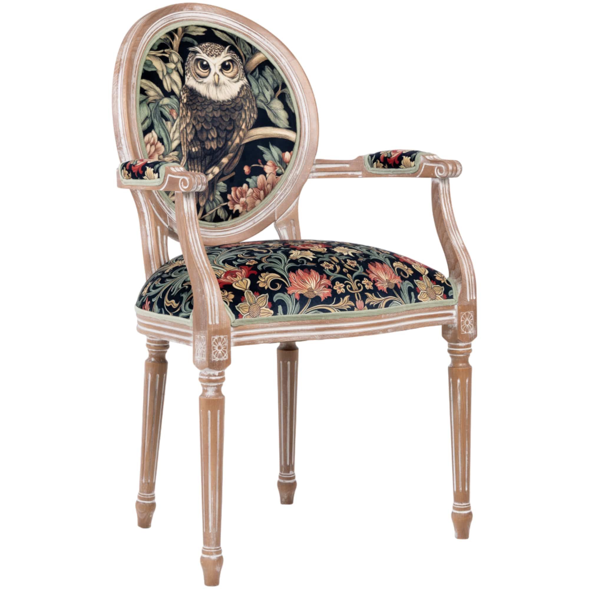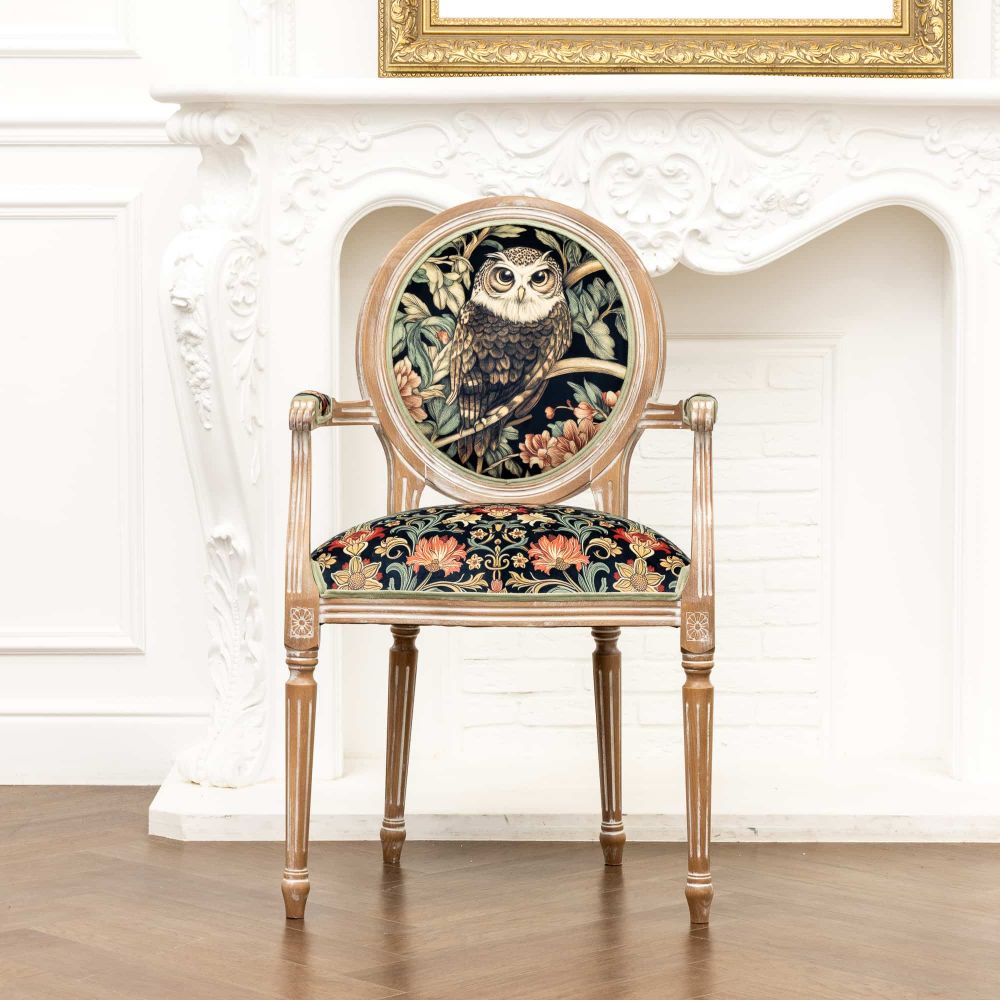 В кресле (стуле с подлокотниками) «Бал сказок. Сова» органично сочетаются функциональность и эстетика, практичность и художественность. Спинка кресла украшена изображением совы, ночной хозяйки лесов, что придает ему особый шарм и загадочность. Сова, символ мудрости и знания, словно оберегает владельца кресла, создавая атмосферу спокойствия и умиротворения.