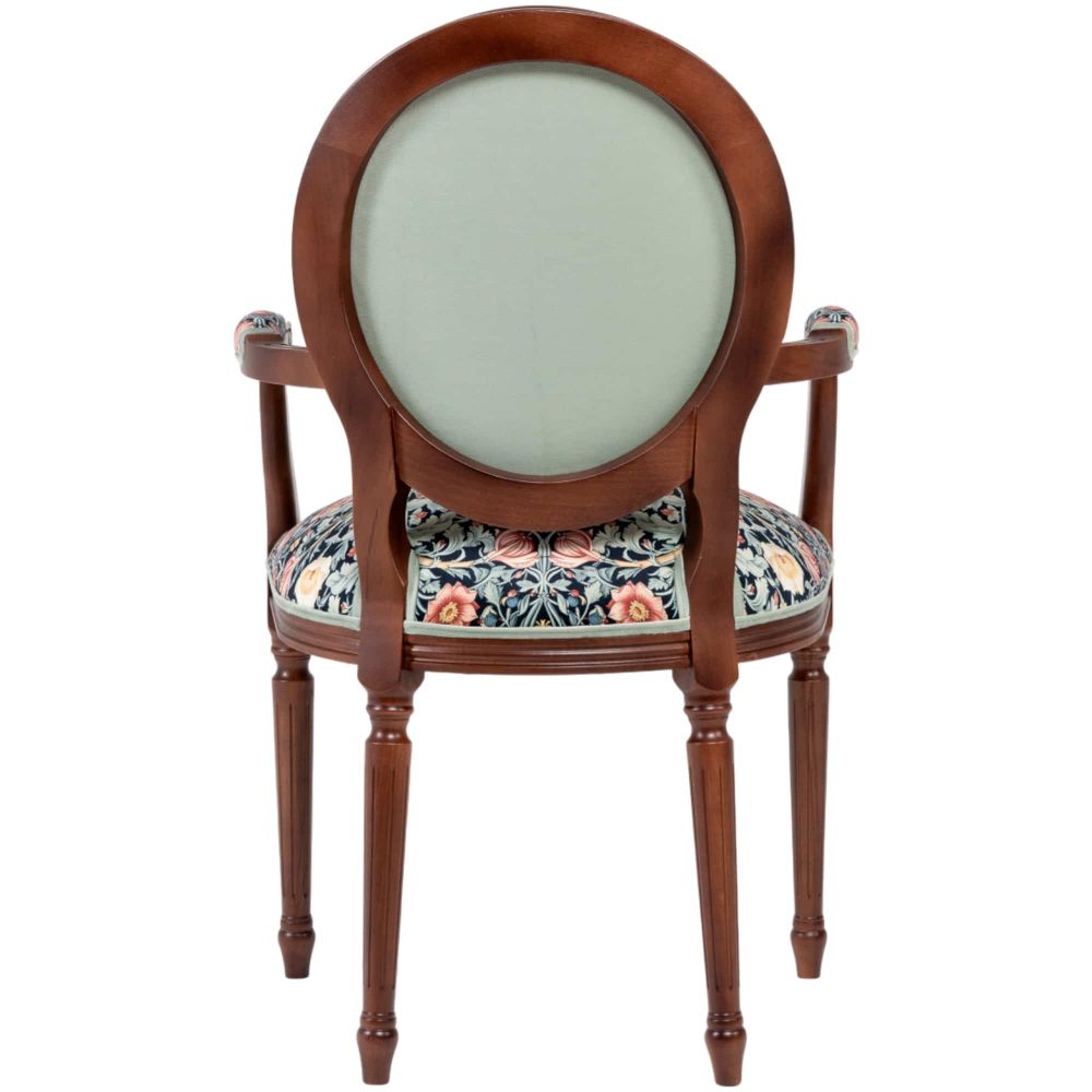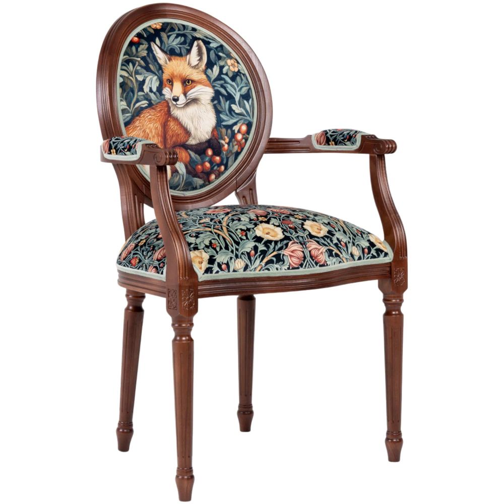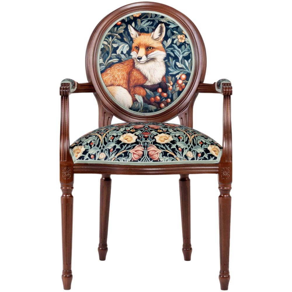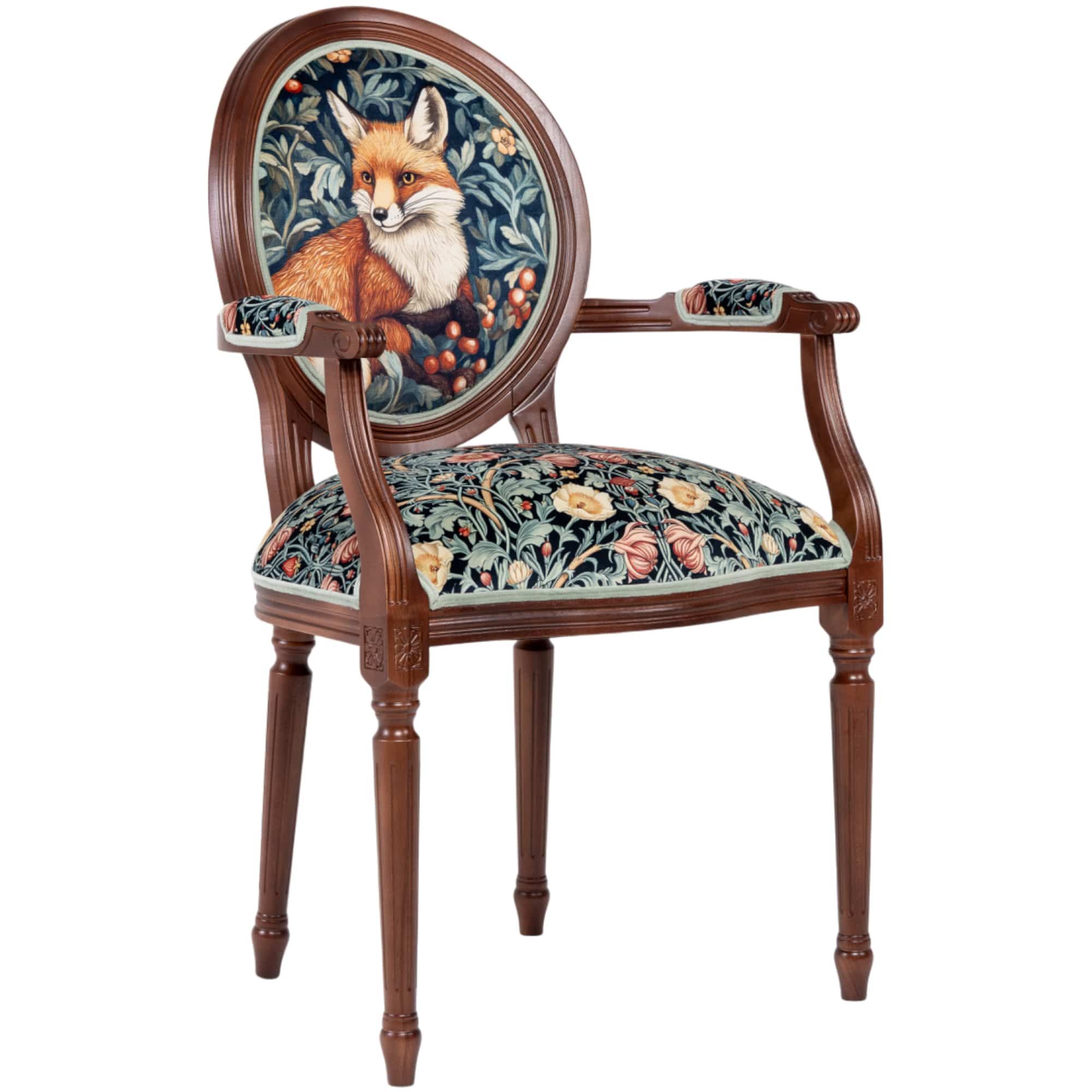 Дизайн кресла (стула с подлокотниками) «Бал сказок. Лиса» акцентирует внимание на обивке, вдохновленной узнаваемыми мотивами Уильяма Морриса. На спинке кресла изображена лиса в окружении рубиновых ягод. Эта деталь придает предмету мебели уникальное очарование, превращая его в выразительный элемент декора. Сиденье украшено характерным для Морриса природным орнаментом: на черном фоне распускаются оригинальные цветы, соединенные зелеными побегами. Данный узор создает ощущение цветущего луга, наполняя пространство гармонией и ощущением свежести.
