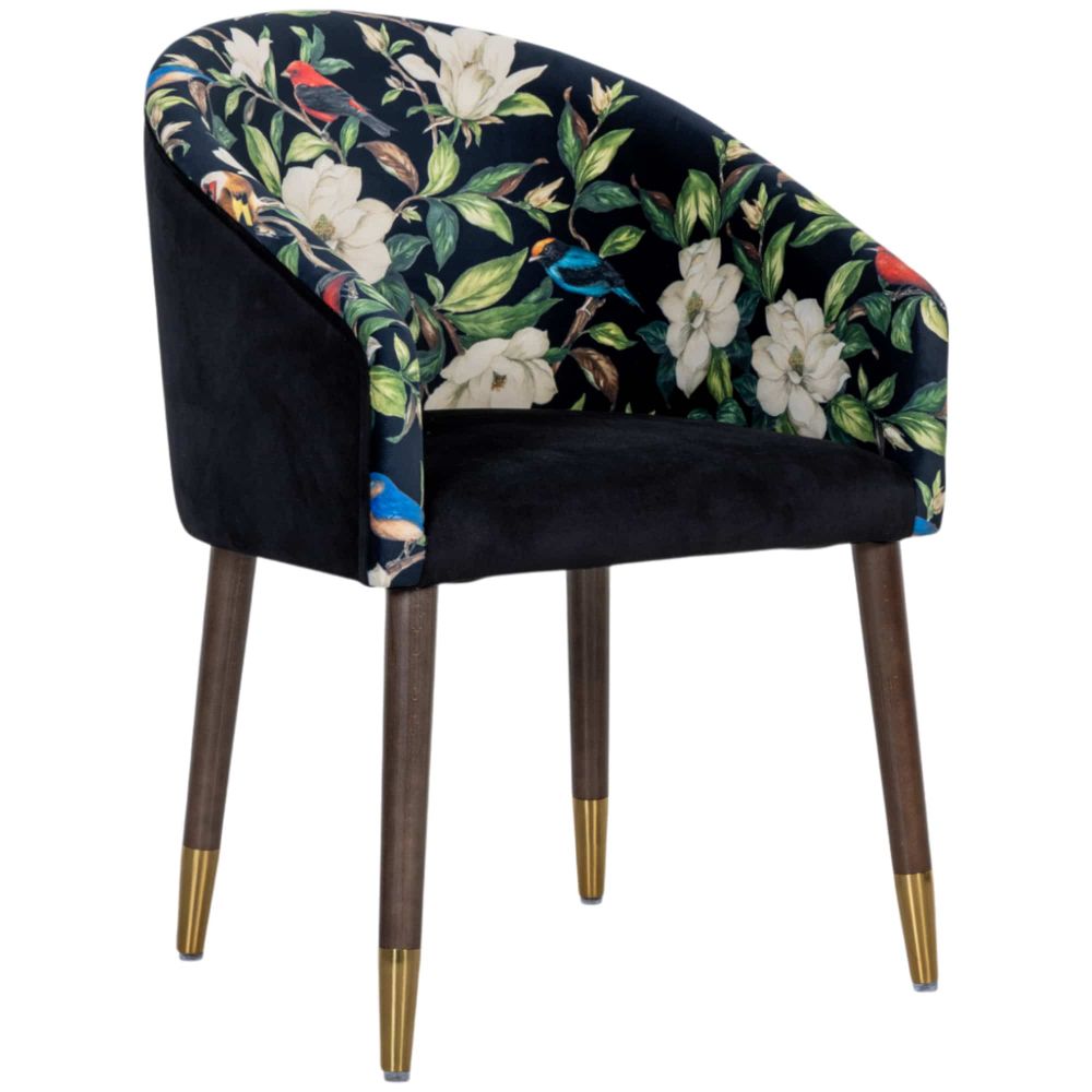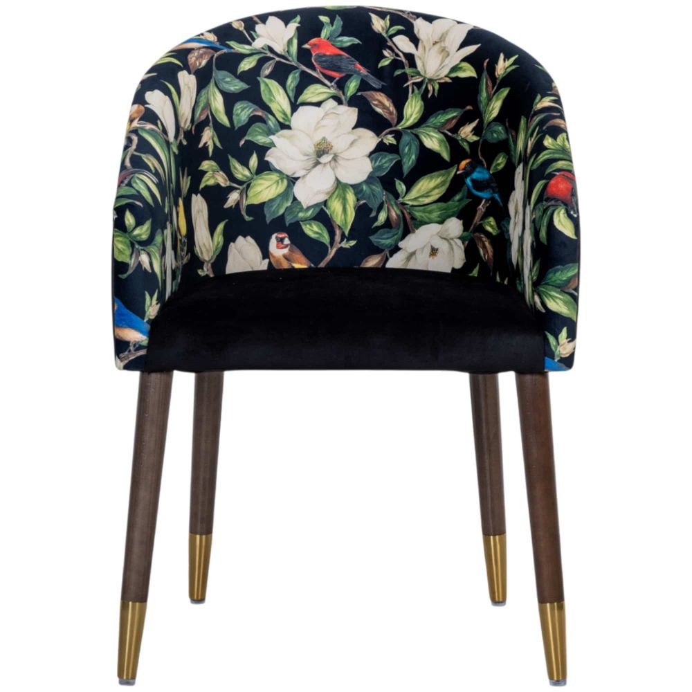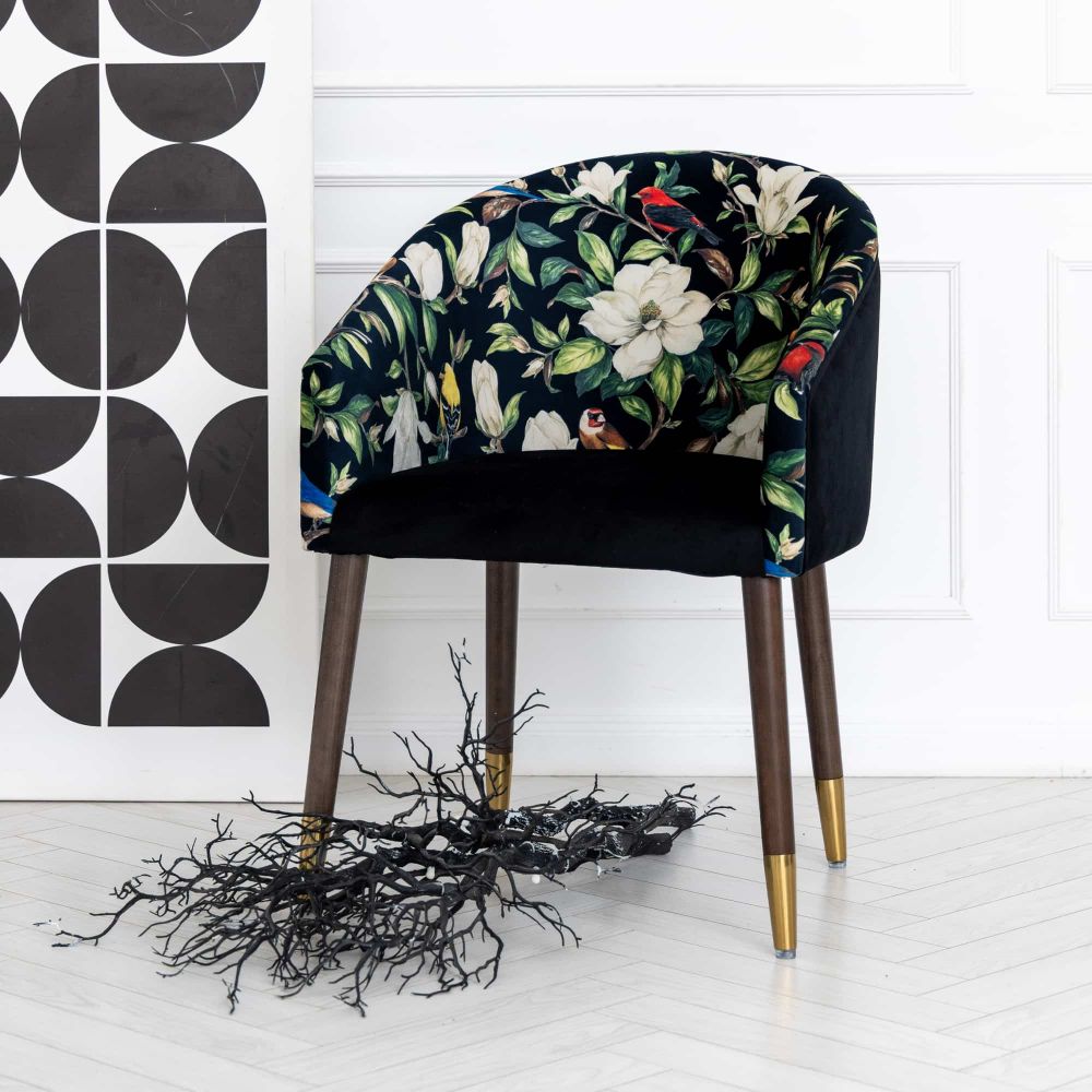 Но стоит заглянуть внутрь – и вы оказываетесь в цветущем саду. Внутренняя поверхность спинки – это взрыв цвета: белые цветы магнолии, сочные зеленые листья и разноцветные экзотические птицы, словно застывшие в полете. Этот контраст создает эффект театральной неожиданности и превращает кресло в настоящий арт-объект. Для сидящего в нем открывается свой, тайный мир красоты.
