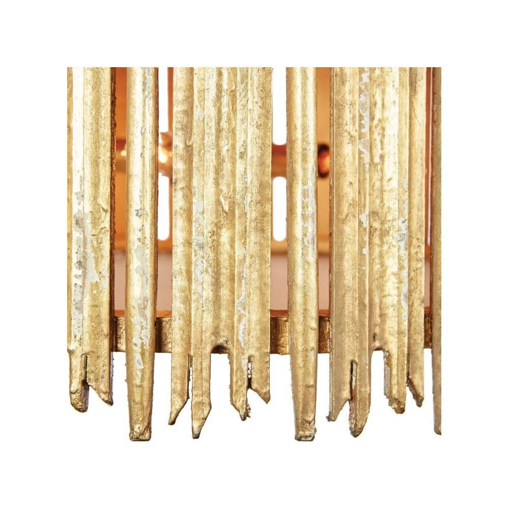 Золотой светильник “Краун” – это подвесной светильник сделан из нерегулярно расположенных деревянных прутьев, в стиле французский кантри. Эффект потёртости и винтажности, который был достигнут в процессе обработки материалов, создаёт ощущение, что этот светильник имеет собственную историю. Он идеально подойдет для тех, кто хочет добавить в интерьер несколько специально состаренных предметов интерьера, которые создают впечатление антиквариата, удачно найденных на блошином рынке, но при этом полностью современным по своему внешнему виду. Этот светильник создан для тех, кто ценит уникальность и хочет добавить в свое пространство нечто особенное, но при этом не потерять атмосферу уюта и теплоты в интерьере. Светильник “Краун” станет прекрасным решением для различных зон вашего дома: он украсит кухню, столовую, гостиную, прихожую.
