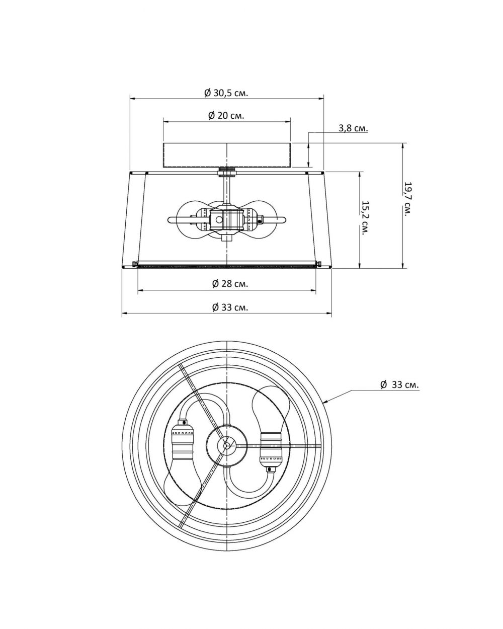 Размеры: Диаметр 33 см — оптимальный вариант для небольших и средних помещений (кухня, спальня, прихожая, детская). Компактность позволяет размещать светильник даже в узких коридорах.