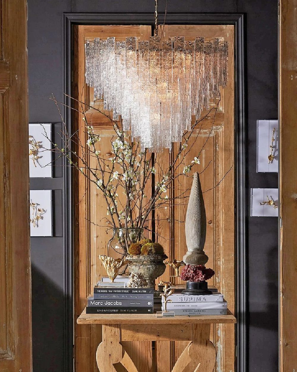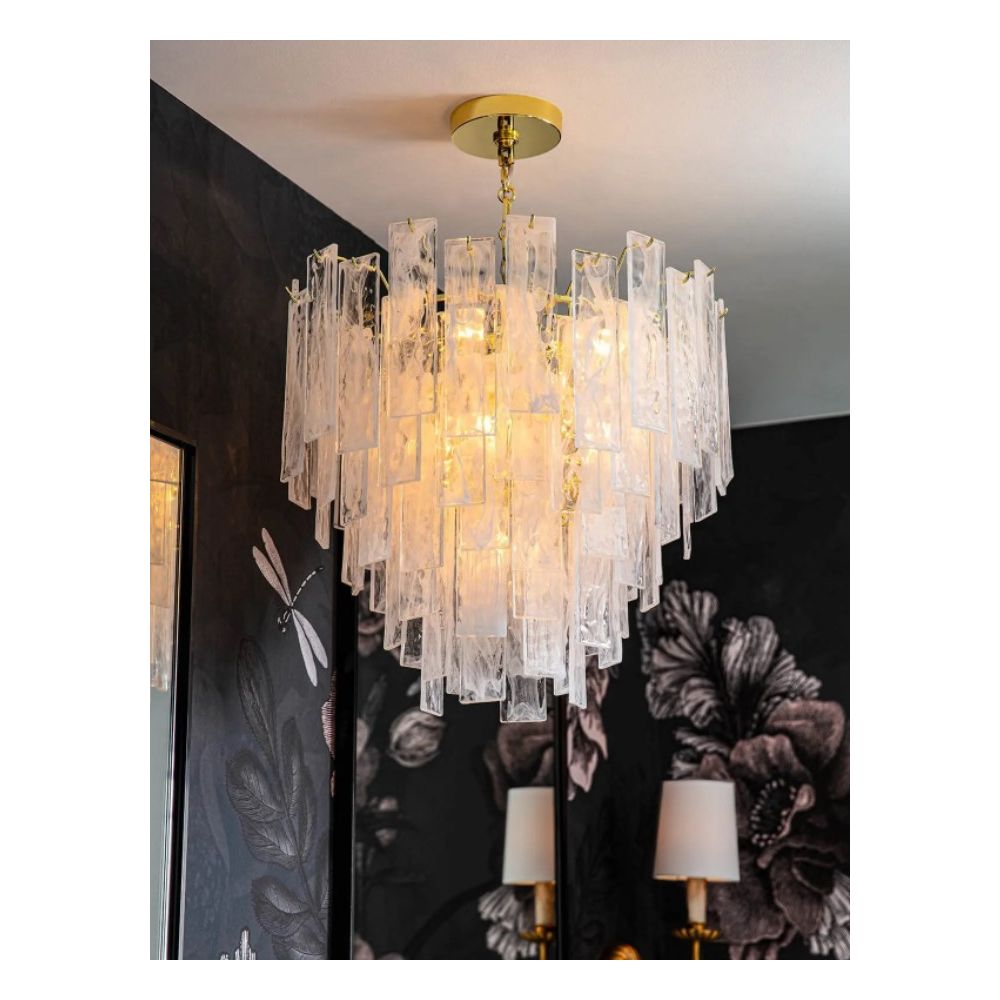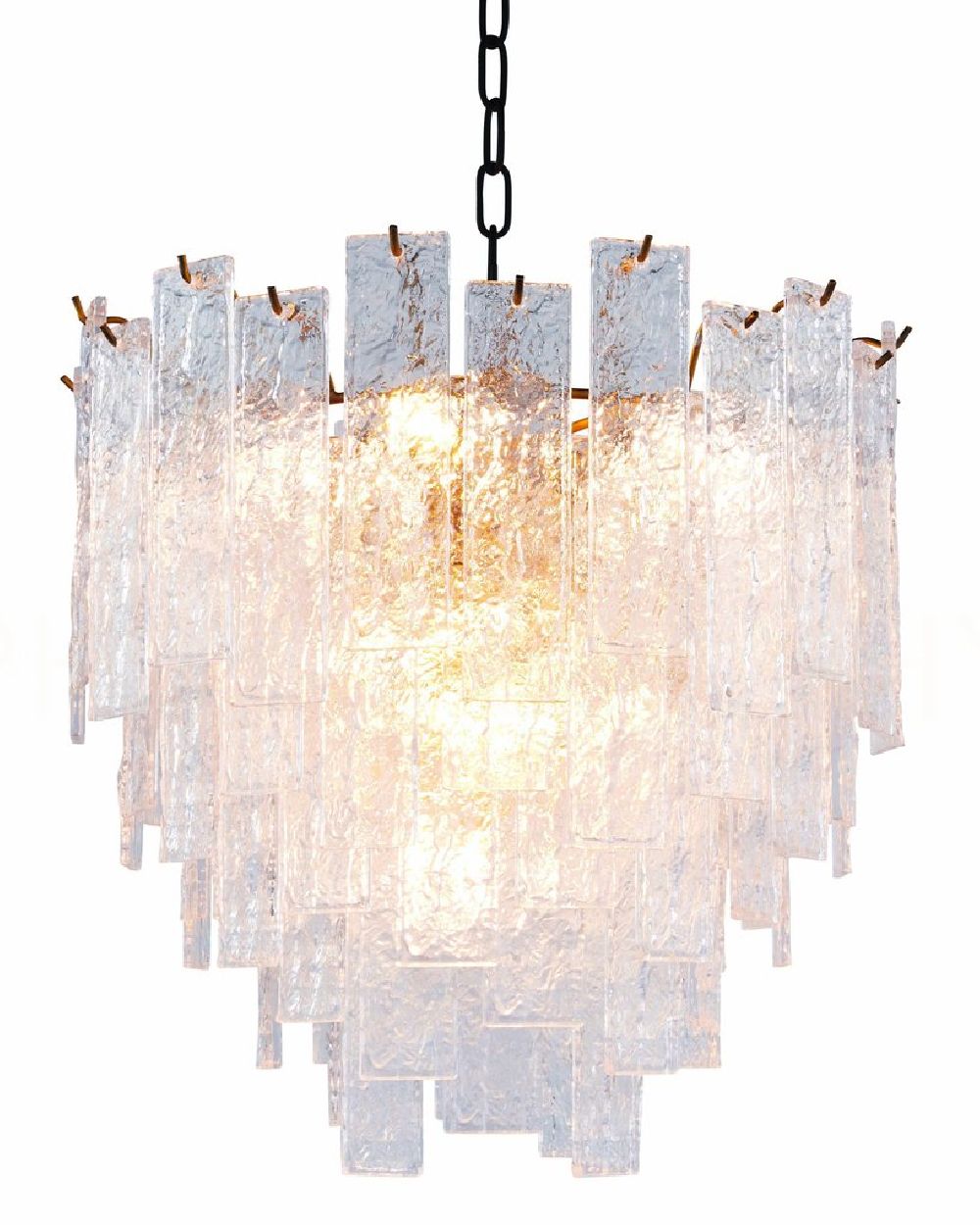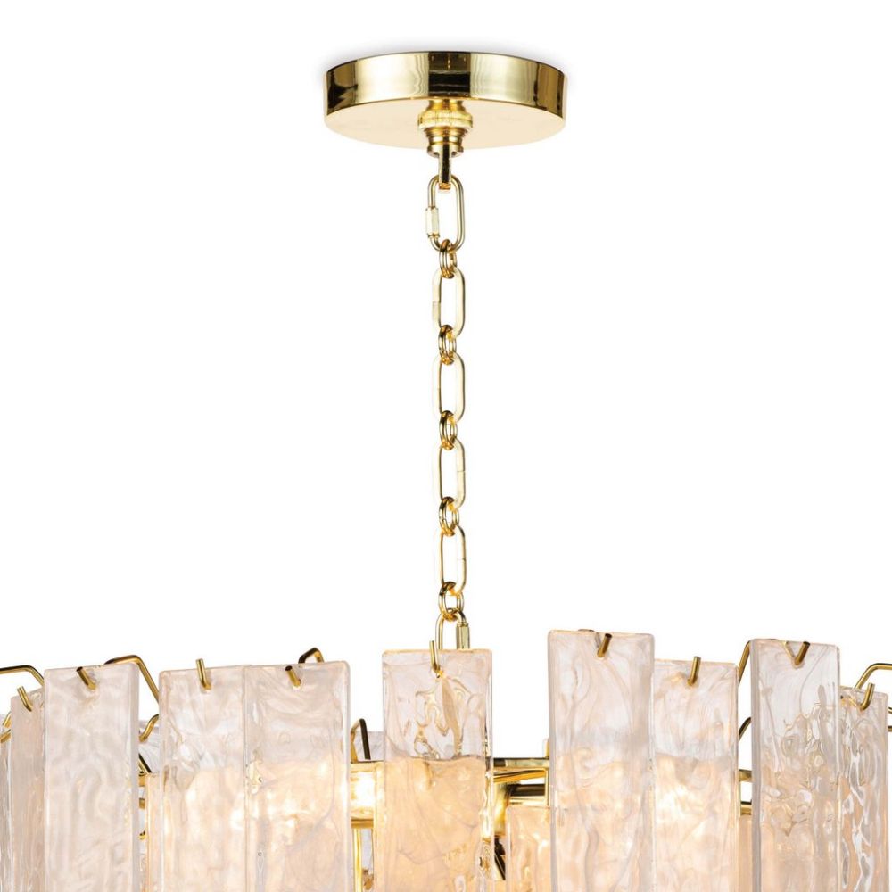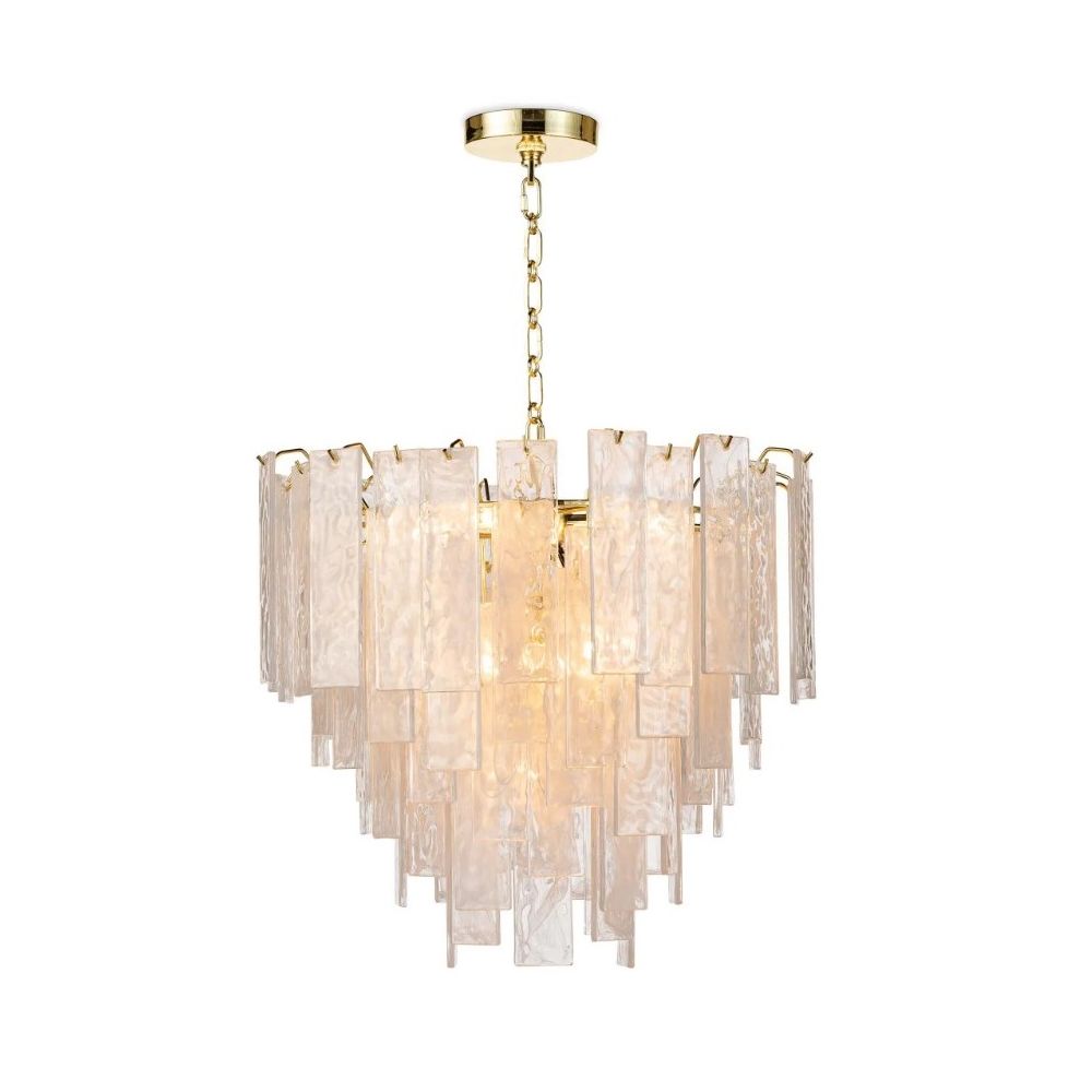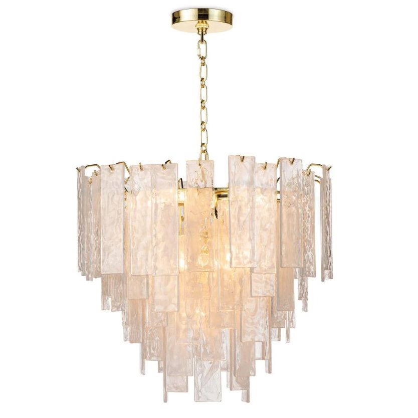 Золотая люстра “Рейнар” – это светильник представляет собой композицию из пяти ярусов прозрачных стеклянных пластин, аккуратно собранных вместе, создавая впечатляющий эффект динамичного движения. Главной особенностью люстры “Рейнар” является использование волнистого стекла, которое не только прекрасно рассеивает свет, но и придает особую мягкость светящемуся эффекту. Это делает освещение помещения более приятным и уютным, создавая атмосферу тепла и комфорта. Отделка в цветовой гамме – латунь, добавляет изысканности и стиля этой люстре. Золотистый в сочетании с прозрачностью стекла создает игру света и тени, что придает интерьеру особую глубину и изысканность. Размеры и форма люстры “Рейнар” делают ее идеальным выбором для различных помещений. Ее прекрасно можно установить в прихожей, создавая великолепный первый впечатление для гостей, или в гостиной, чтобы придать пространству элегантный и изысканный вид.