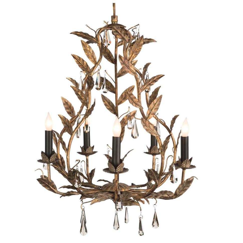 Рустикальная люстра “Адриана” – это изысканное и элегантное осветительное устройство, которое станет прекрасным дополнением к дизайну вашего помещения. Она имеет грушевидную форму, что создает уникальное сочетание классического и эстетического стиля. Отделка люстры выполнена в золотом цвете с легким эффектом античности, который придает ей особый благородный вид. Центральная часть люстры украшена элементами в виде листьев и прозрачными хрустальными декоративными каплями, которые подчеркивают ее уникальный стиль. У нее есть пять ламп, которые обеспечивают яркое и достаточное освещение для помещений разных размеров. С ее рустикальным и флористическим дизайном, она идеально впишется в стили, такие как классический или загородный интерьеры. Она будет прекрасным дополнением для гостиной, столовой или спальни.