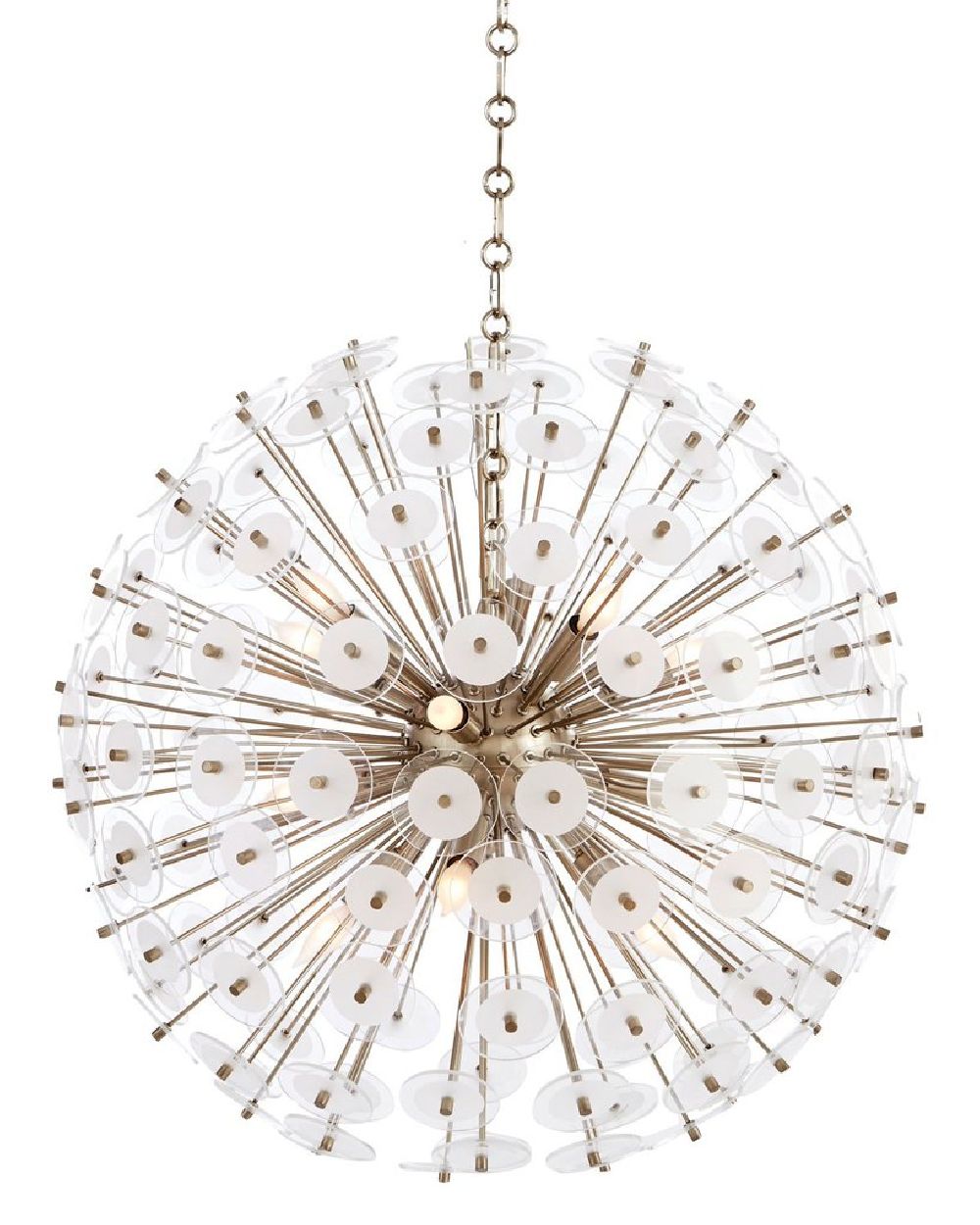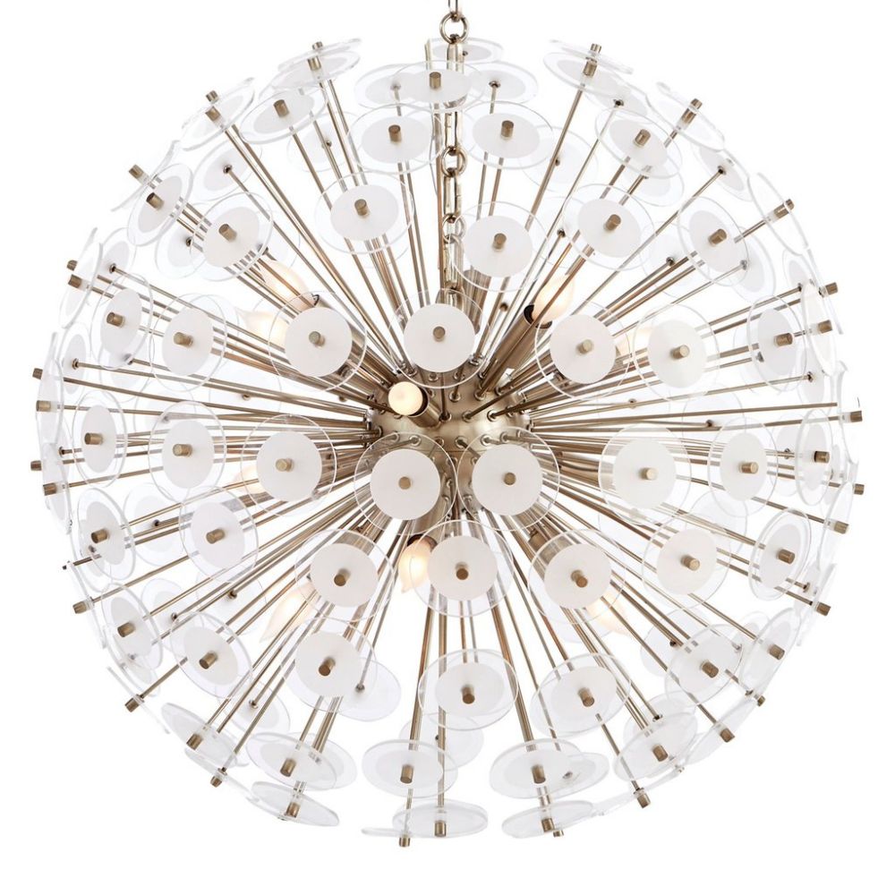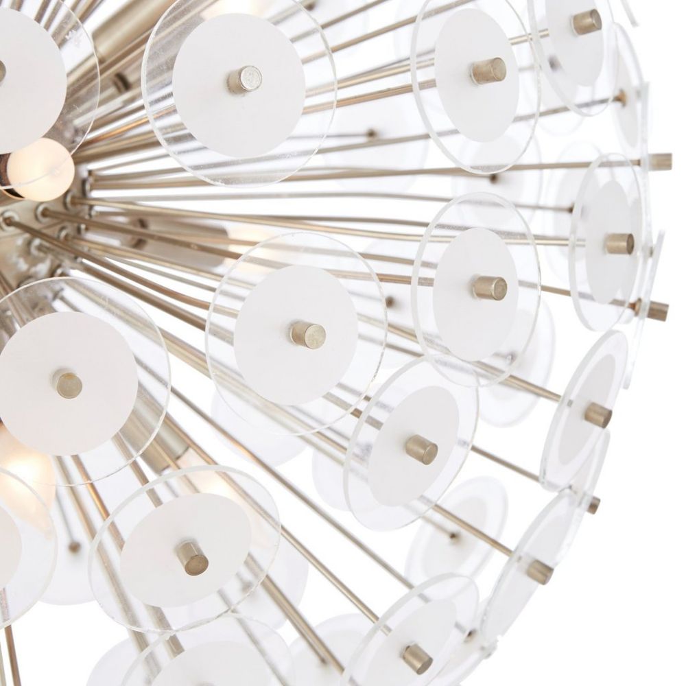 Люстра спутник “Девон” – это круглая люстра с тонкими и изящные серебряными стержнями, которые создают эффект легкости и просвечивают сквозь повторяющиеся круглые стеклянные лепестки, добавляя сияющий эффект всей конструкции. Благодаря этому, свет от люстры распространяется равномерно, а отражения света создают неповторимую атмосферу уюта и тепла. Ее элегантная архитектура и форма делают ее идеальной для различных помещений, особенно гостиной и спальни. Без сомнения, она станет ярким украшением вашего потолка!