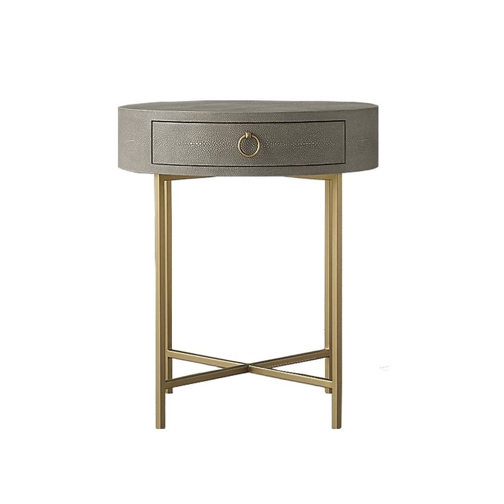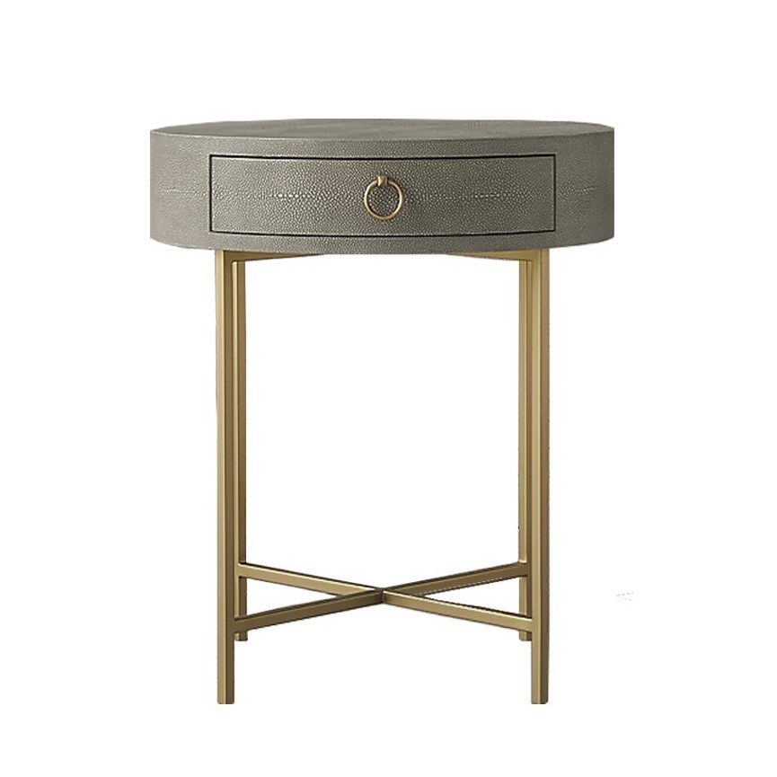 Серая прикроватная тумба “Айрин” – стильное и элегантное решение для вашей спальни. Ее сдержанные формы и изысканные детали делают ее идеальным дополнением к любому интерьеру. Тумба имеет круглую столешницу, которая целиком отделана серой кожей с точным воспроизведением текстуры и рисунка натуральной шкуры ската. Это добавляет изделию оригинальности и вневременного стиля. Ножки в тёплой цветовой гамме – латунь, придают тумбе изысканный и завершающий штрих. Эта тумба не только эстетически привлекательна, но и функциональна. Она предлагает удобное пространство для хранения рядом с вашей кроватью. Вы можете разместить на ней светильник, будильник, книгу или другие предметы, которые вы хотите иметь под рукой во время сна или перед сном. Серая прикроватная тумба “Айрин” также будет идеально сочетается с другими предметами мебели в вашей спальне. Ее нейтральный цвет и классический дизайн позволяют легко интегрировать ее в любой интерьерный стиль.
