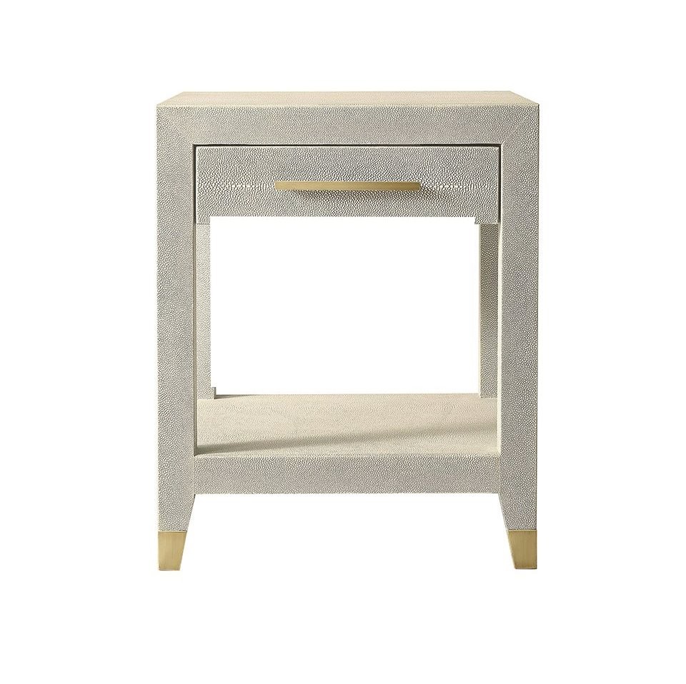 Серая прикроватная тумба “Кларенс” — это элегантный и стильный элемент для спальни, который станет акцентом вашего интерьера. Ее квадратная столешница, обтянутая серой кожей с точным воспроизведением текстуры и рисунка натуральной шкуры ската, создает уникальный и роскошный визуальный эффект. Зауженные ножки из теплой латуни придают тумбе легкость и утонченность, а также завершают её изысканный образ. “Кларенс” сочетает в себе практичность и элегантность, обеспечивая не только удобное место для хранения, но и добавляя в интерьер элемент настоящей роскоши.