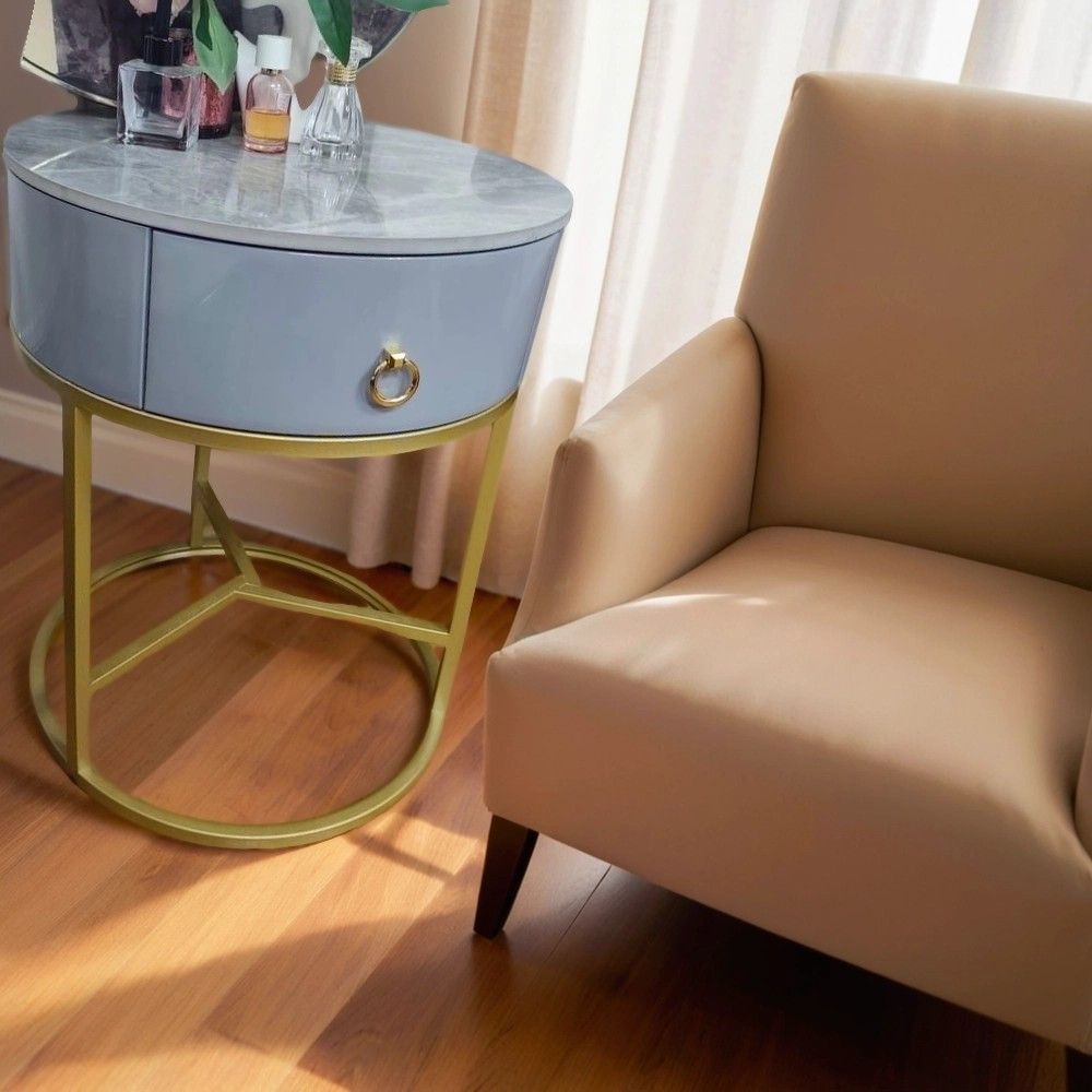 Прикроватная тумба Кирко - это стильное и функциональное решение для вашей спальни. Изготовлена из прочного металлического каркаса, который обеспечивает надежную поддержку и долговечность. Столешница выполнена из искусственного мрамора, добавляющего шик и элегантность.