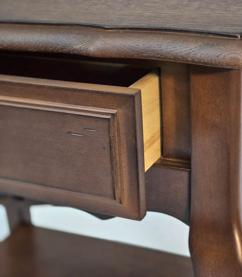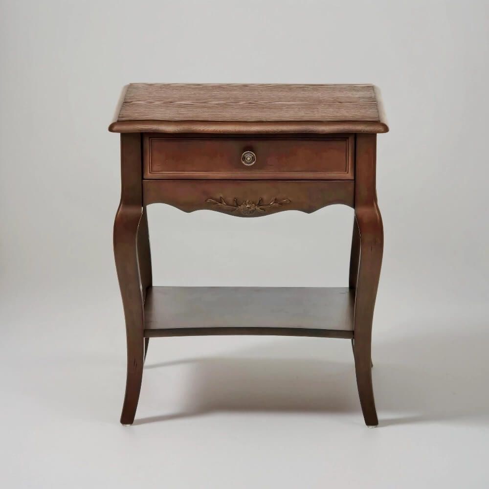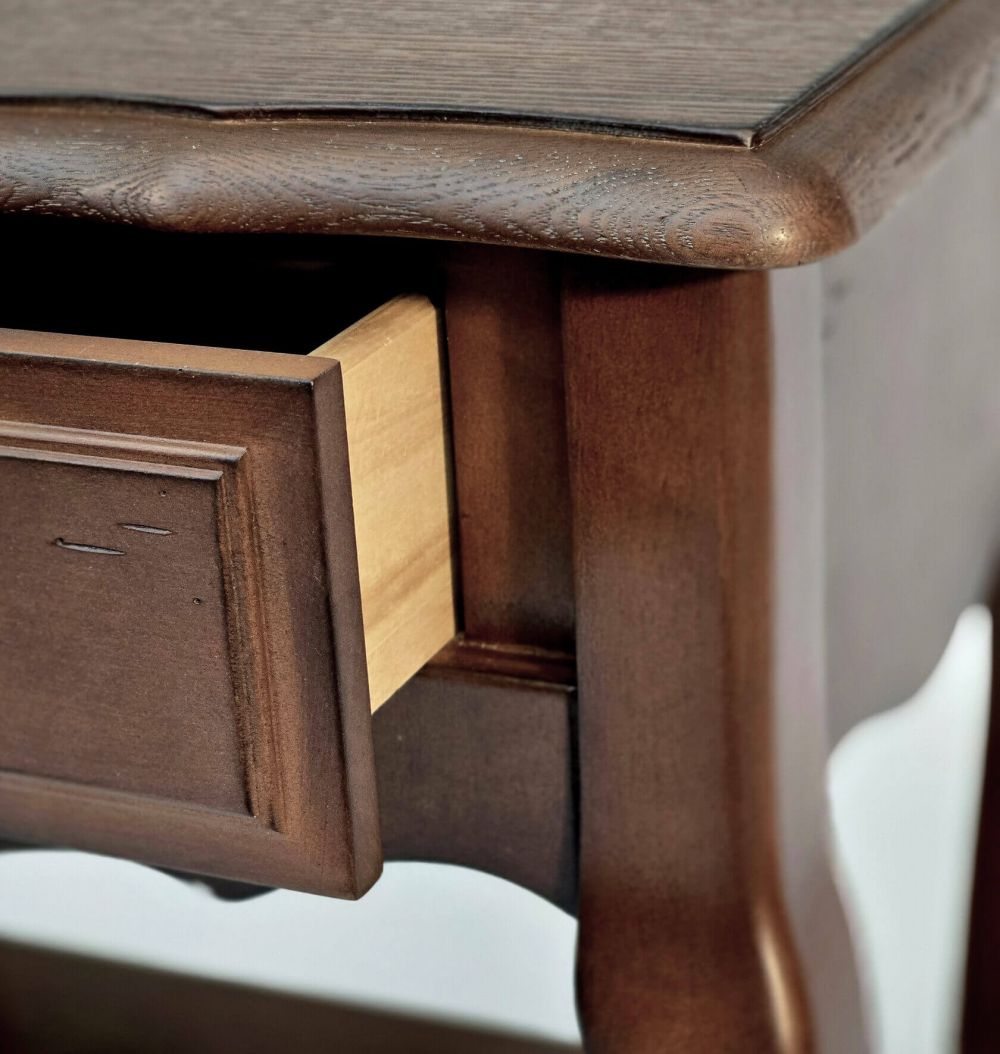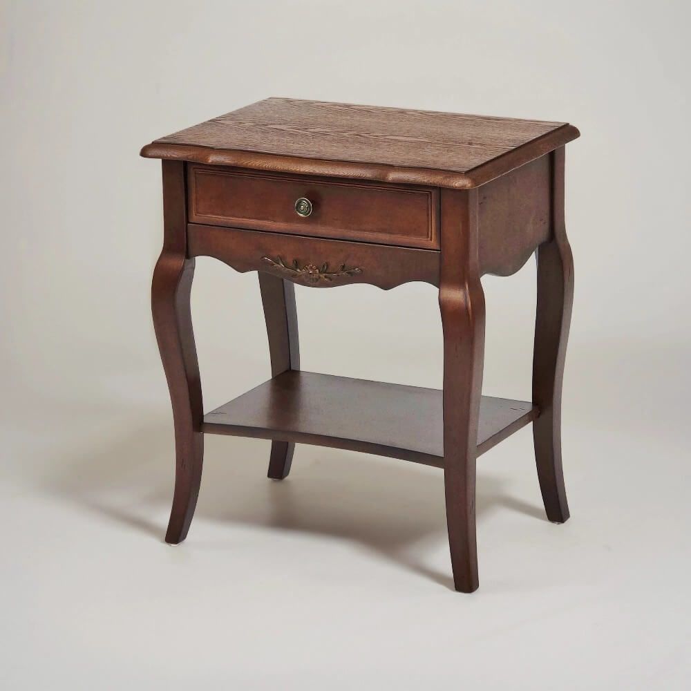 Эта прикроватная тумба воплощает эстетику Прованса с редкой достоверностью. Отделка «итальянский орех с эффектом старения» создает ощущение, что предмет хранит историю нескольких поколений. Состаренная древесина с благородной патиной, винтажные нотки и теплый, глубокий оттенок ореха делают эту тумбу не просто местом для хранения, а самостоятельным декоративным элементом.