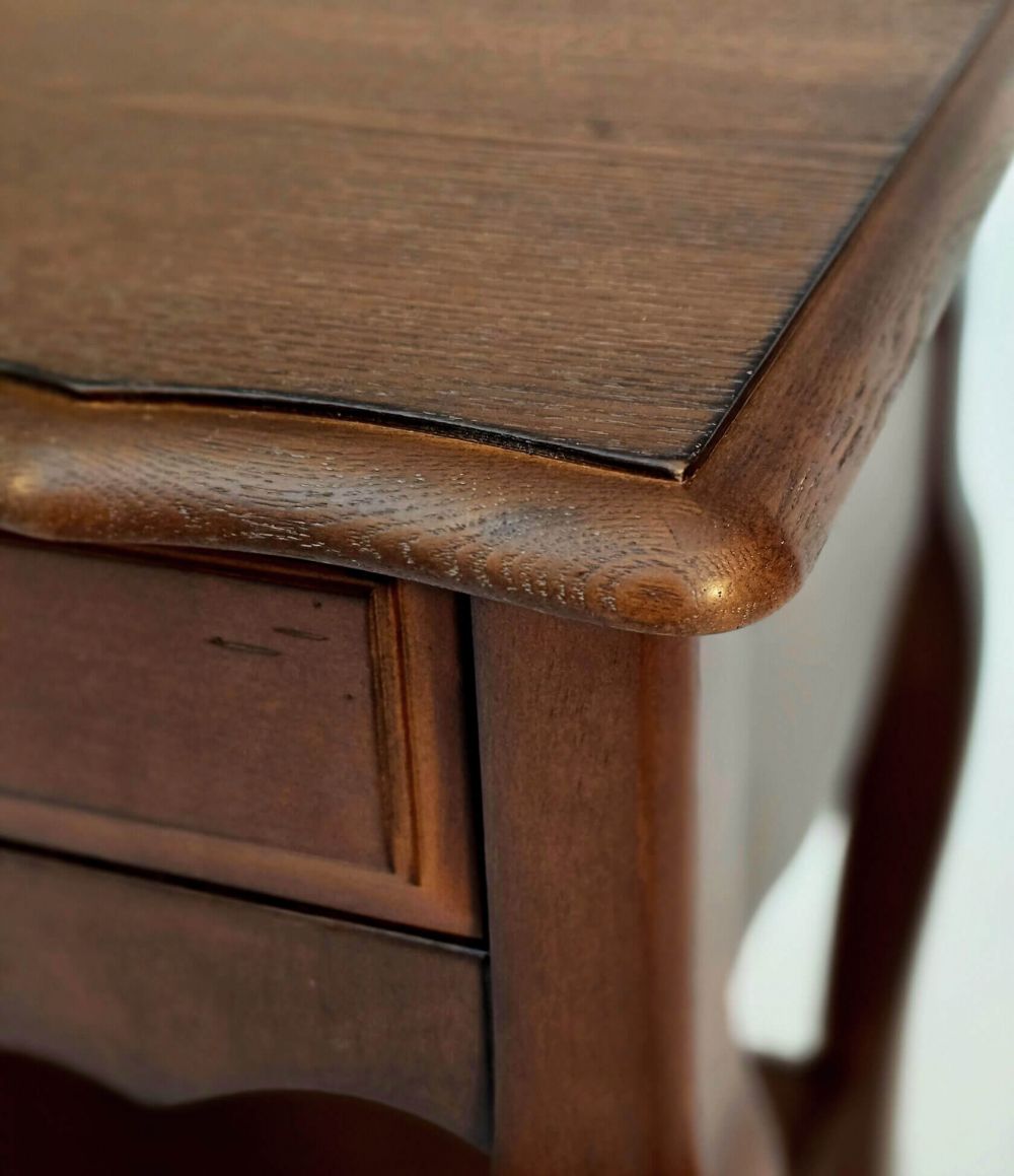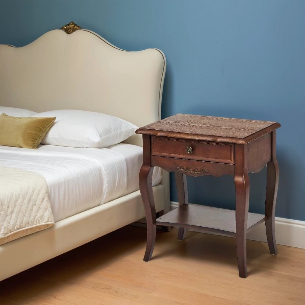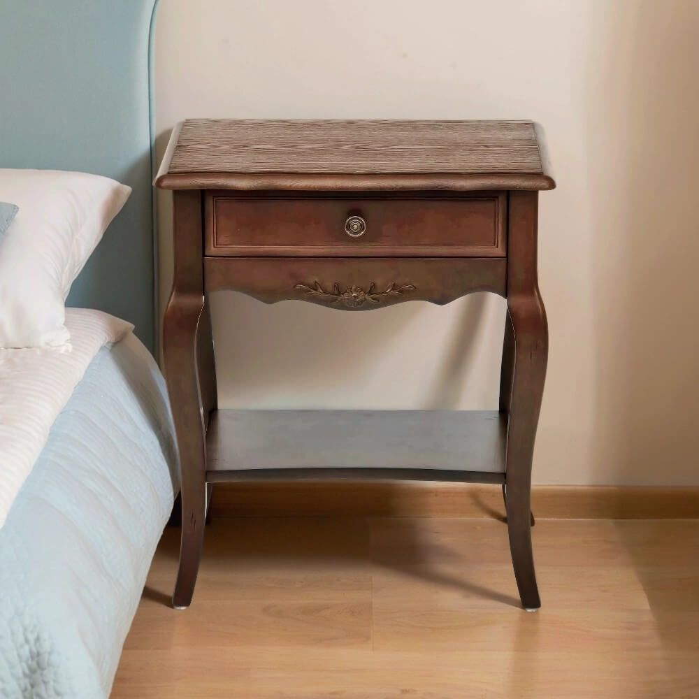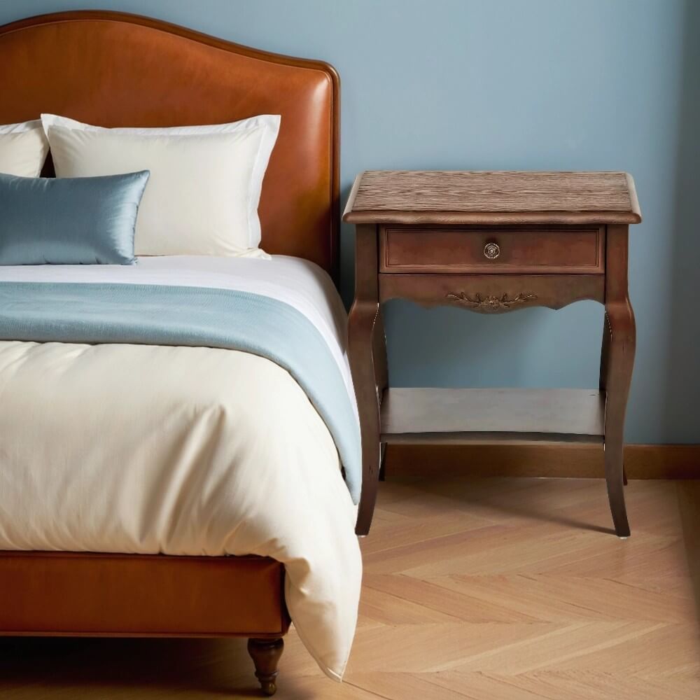 Эта прикроватная тумба воплощает эстетику Прованса с редкой достоверностью. Отделка «итальянский орех с эффектом старения» создает ощущение, что предмет хранит историю нескольких поколений. Состаренная древесина с благородной патиной, винтажные нотки и теплый, глубокий оттенок ореха делают эту тумбу не просто местом для хранения, а самостоятельным декоративным элементом.