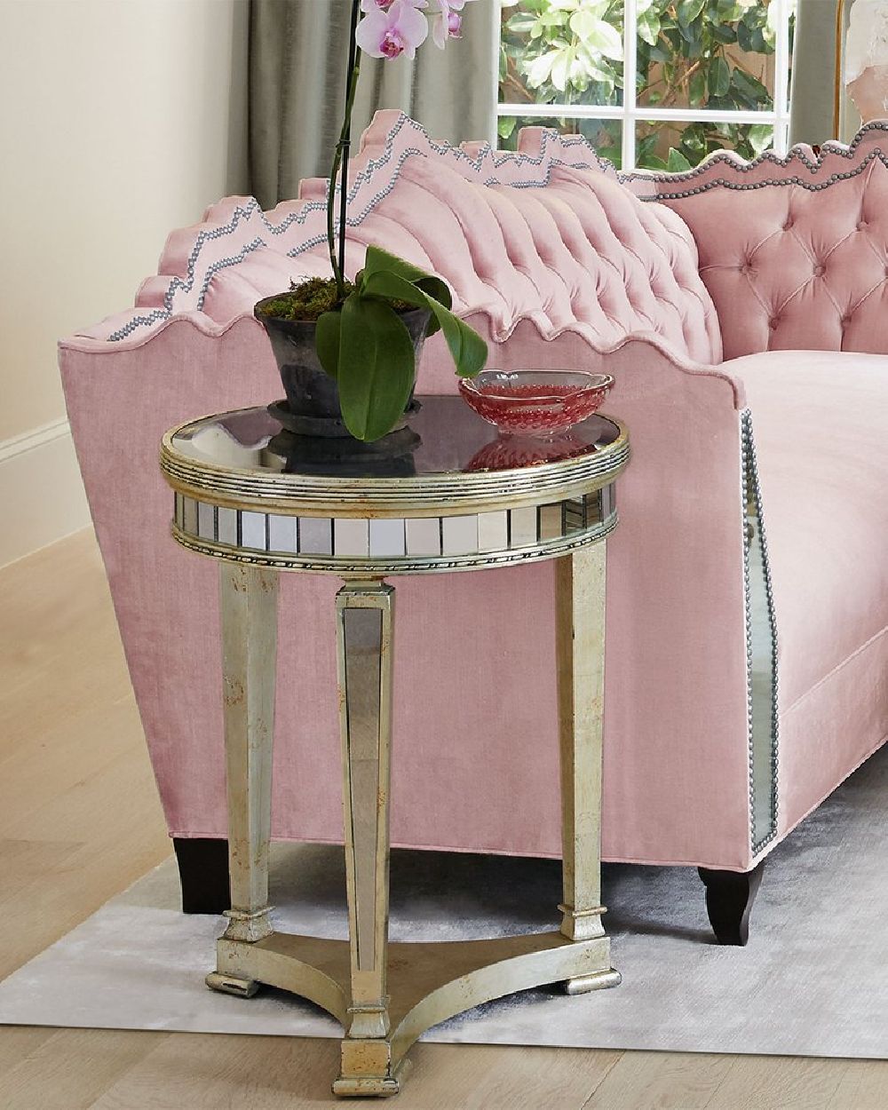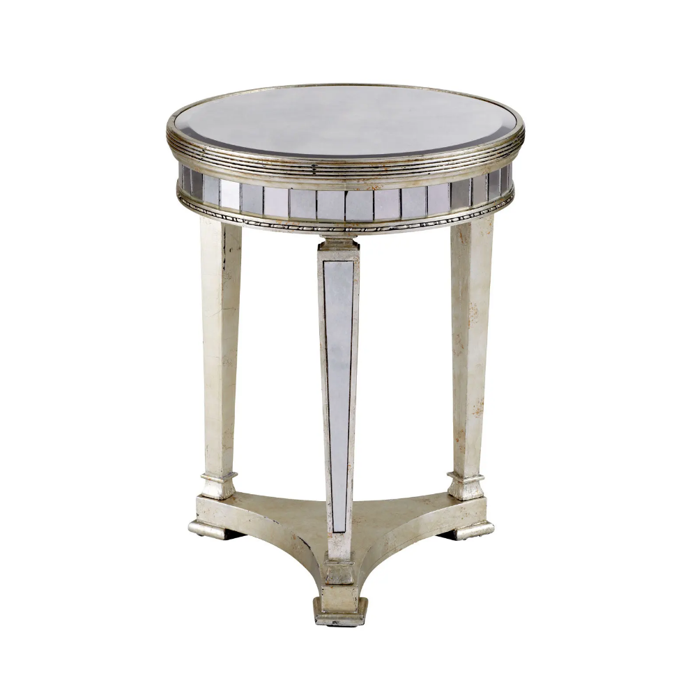 Круглый приставной стол “Карсон” – это предмет интерьера, который сочетает классическую форму с эффектом благородного старения. Круглая зеркальная столешница с патиной создаёт атмосферу античного шика. Прямоугольные зеркальные панели по борту добавляют объём и глубину композиции. Серебристая отделка придаёт изделию налёт времени и аристократизма. Отражения в зеркальных поверхностях играют со светом, наполняя пространство динамикой. Компактные размеры делают стол идеальным для гостиных в стиле неоклассика или ар-деко. “Карсон” станет изысканным акцентом, сочетающим функциональность и художественную ценность.